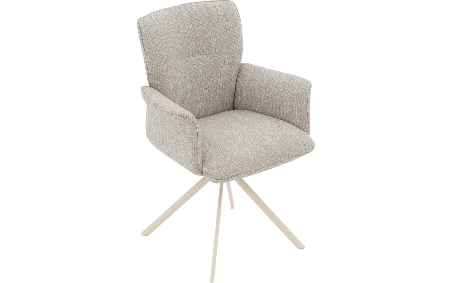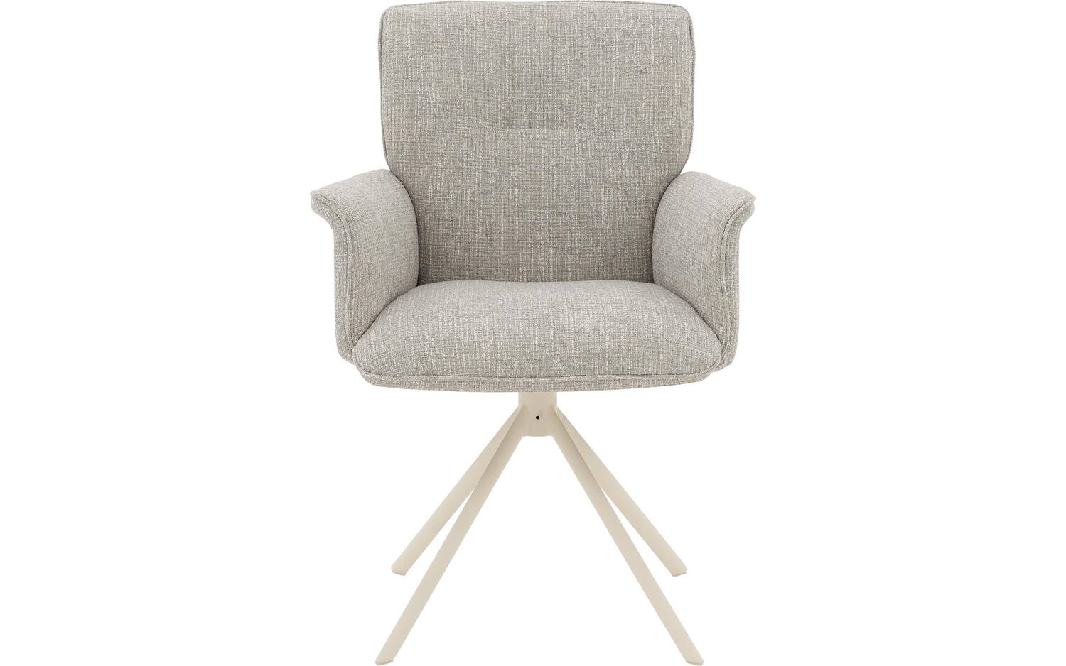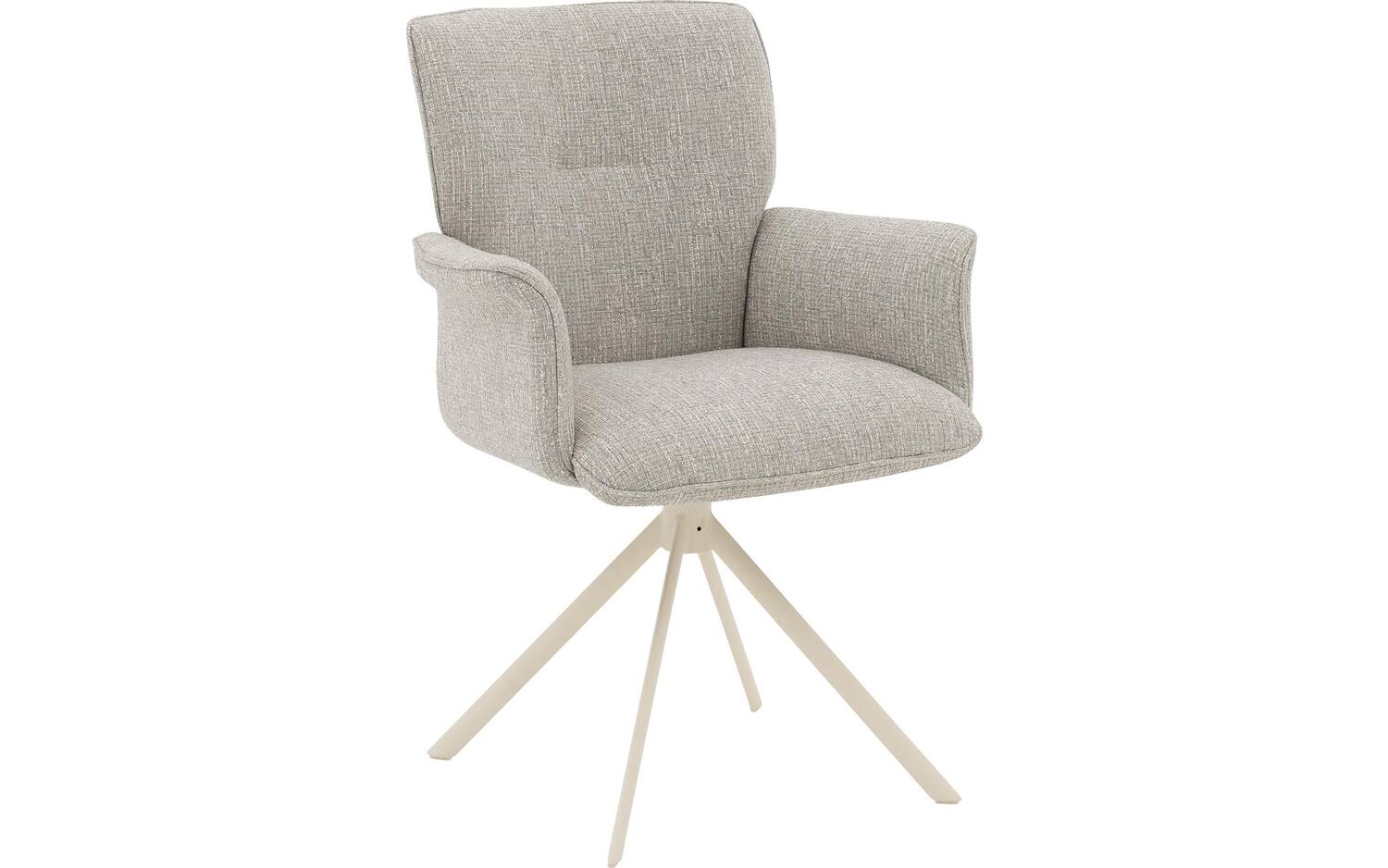 De witte spinpoot met poedercoating vormt een mooi contrast met de grijze stoffering. Deze onderstel is niet alleen een stijlvol element, maar maakt de stoel ook 360° draaibaar met returnfunctie. Na gebruik draait de stoel automatisch terug naar de oorspronkelijke positie, wat zorgt voor een opgeruimde uitstraling van je eetkamer.