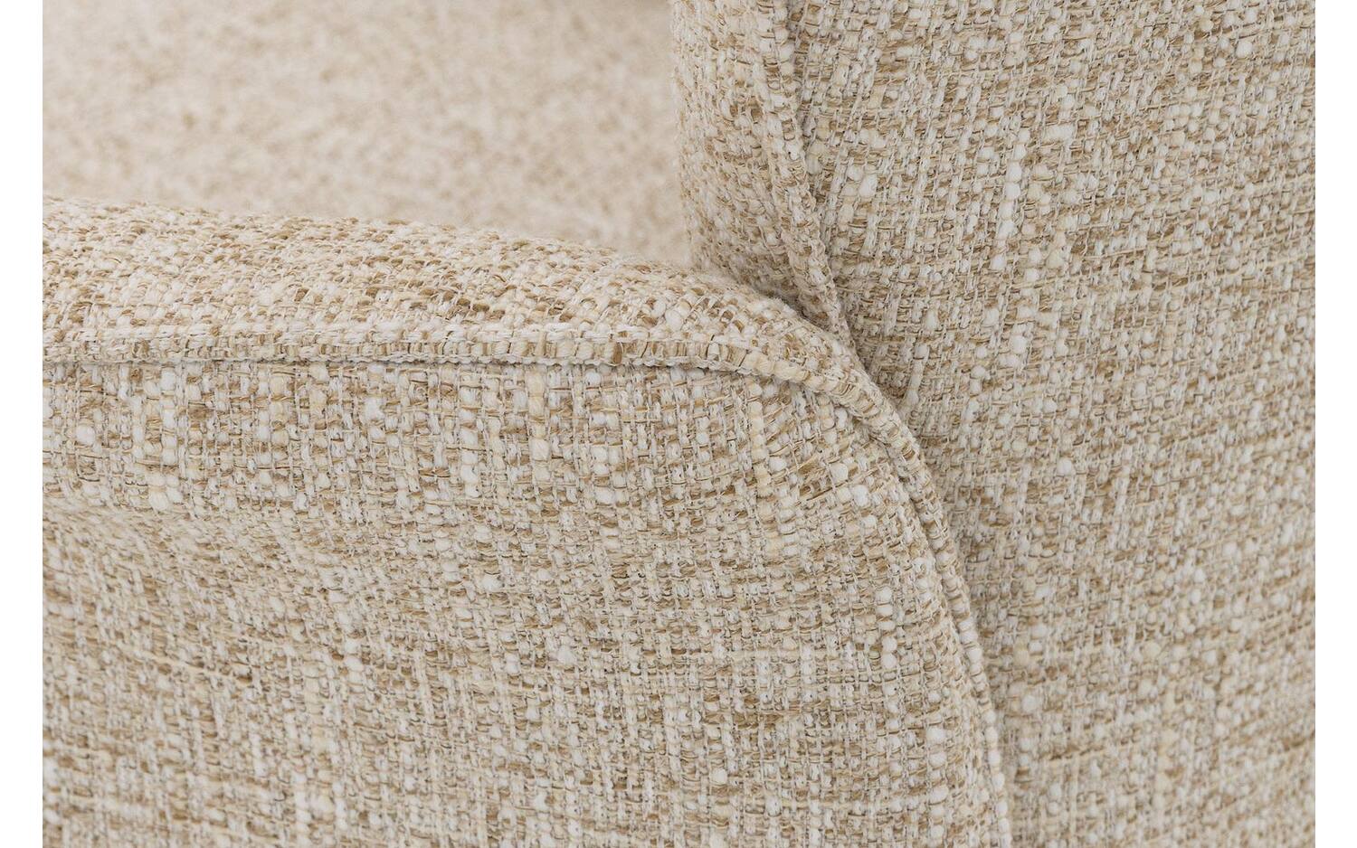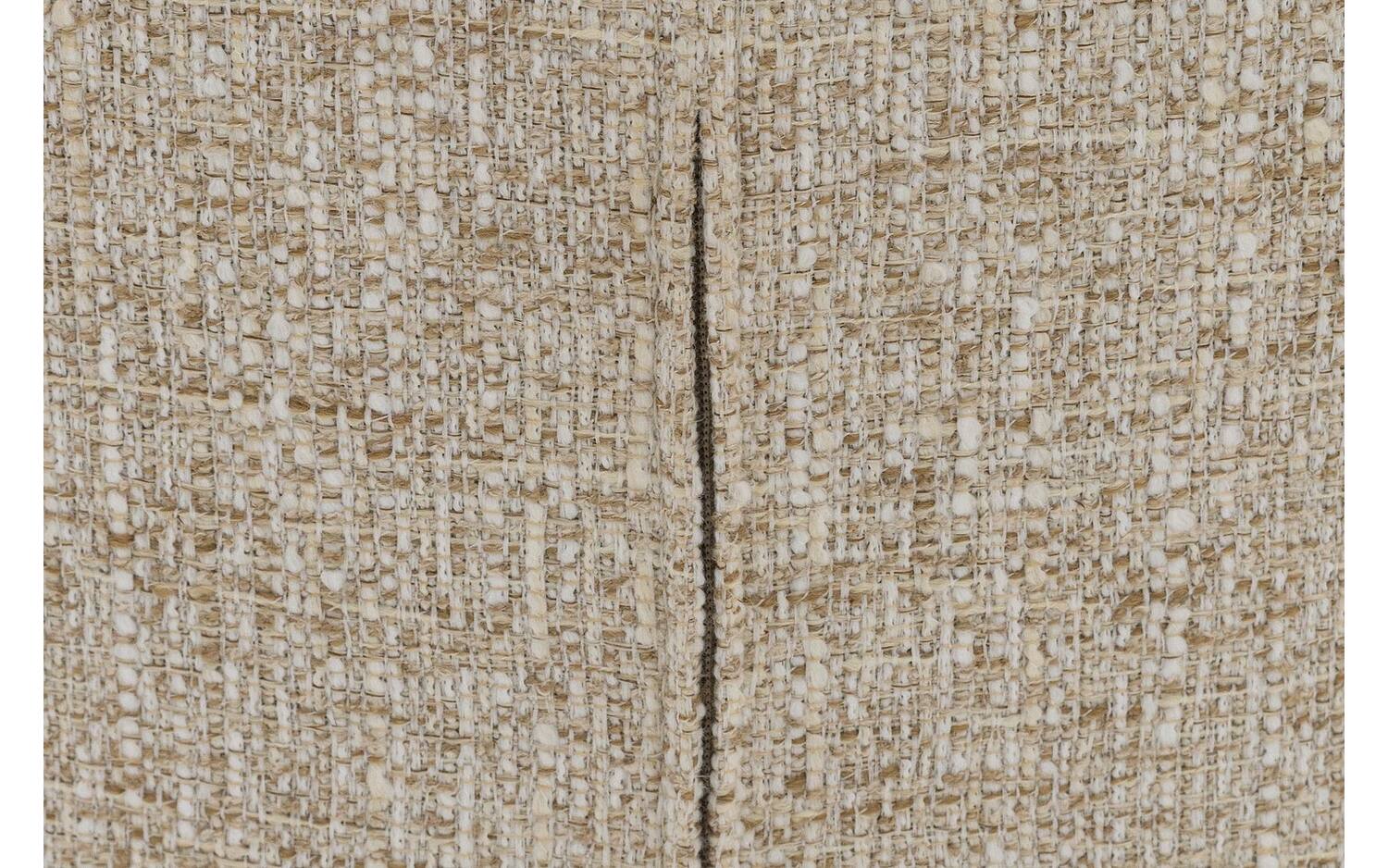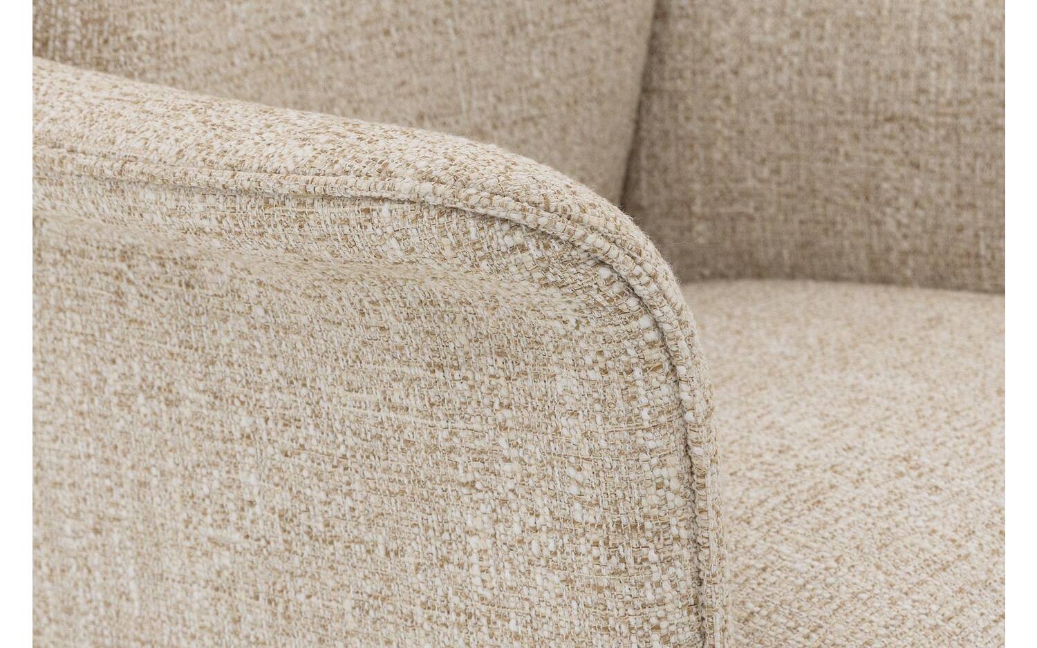 De stoel is bekleed met een grof geweven stof in een warme naturel tint, wat zorgt voor een natuurlijke en uitnodigende uitstraling. De vaste stoffering geeft de stoel een strakke, moderne look die jarenlang mooi blijft. Het subtiele stiksel in de rugleuning voegt een speels detail toe aan het ontwerp.