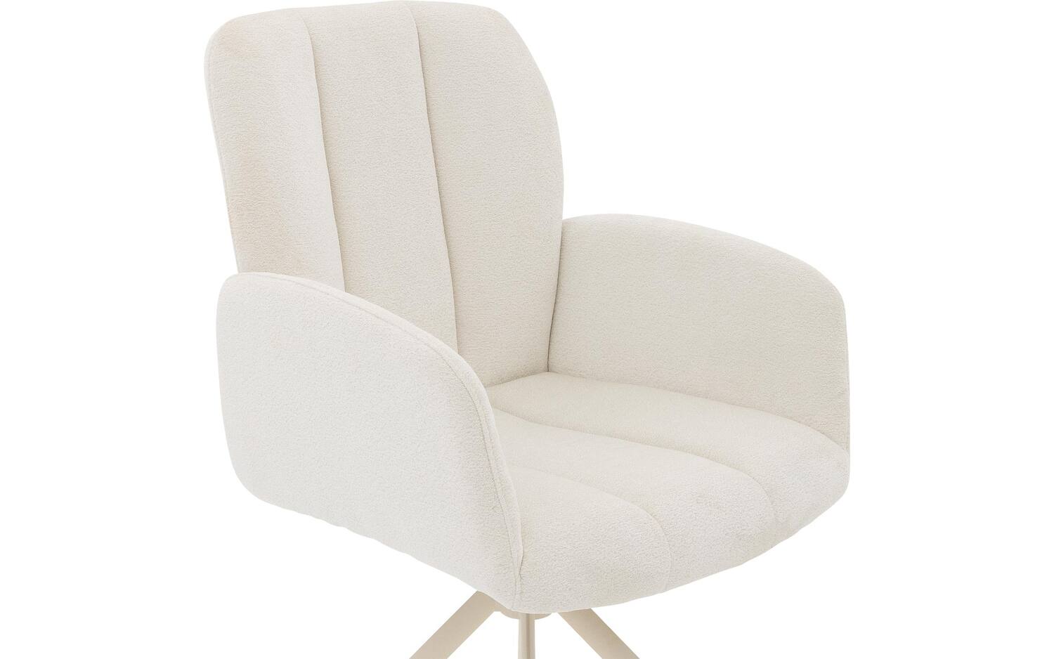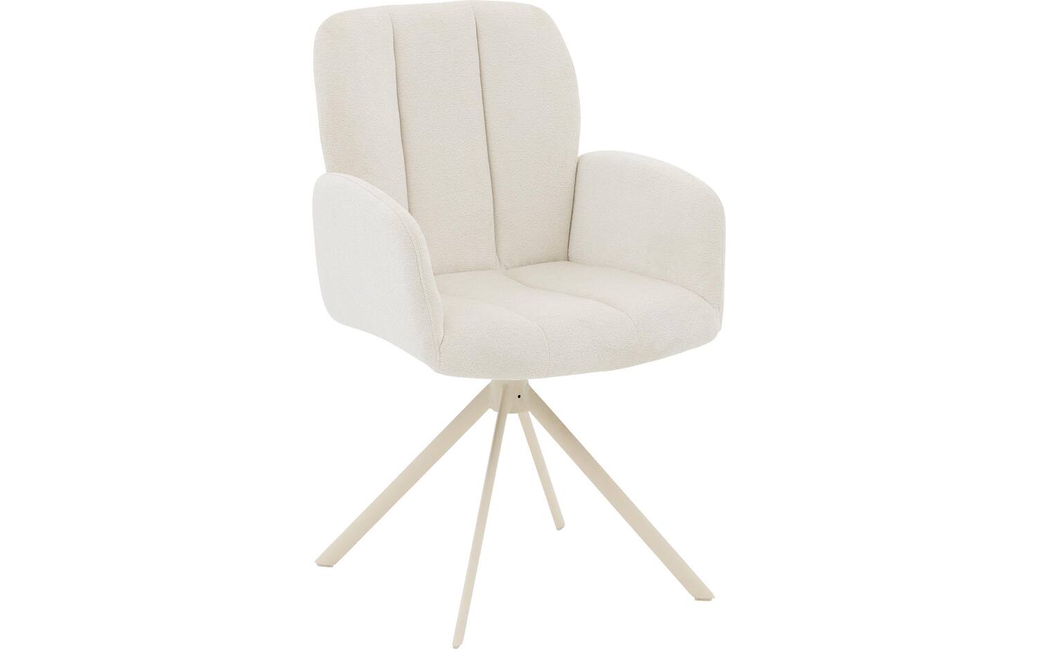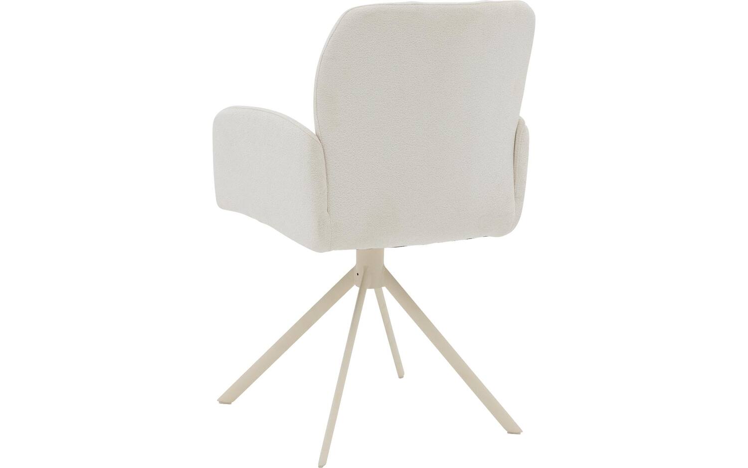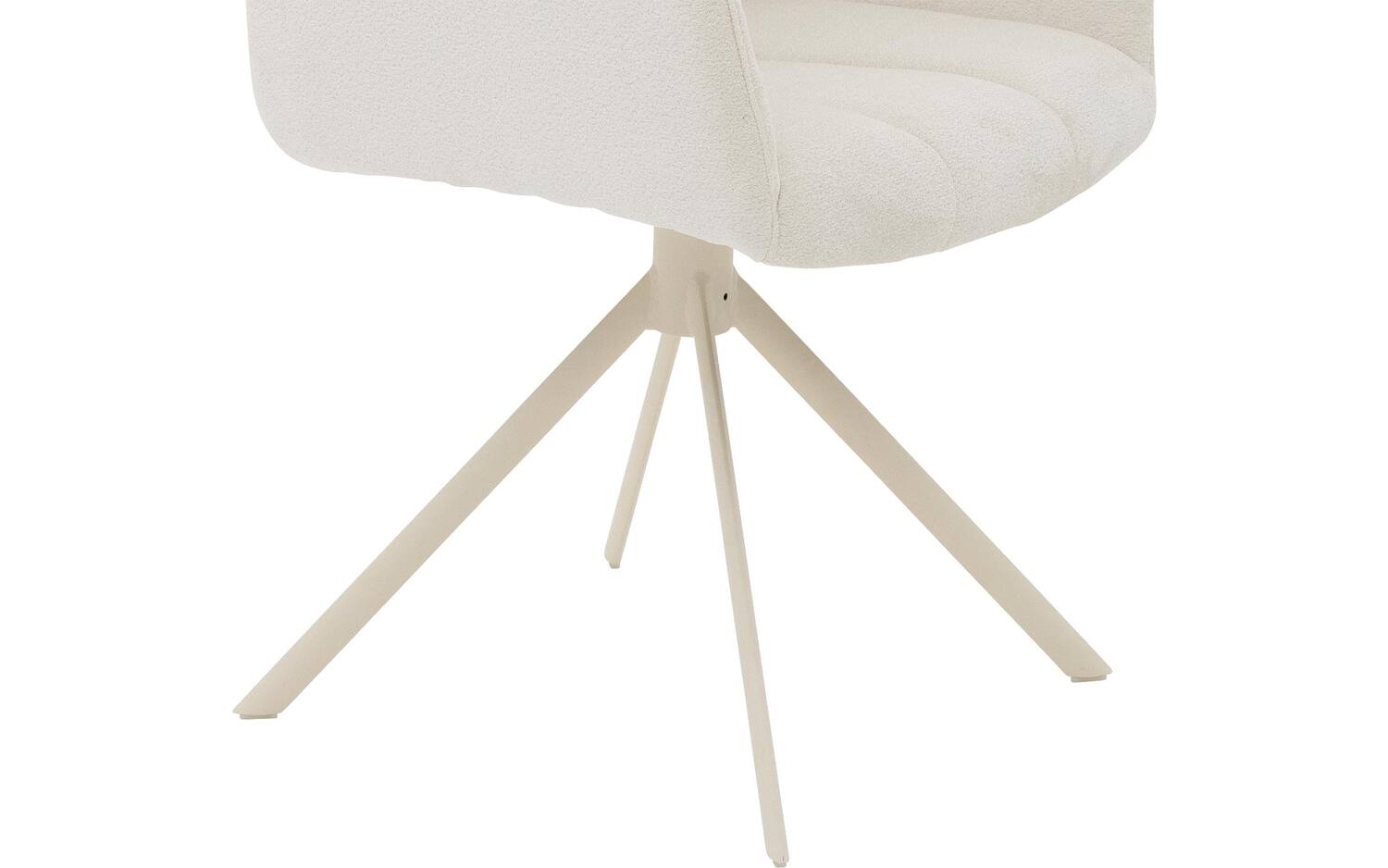 De off-white fijn geweven stofbekleding geeft deze eetstoel een frisse en tijdloze uitstraling. De verticale stiknaden op de kuipvormige zitting zorgen voor een stijlvol accent. De witte spinpoot met poedercoating sluit perfect aan bij de bekleding en geeft de stoel een moderne look.