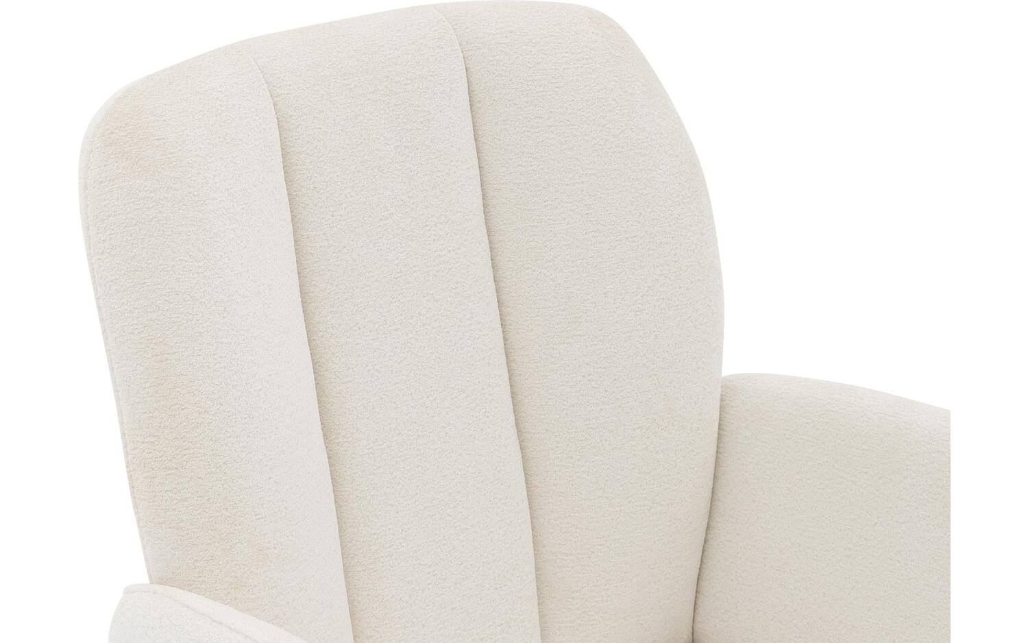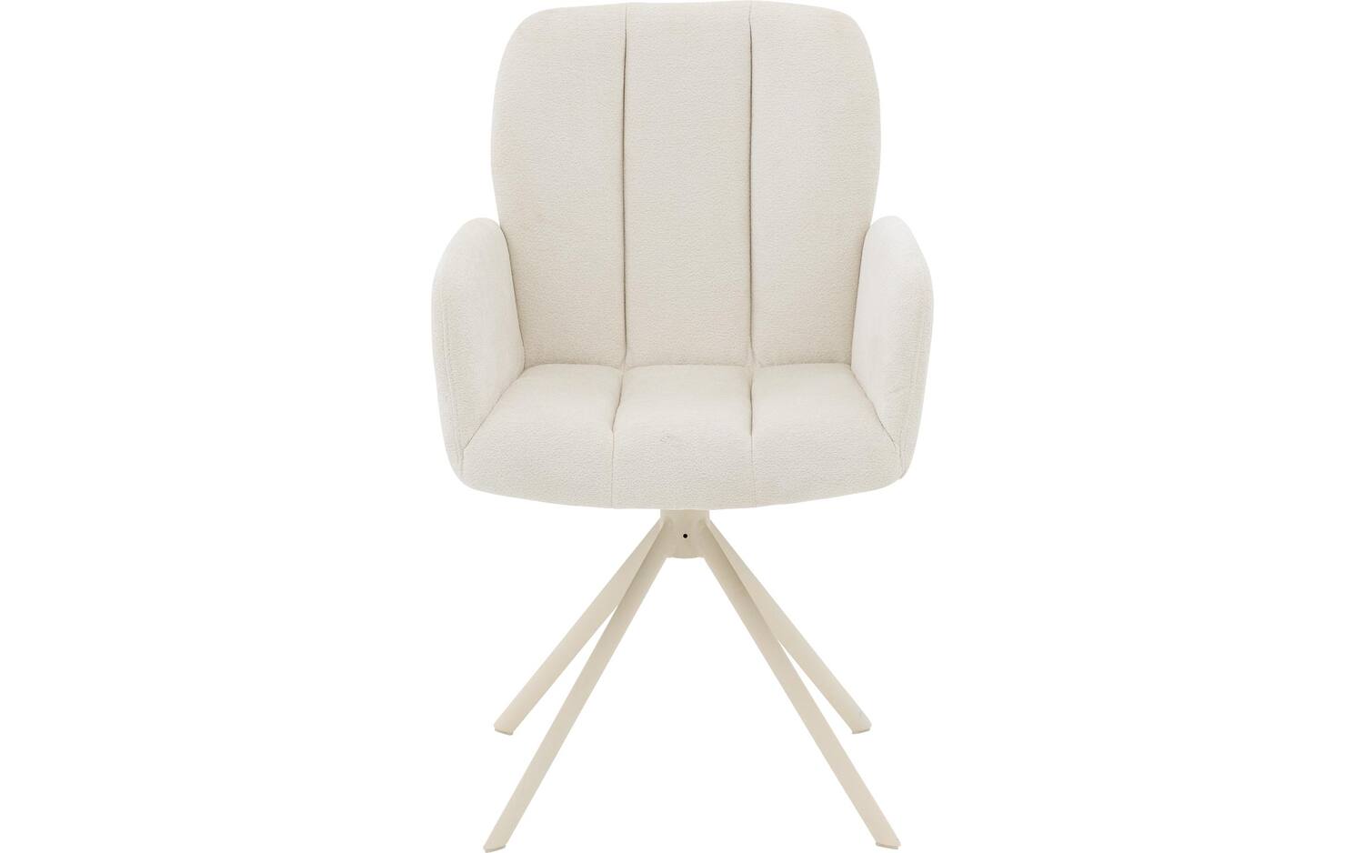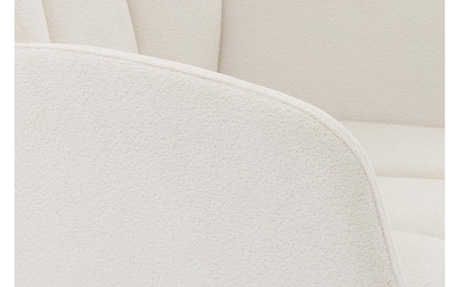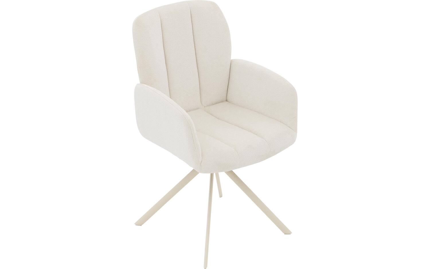 De off-white fijn geweven stofbekleding geeft deze eetstoel een frisse en tijdloze uitstraling. De verticale stiknaden op de kuipvormige zitting zorgen voor een stijlvol accent. De witte spinpoot met poedercoating sluit perfect aan bij de bekleding en geeft de stoel een moderne look.
