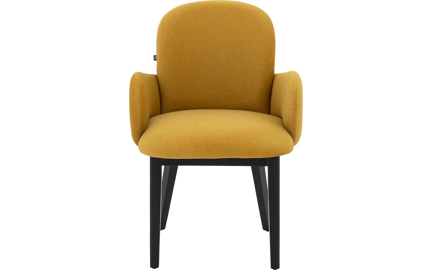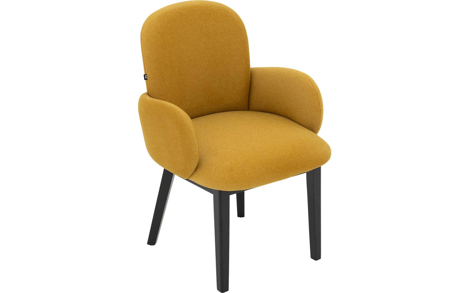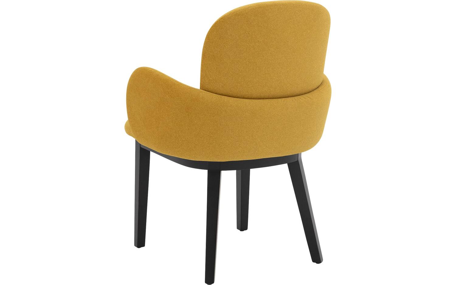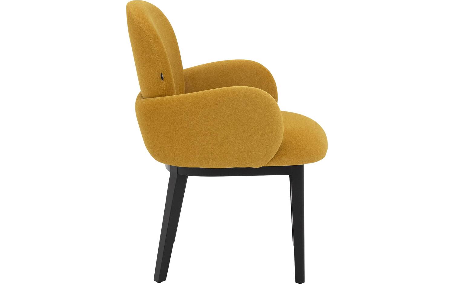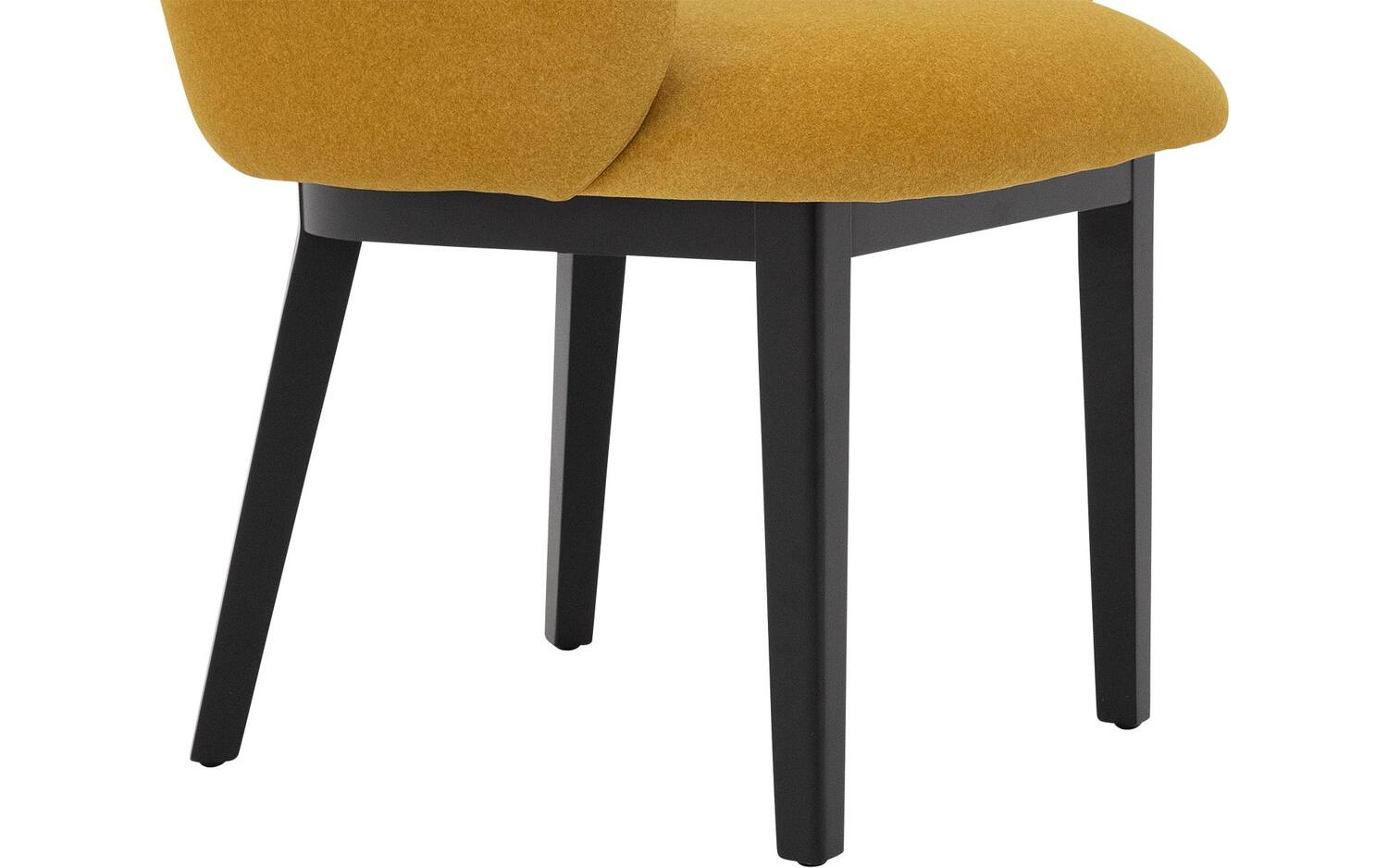 Het zwart gelakte onderstel vormt een mooi contrast met de okergele bekleding en geeft de stoel een moderne look. De vaste stoffering zorgt voor een strakke uitstraling die langdurig mooi blijft. En door de lage rugleuning van minder dan 95 cm past de stoel ook onder lagere tafels.