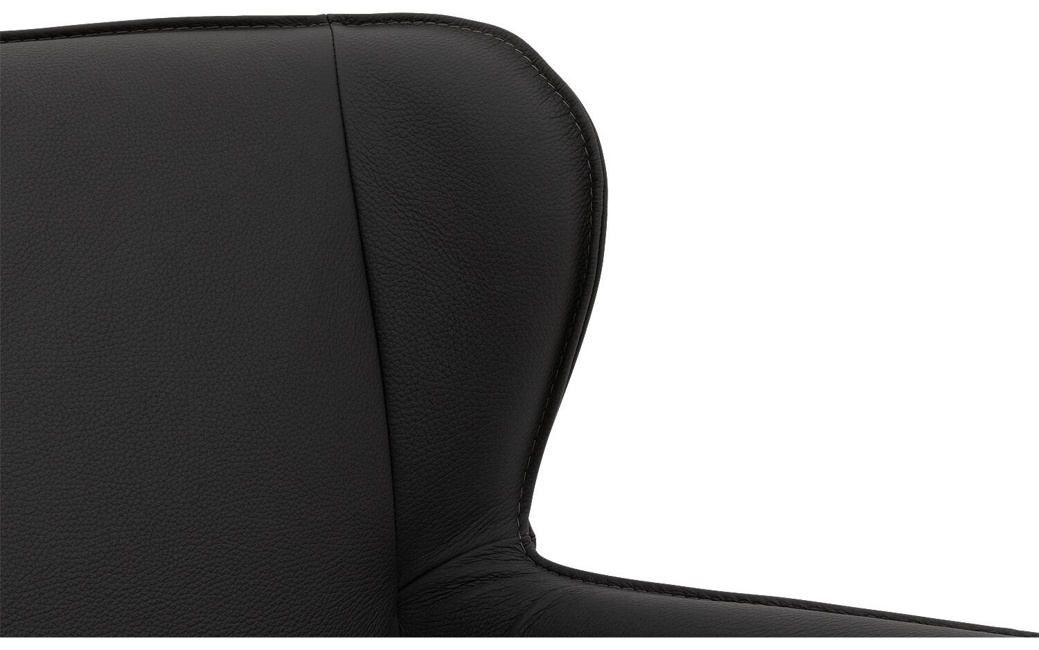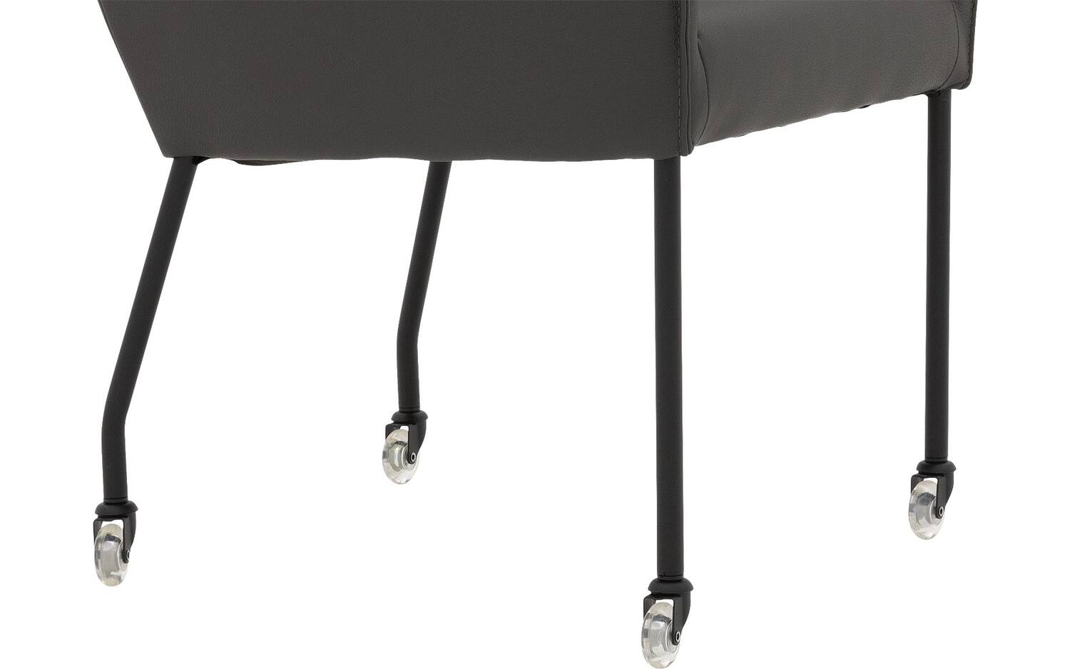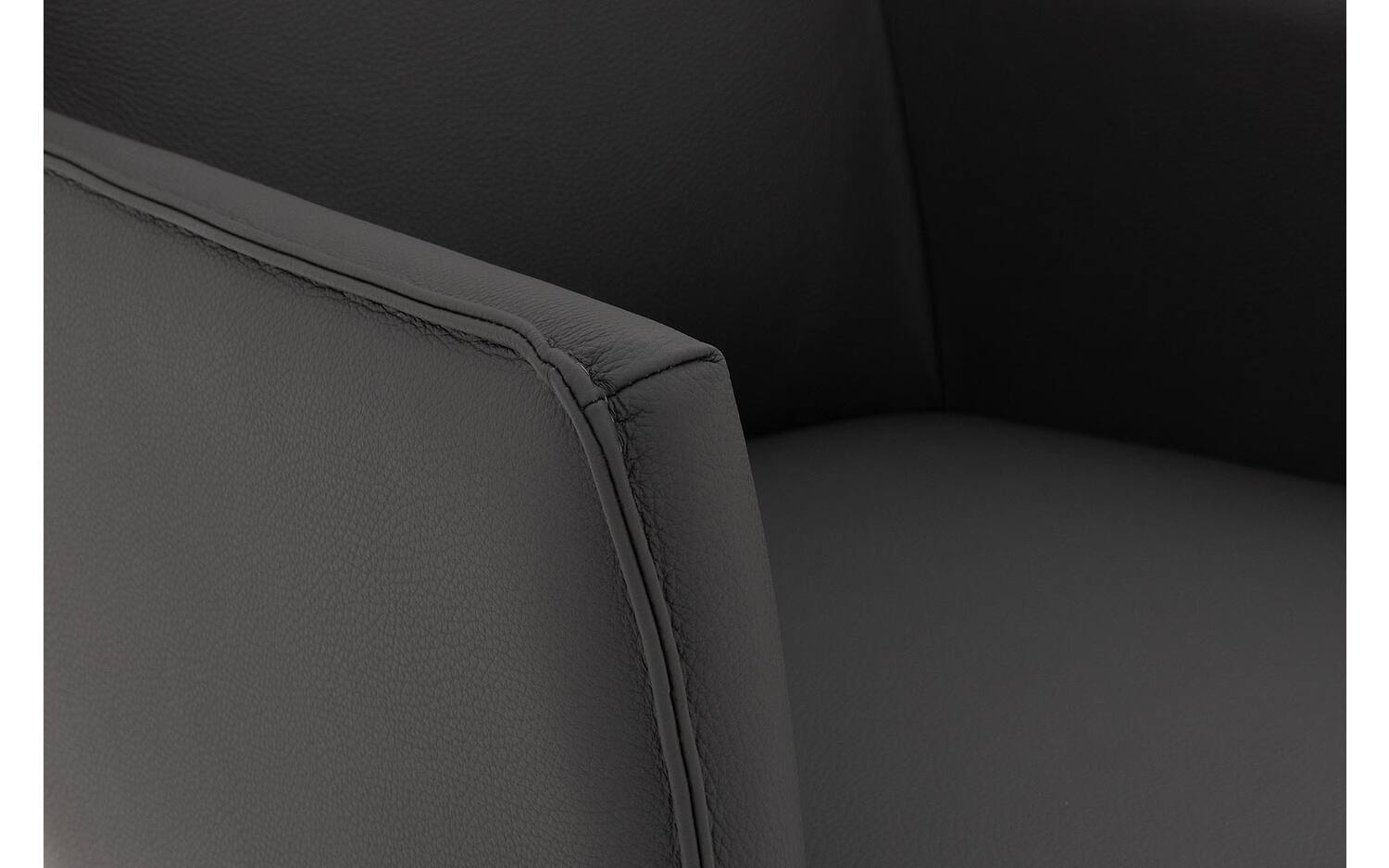 Het zwarte onderstel met poedercoating vormt een stijlvol contrast met de donkergrijze lederen bekleding. De vaste stoffering geeft eetkamerstoel Leogang een strakke, moderne uitstraling die perfect past bij een elegant chique interieurstijl.