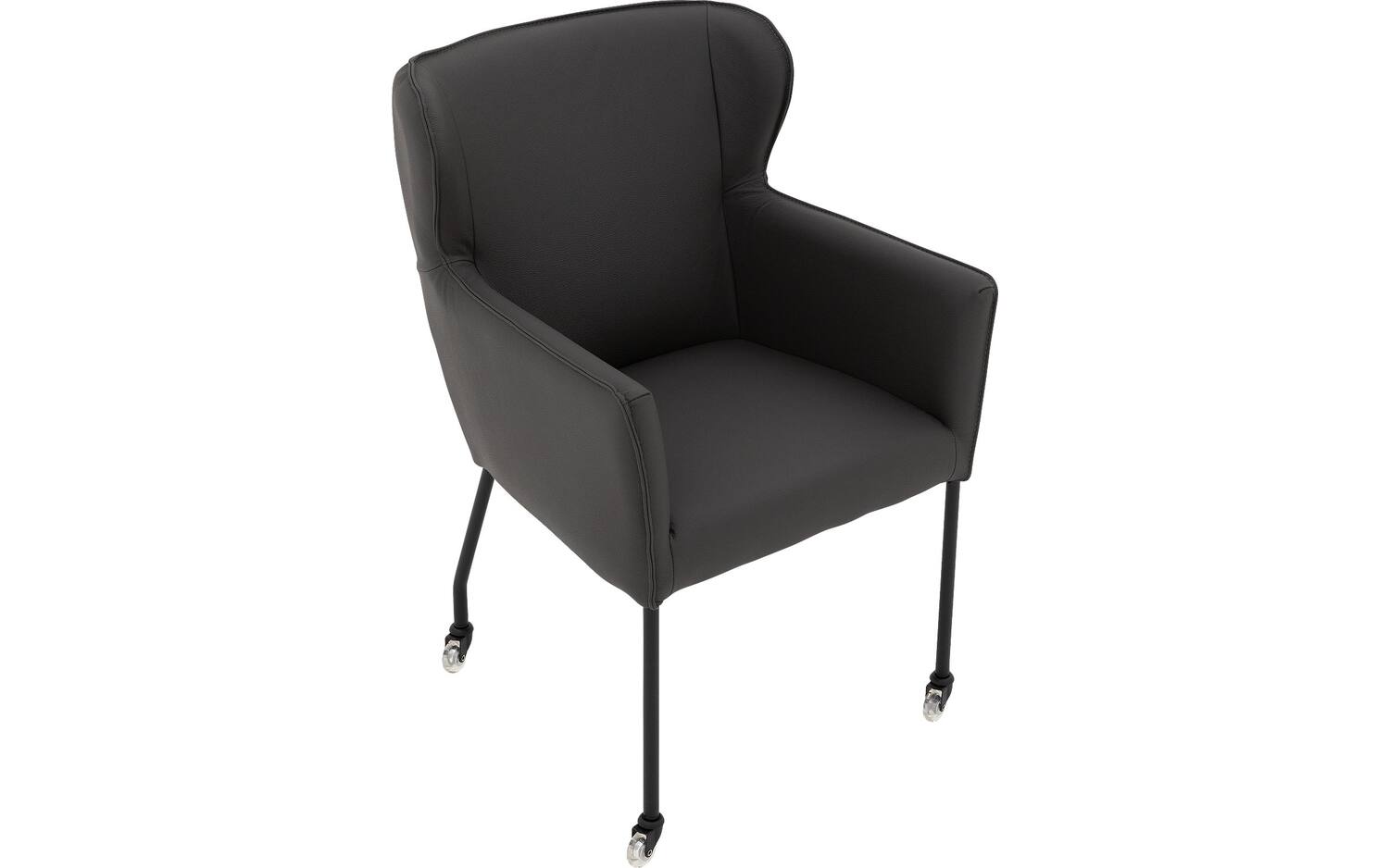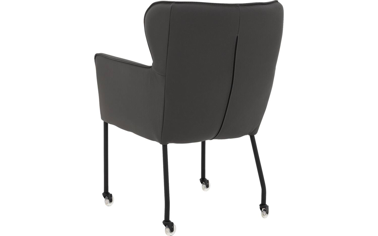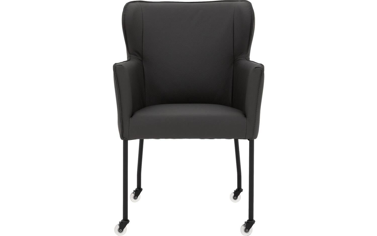 Het zwarte onderstel met poedercoating vormt een stijlvol contrast met de donkergrijze lederen bekleding. De vaste stoffering geeft eetkamerstoel Leogang een strakke, moderne uitstraling die perfect past bij een elegant chique interieurstijl.