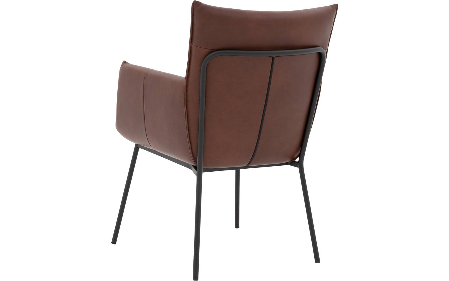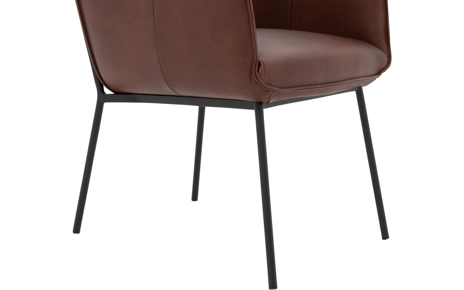 De stoel staat stevig op minimalistische zwarte poten met poedercoating, die perfect contrasteren met de warme cognactint van het leer. De vaste stoffering zorgt voor een strakke, moderne uitstraling die jarenlang mooi blijft. Met een totale hoogte van 87 cm en een zithoogte van 49 cm past Silvan perfect aan de meeste eettafels.