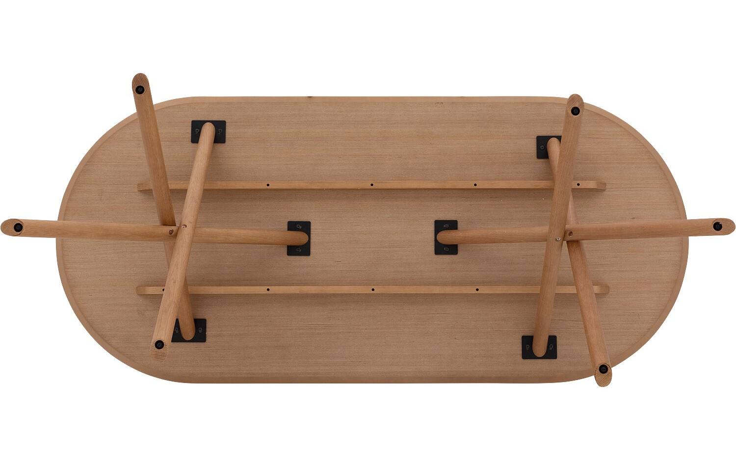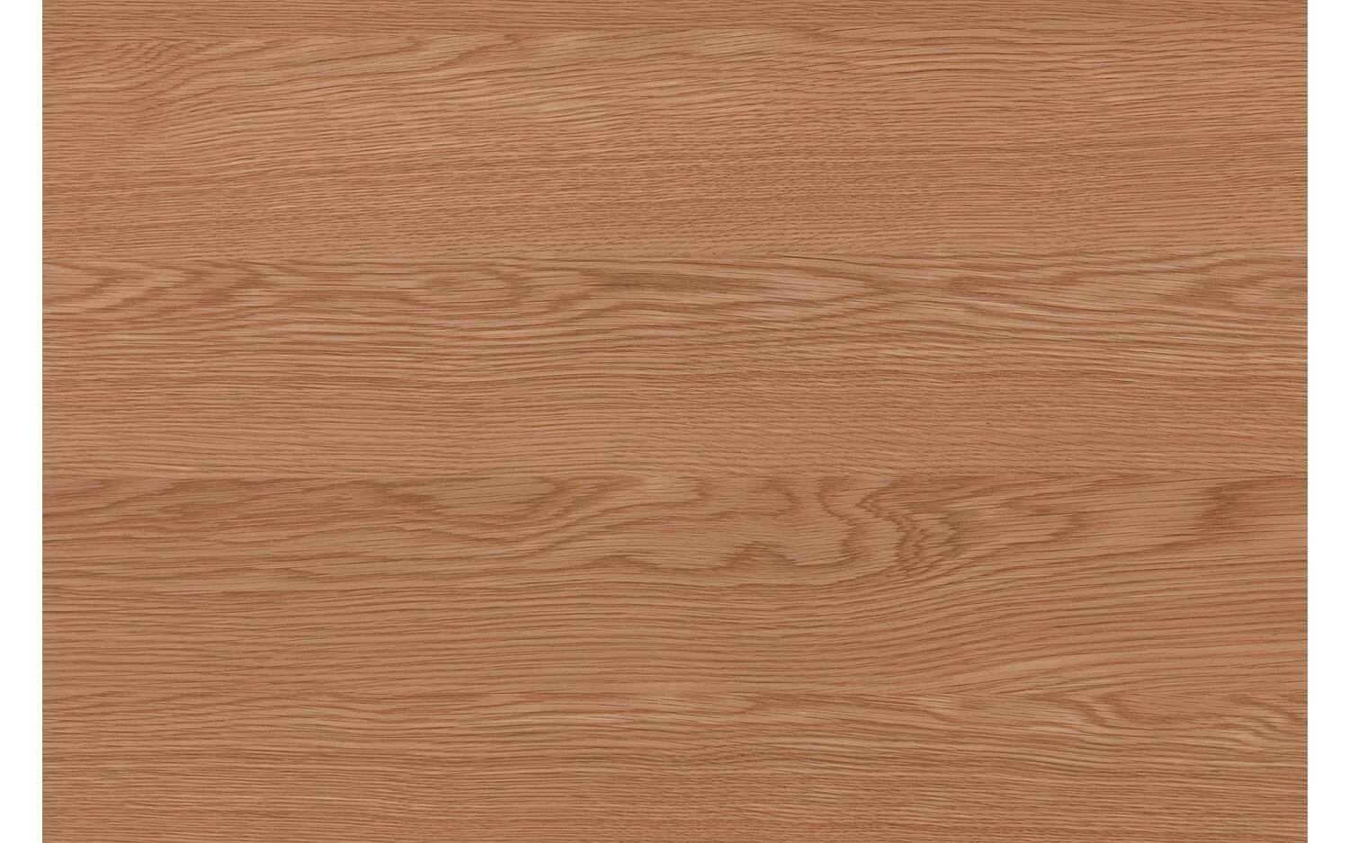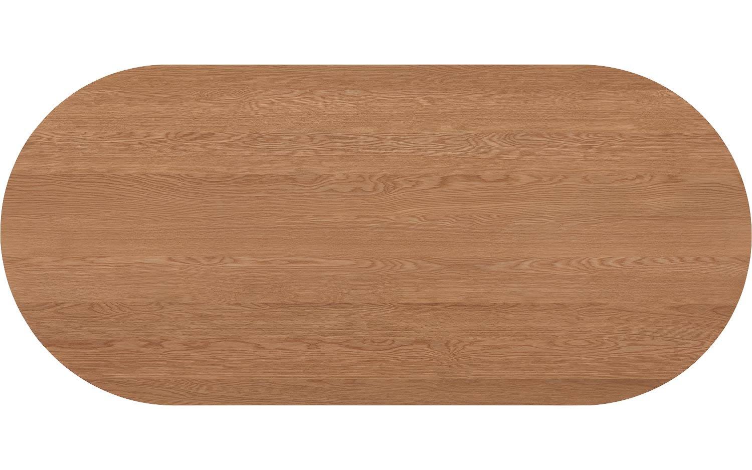 Het tafelblad is gemaakt van eikenfineer met een beschermende laklaag. Deze afwerking maakt de tafel krasbestendig en onderhoudsvriendelijk. De natuurlijke nerftekening van het eiken blijft mooi zichtbaar door de neutrale blank gelakte behandeling.