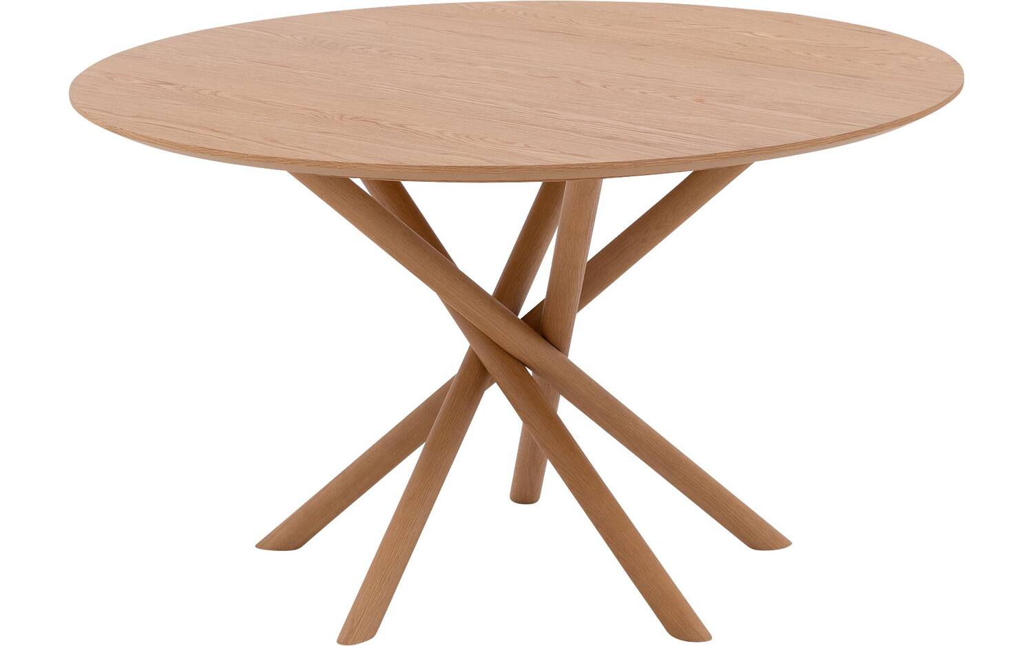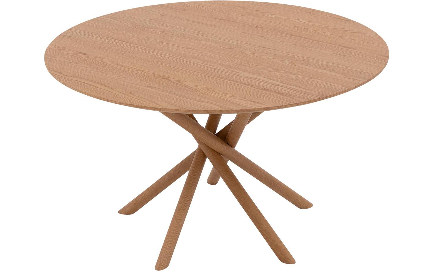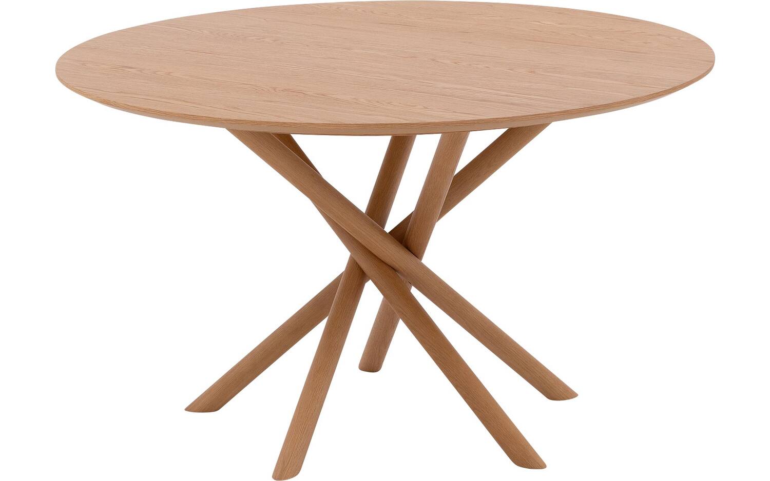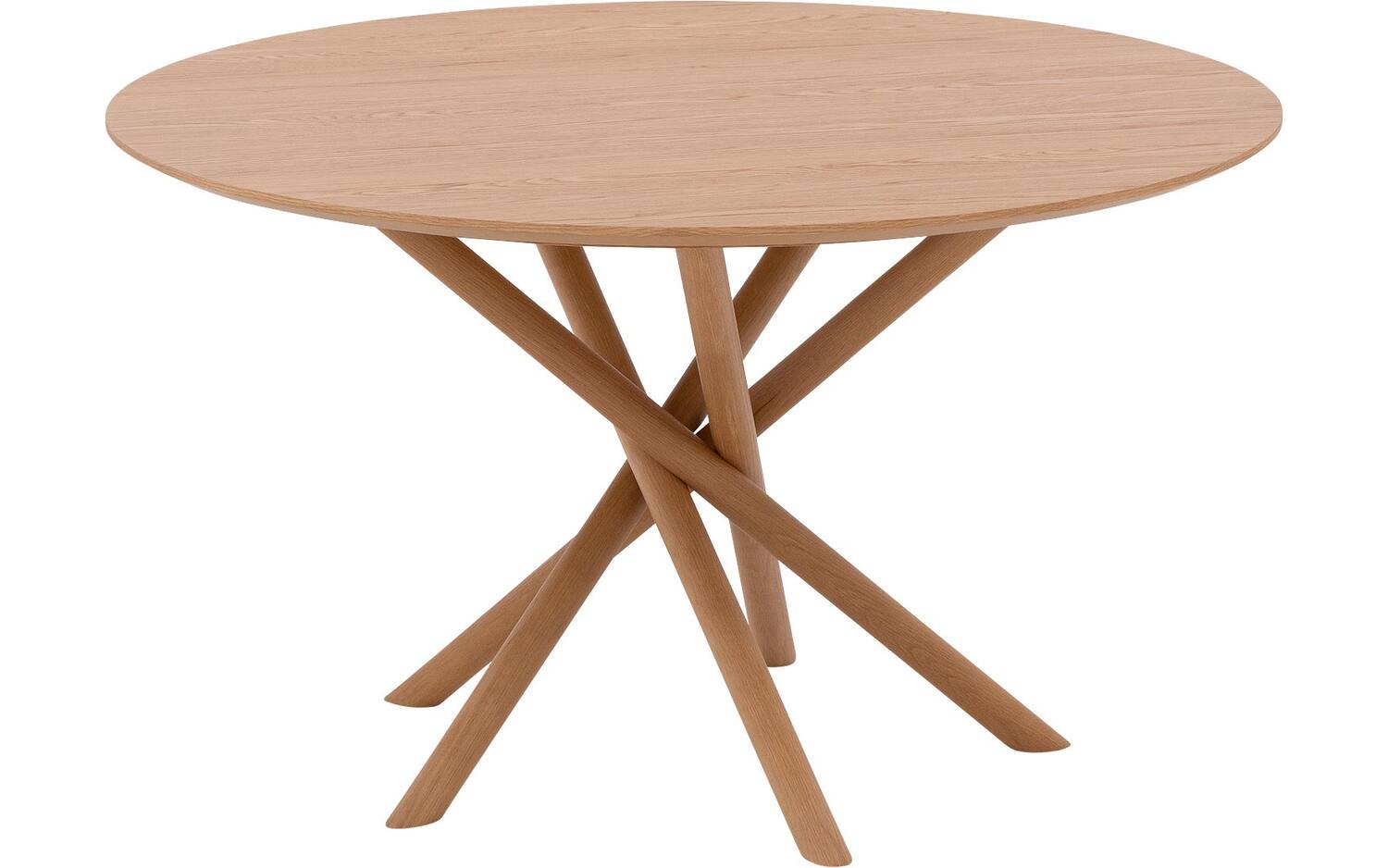 Ronde eettafel Kristian nodigt uit tot gezellig samenzijn. Deze eikenhouten designtafel is een echte blikvanger met haar verjongde blad en speelse kruispoot onderstel...