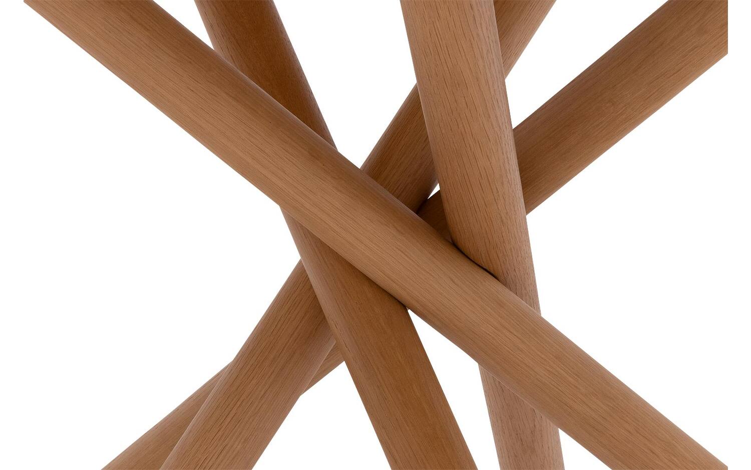 Het kruispoot onderstel, eveneens van gelakt eiken, vormt een harmonieuze balans met het verjongde blad. Deze unieke constructie maakt Kristian tot het stralende middelpunt van jouw eetruimte.