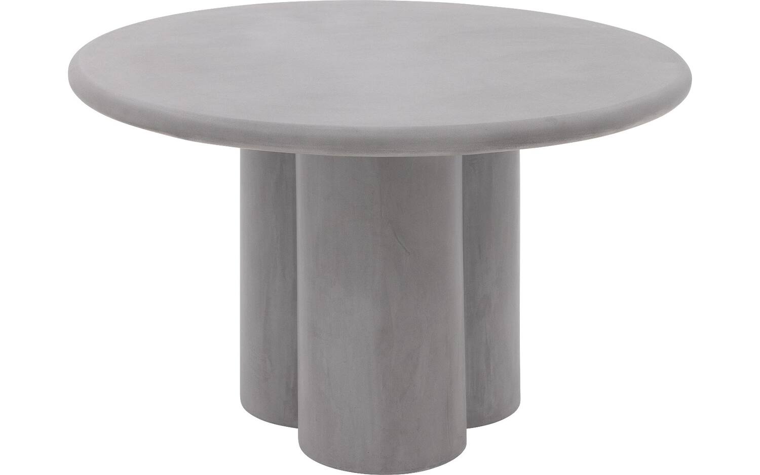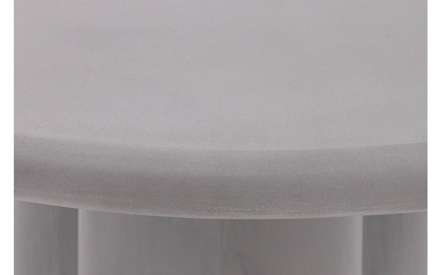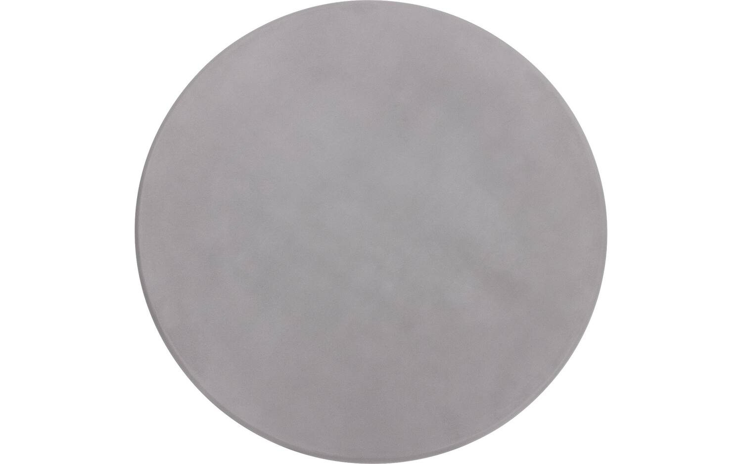 Het ronde tafelblad van 140 cm doorsnede is gemaakt van gebonden beton met een blanke beschermlaag. Dit materiaal geeft de tafel zijn karakteristieke robuuste look en zorgt tegelijk voor duurzaamheid in het dagelijks gebruik.