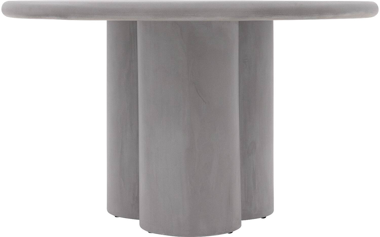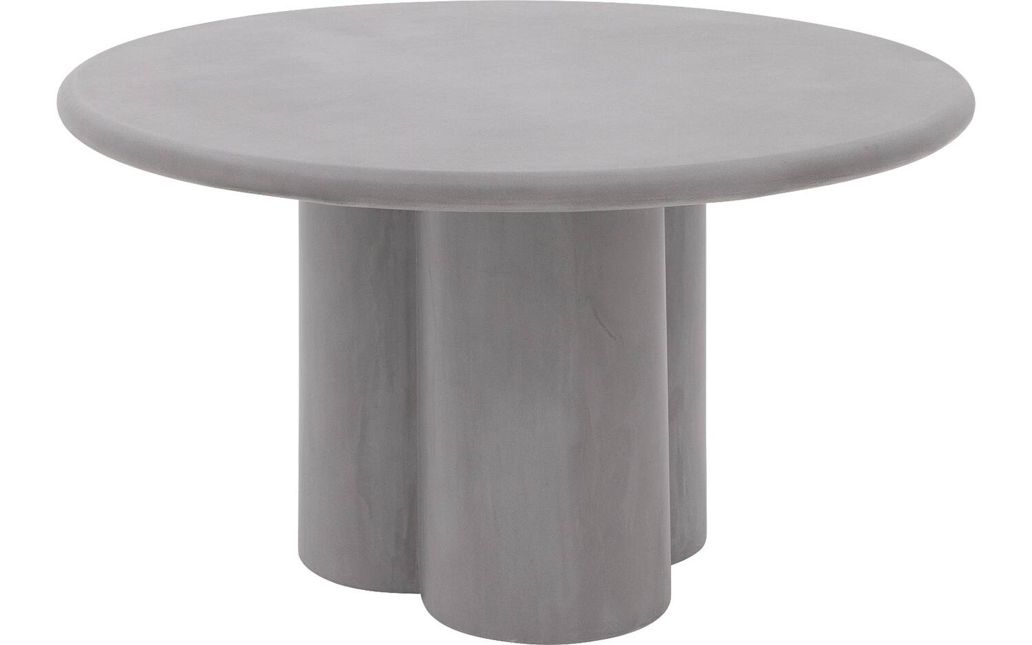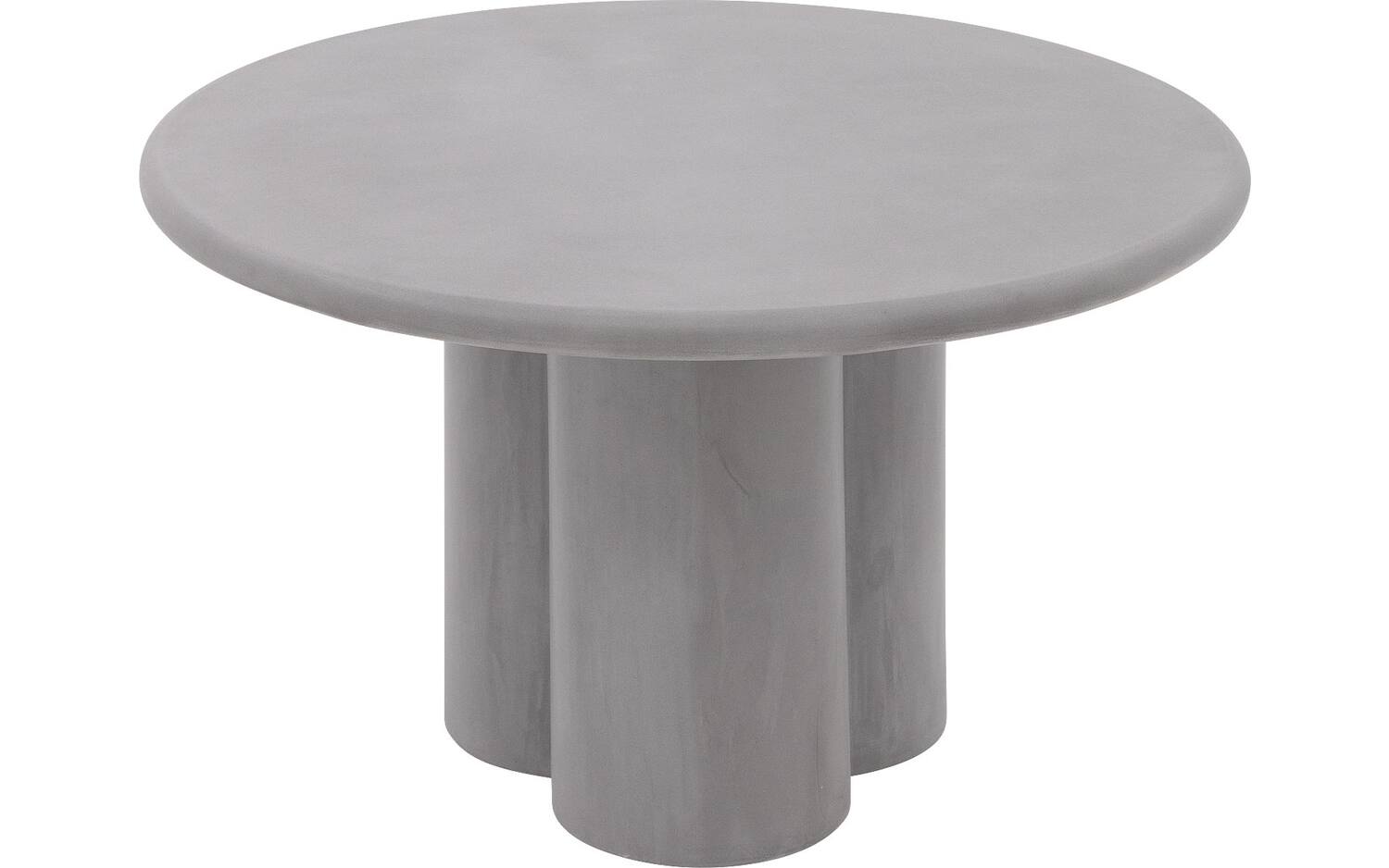 Het ronde tafelblad van 140 cm doorsnede is gemaakt van gebonden beton met een blanke beschermlaag. Dit materiaal geeft de tafel zijn karakteristieke robuuste look en zorgt tegelijk voor duurzaamheid in het dagelijks gebruik.