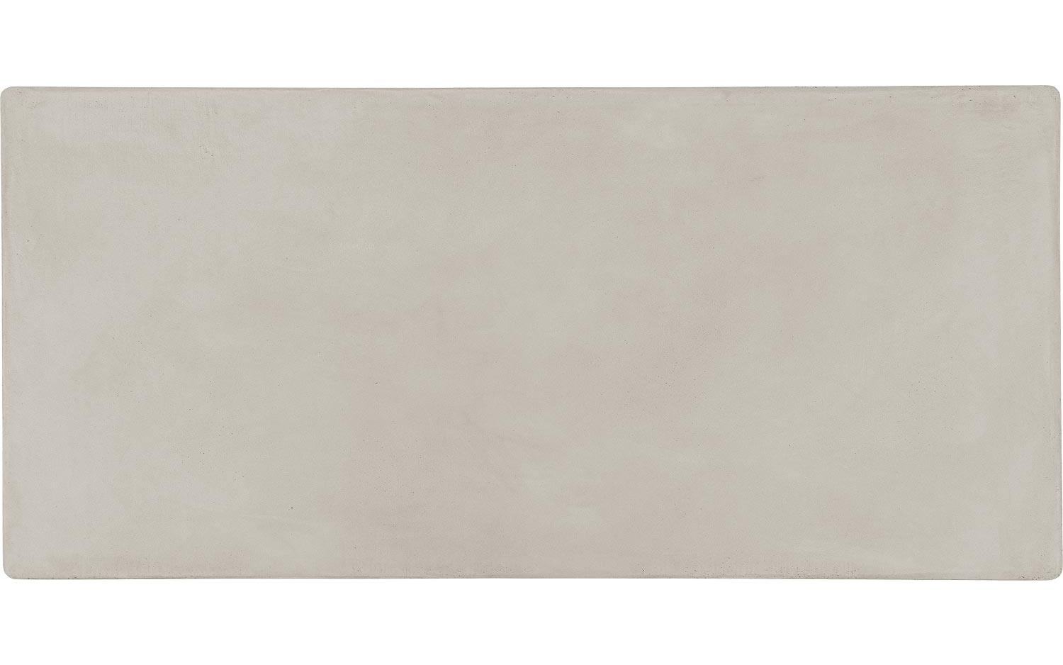 Het grijze tafelblad is gemaakt van MDF met een dunne betonlaag en heeft een authentieke look met lichte onregelmatigheden zoals kleine putjes en een gevlekte structuur. Deze natuurlijke variaties versterken het industriële karakter. Het beton is geïmpregneerd en voorzien van een blanke beschermlaag.