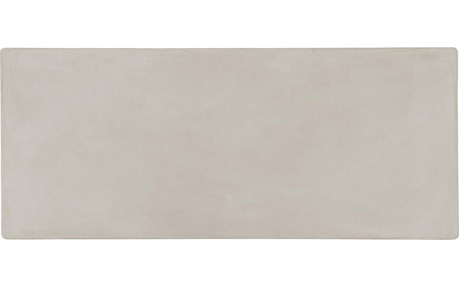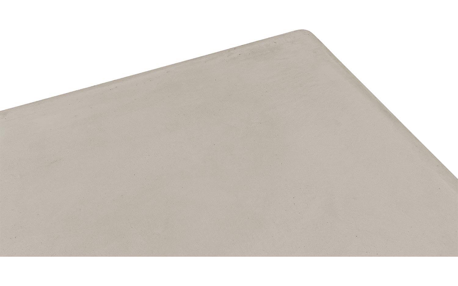 Het grijze tafelblad is gemaakt van MDF en afgewerkt met een dunne laag beton. De lichte onregelmatigheden en gevlamde structuur versterken de industriële uitstraling. Voor extra bescherming is het beton geïmpregneerd en voorzien van een blanke beschermlaag.