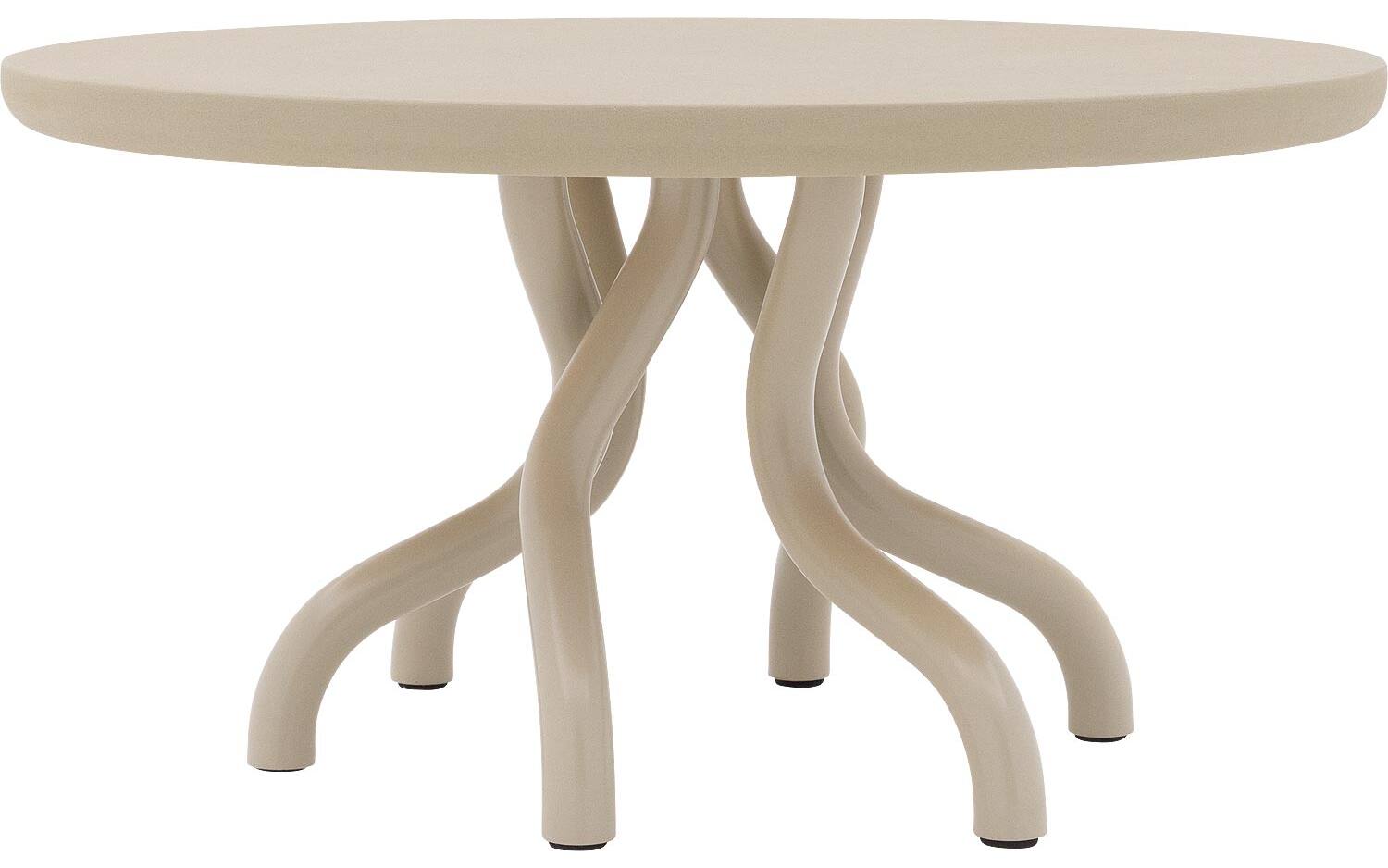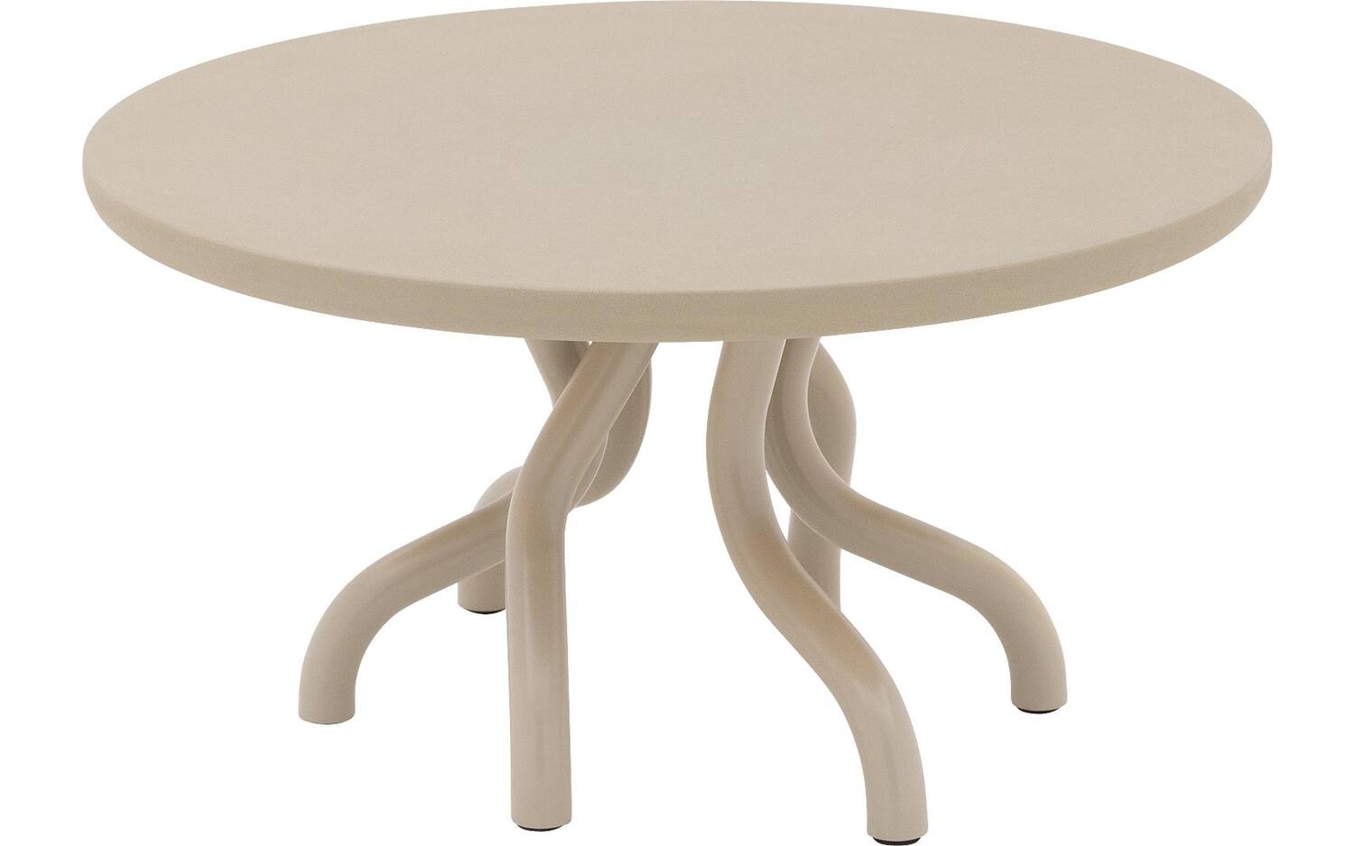 Salontafel Matera valt op door zijn ronde vorm en unieke onderstel van zes gebogen poten. De warme grijsgroene kleur leefbeton slik zorgt voor een natuurlijke, stoere uitstraling die perfect past in moderne en industriële interieurs.