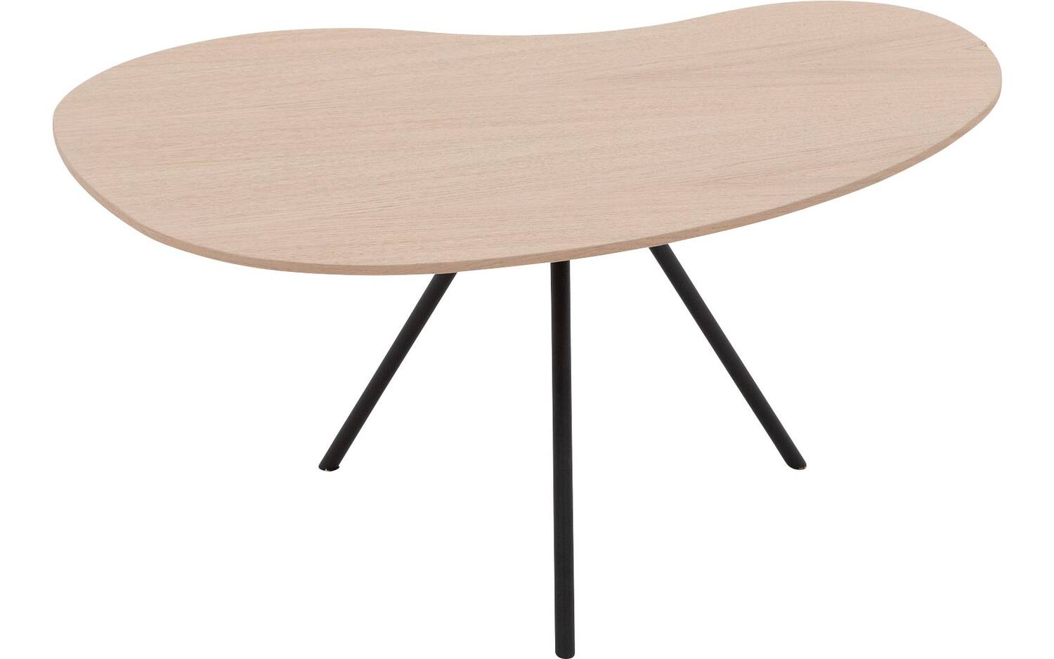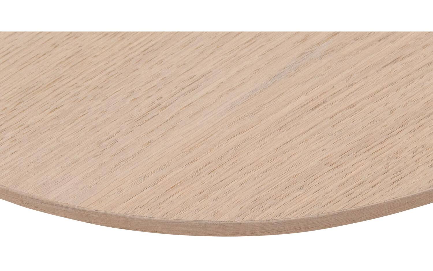 Het tafelblad is gemaakt van eikenfineer in een warme roomwitte tint. Door de lakafwerking is het blad goed beschermd tegen dagelijks gebruik. De organische vorm heeft zachte rondingen die een vriendelijk karakter geven.
