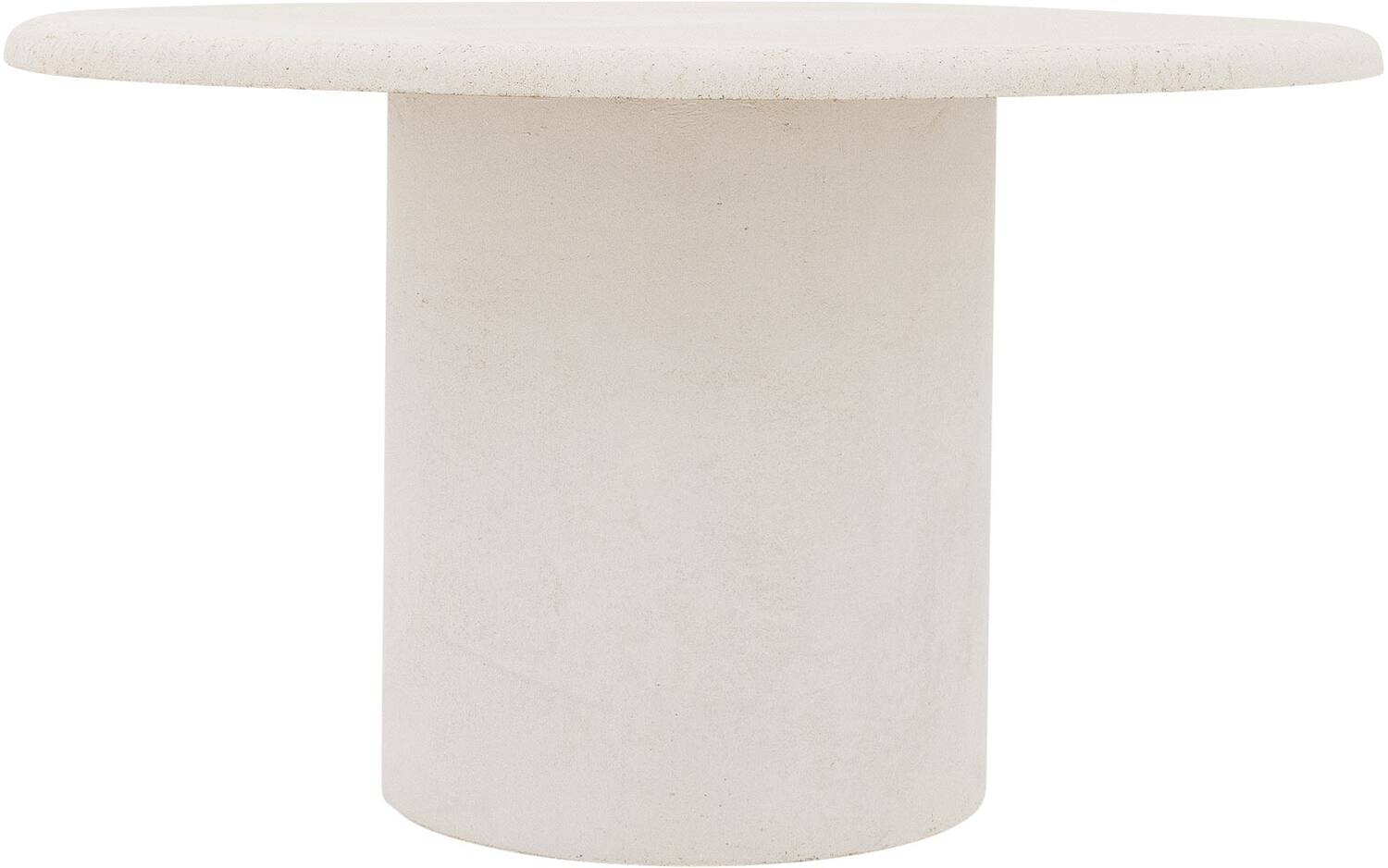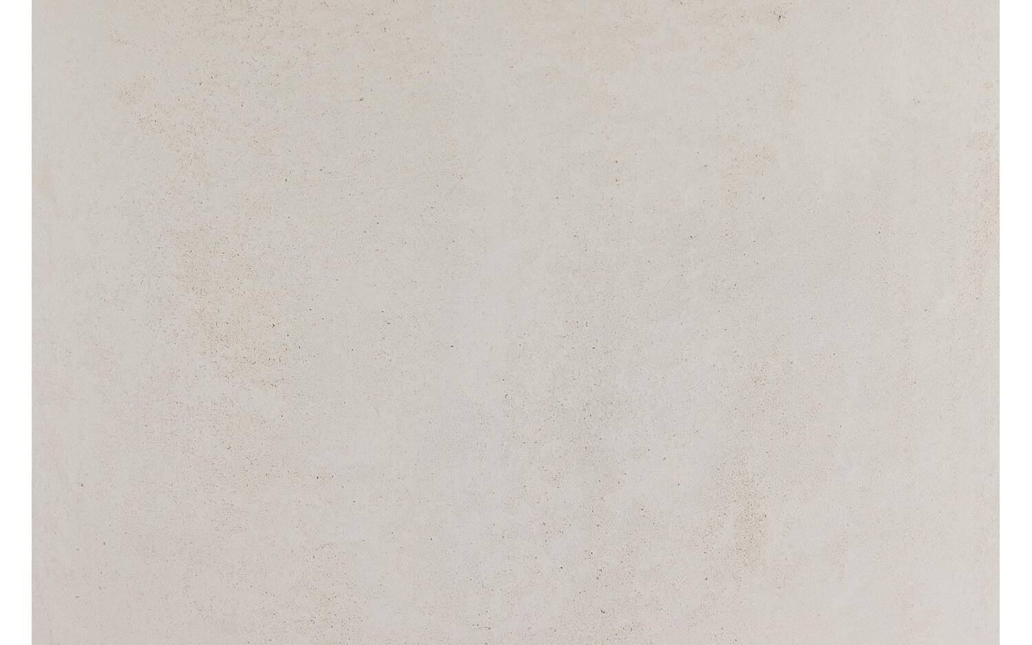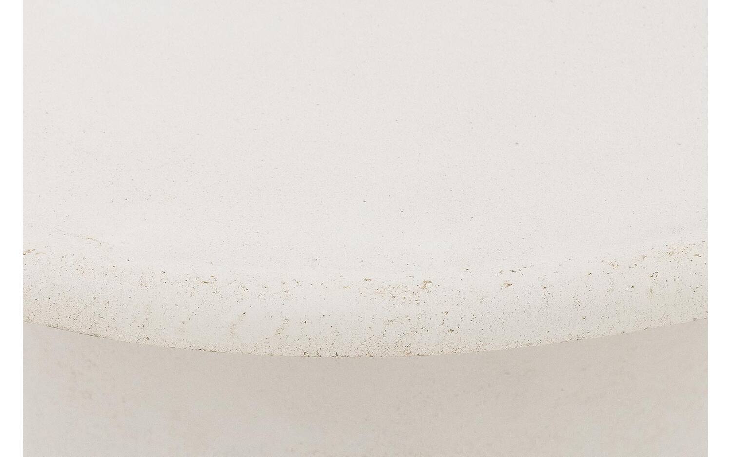 Het tafelblad van gebonden beton heeft een witte kleur en een ronde afwerking die de organische vorm benadrukt. Het materiaal is stevig en heeft een subtiele textuur die past bij een stoere woonstijl. De blanke beschermlaag zorgt ervoor dat het oppervlak makkelijker schoon te maken is.