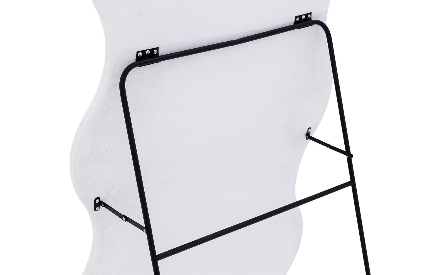 Staande spiegel Bats vormt een echte eyecatcher in je interieur met zijn organische, golvende vorm die doet denken aan een artistiek kunstwerk. Deze bijzondere spiegel van 60 x 160 cm combineert helder spiegelglas met een elegant wit frame, ondersteund door een strak zwart metalen onderstel. De vloeiende lijnen van het witte glasframe creëren een speelse contrast met de strakke zwarte poten, waardoor een perfect evenwicht ontstaat tussen modern design en organische vormen.