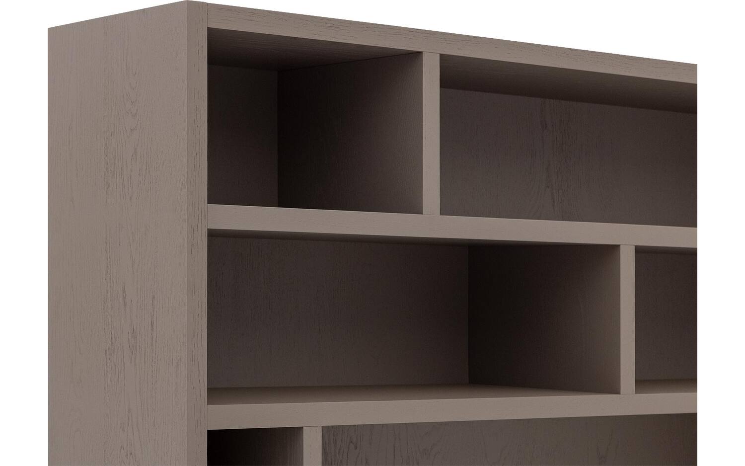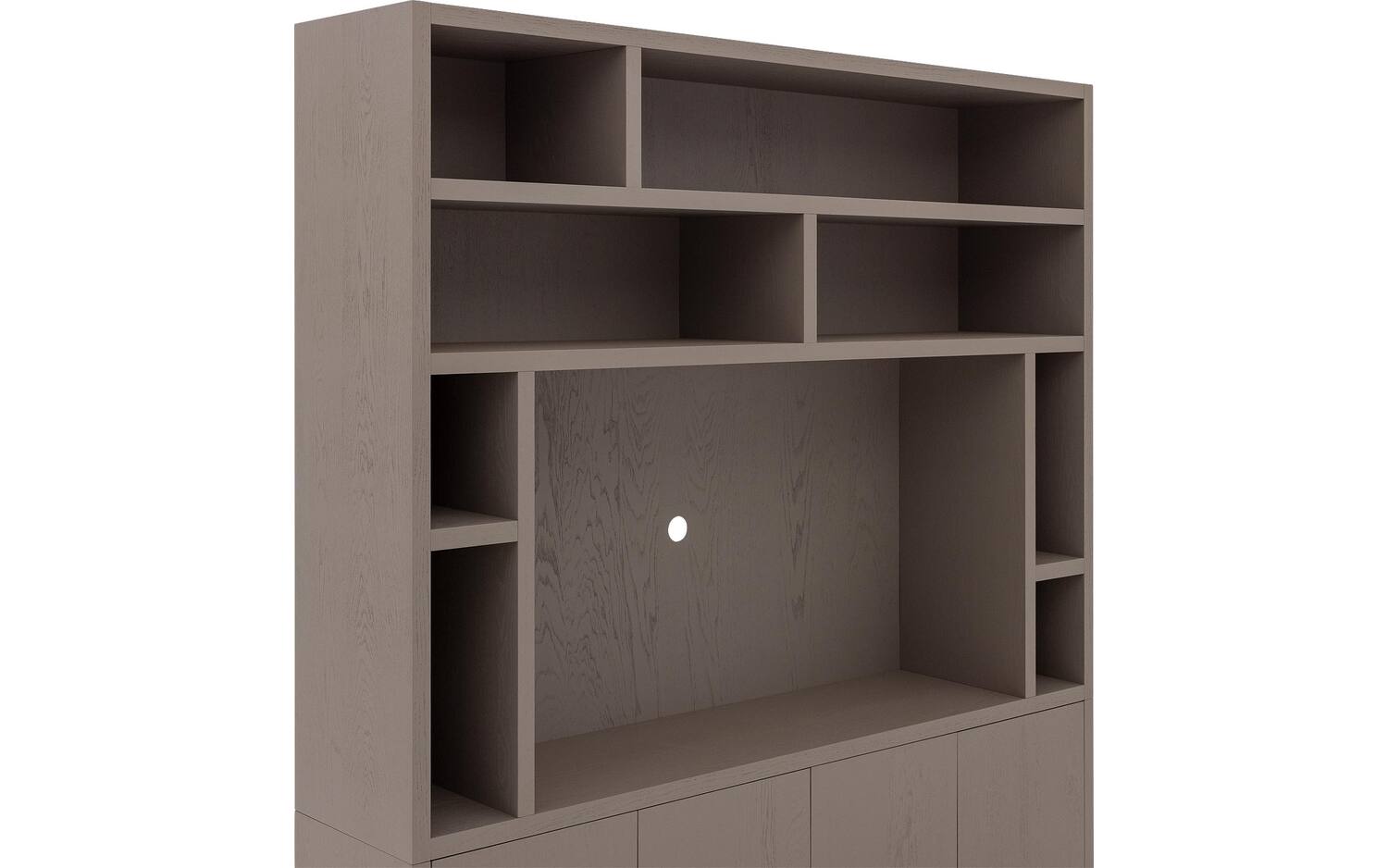 TV meubel Barcelona geeft je interieur direct een warme, landelijke sfeer. De taupe kleur van het eiken fineer straalt rust uit en past mooi bij verschillende woonstijlen. De combinatie van acht open vakken en gesloten opbergruimte zorgt voor een opgeruimd én gezellig geheel.