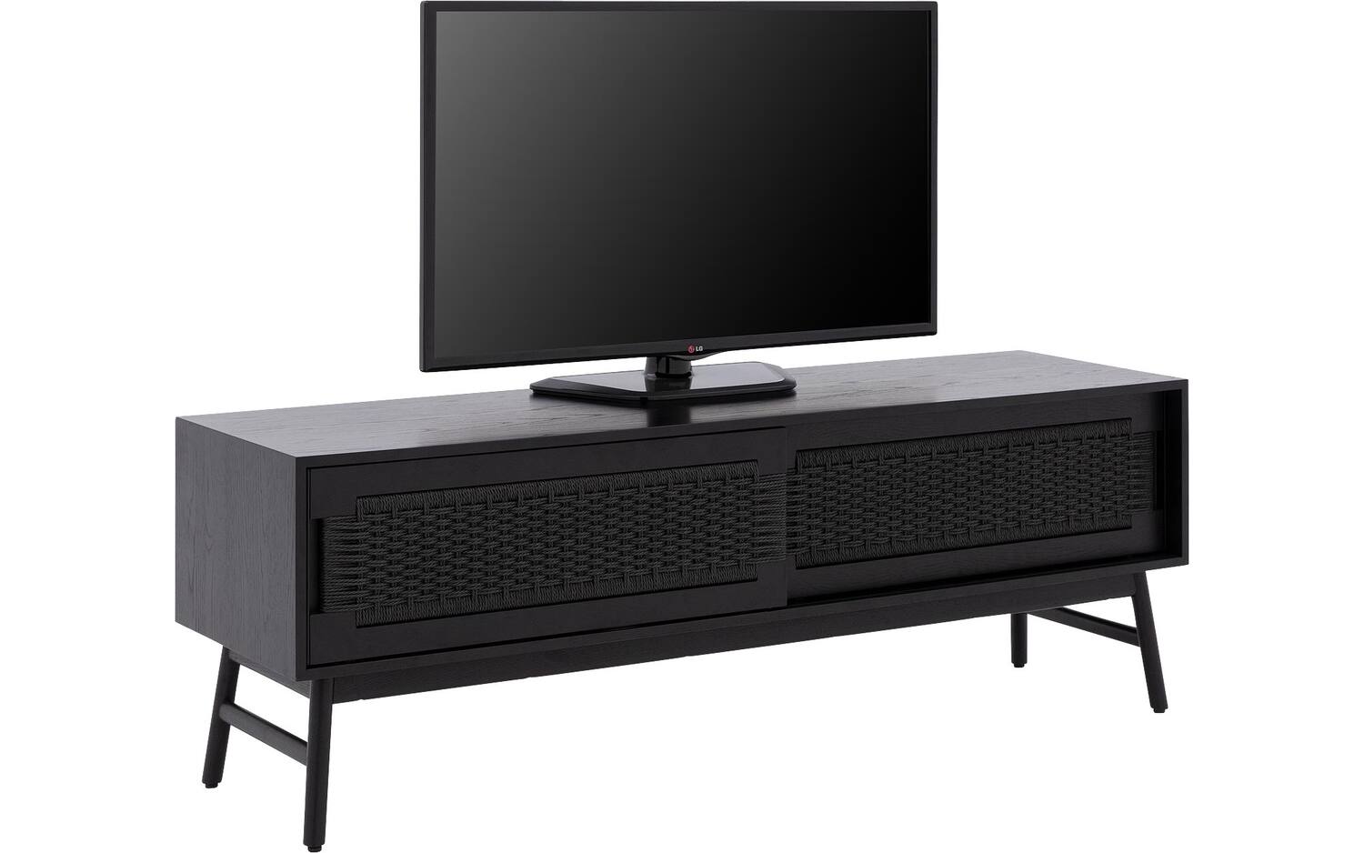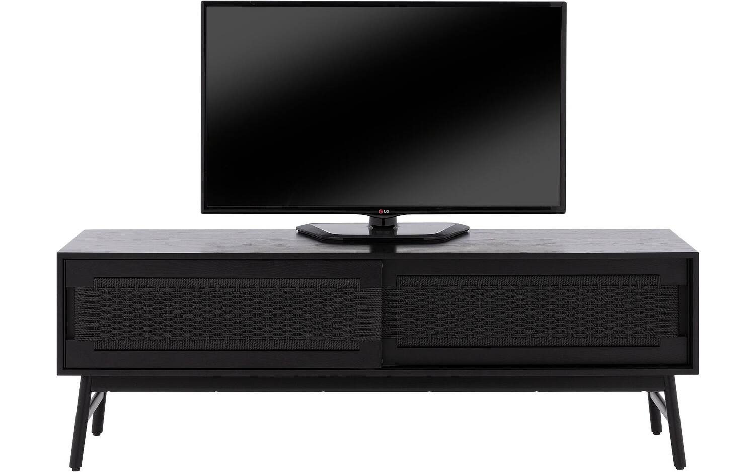 Achter de schuifdeuren vind je voldoende ruimte voor je tv-ontvanger, spelcomputer en andere apparatuur. De gevlochten houtstructuur blijft ook aan de binnenkant zichtbaar, wat zorgt voor een mooie, afgewerkte uitstraling zelfs met open deuren.