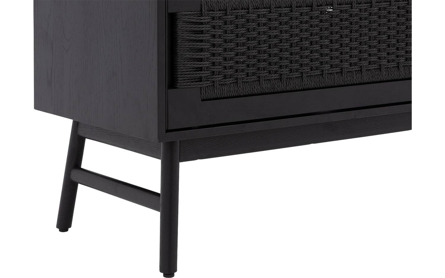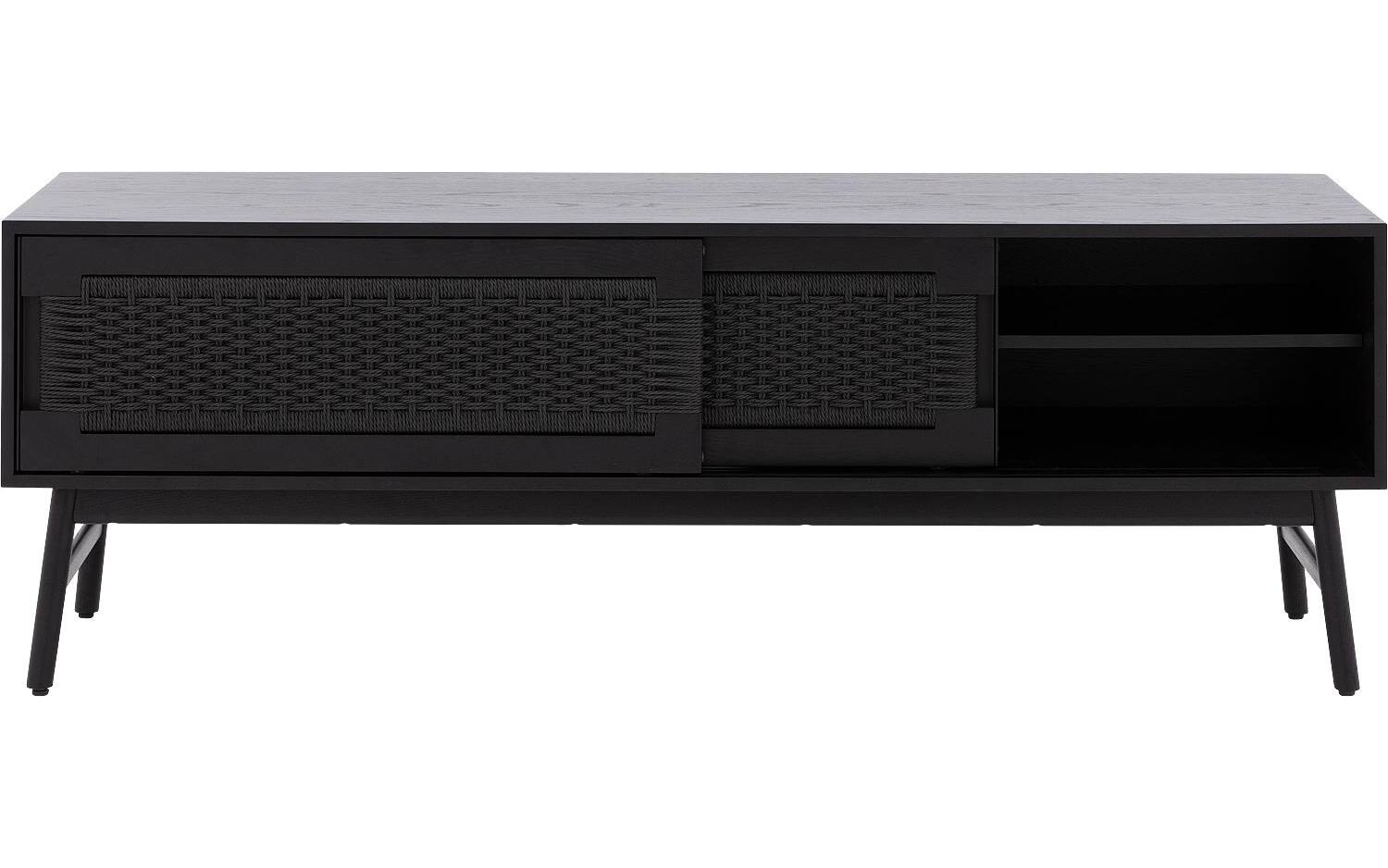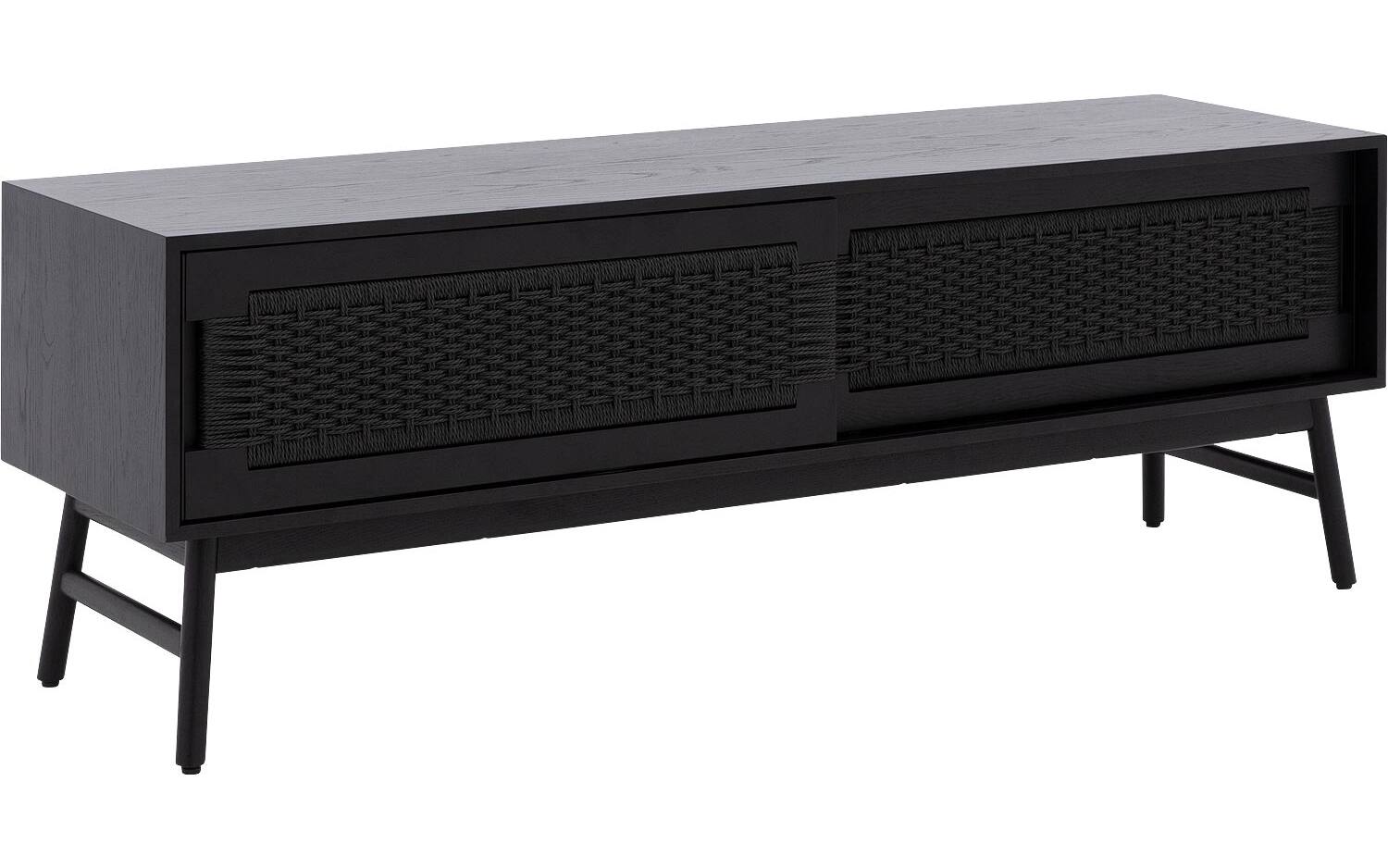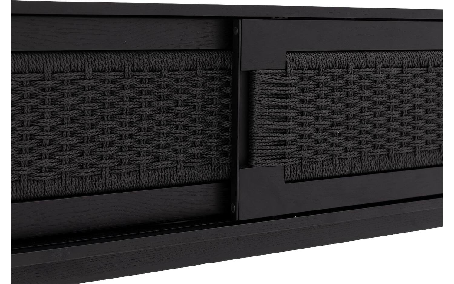 TV meubel Libretto combineert moderne elegantie met praktische opbergruimte voor al je apparatuur. De zwarte gelakte eiken afwerking met gevlochten structuur brengt natuurlijke warmte in je woonkamer, terwijl de handige schuifdeuren zorgen voor een strakke, opgeruimde uitstraling. Een stijlvol statement dat direct sfeer toevoegt aan je interieur.
