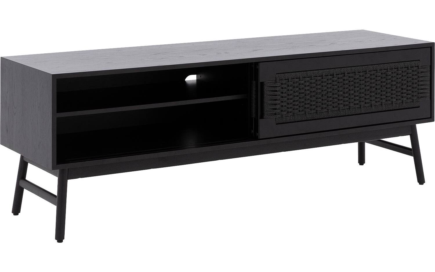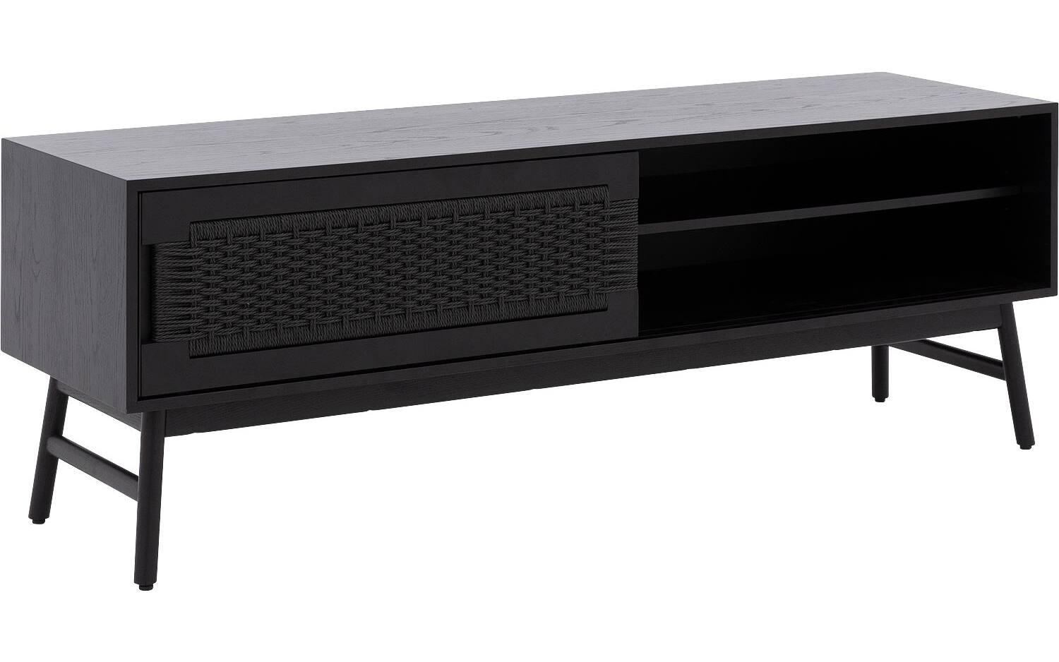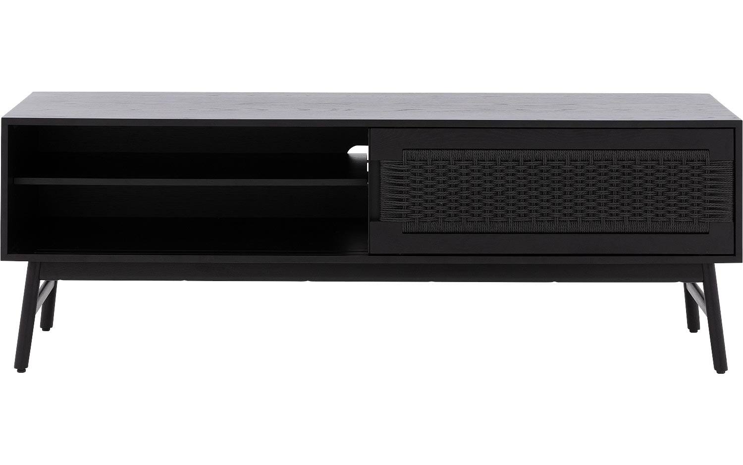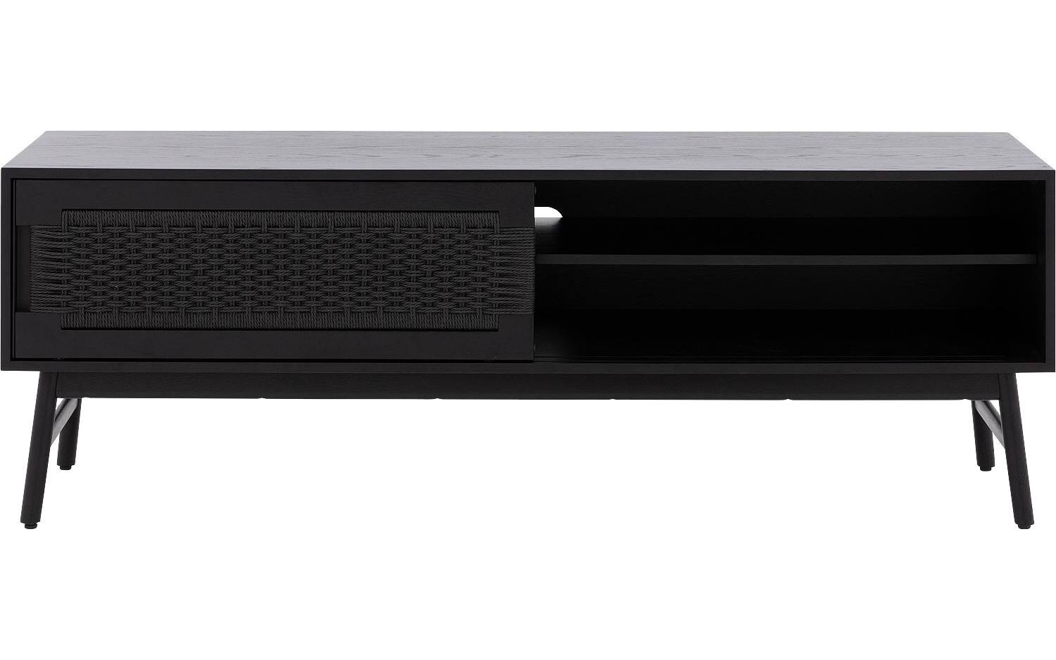 TV meubel Libretto combineert moderne elegantie met praktische opbergruimte voor al je apparatuur. De zwarte gelakte eiken afwerking met gevlochten structuur brengt natuurlijke warmte in je woonkamer, terwijl de handige schuifdeuren zorgen voor een strakke, opgeruimde uitstraling. Een stijlvol statement dat direct sfeer toevoegt aan je interieur.