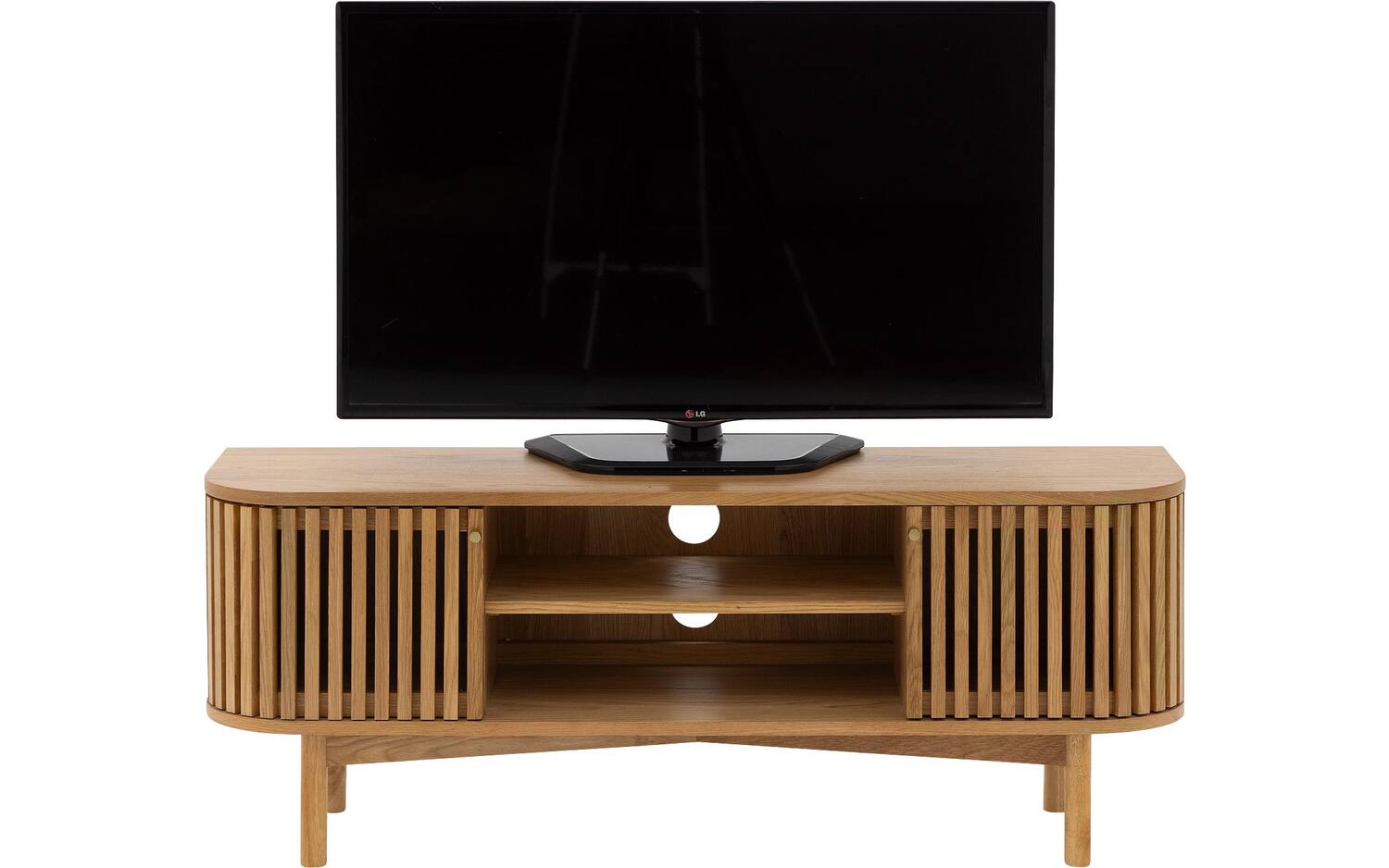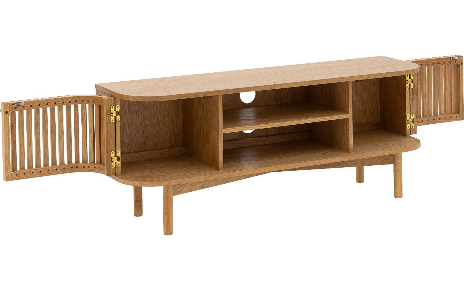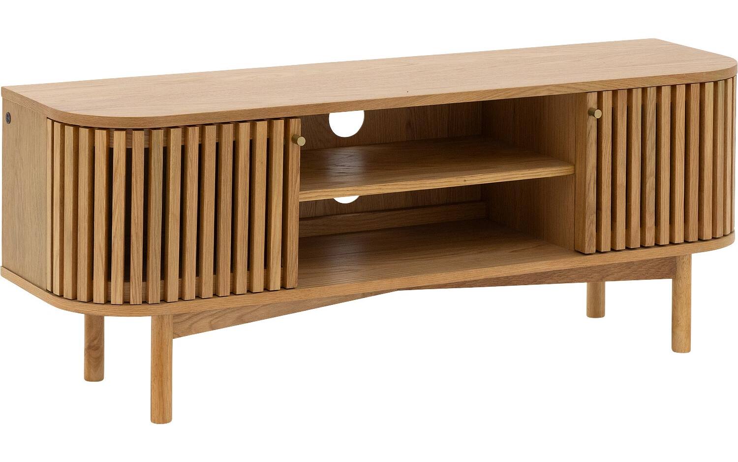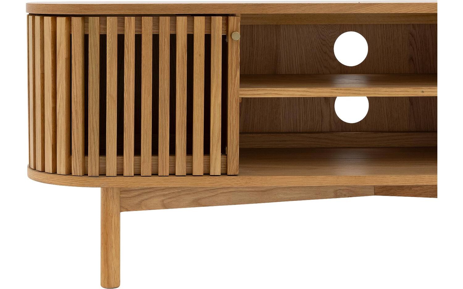 Tv meubel Soho brengt retro charme in je woonkamer met zijn unieke ontwerp vol karakteristieke details. De eiken latten en afgeronde hoeken geven dit blanke tv meubel een warme, tijdloze uitstraling die perfect past bij verschillende interieurstijlen. Dankzij de praktische indeling heb je alle ruimte voor je apparatuur en woonaccessoires.