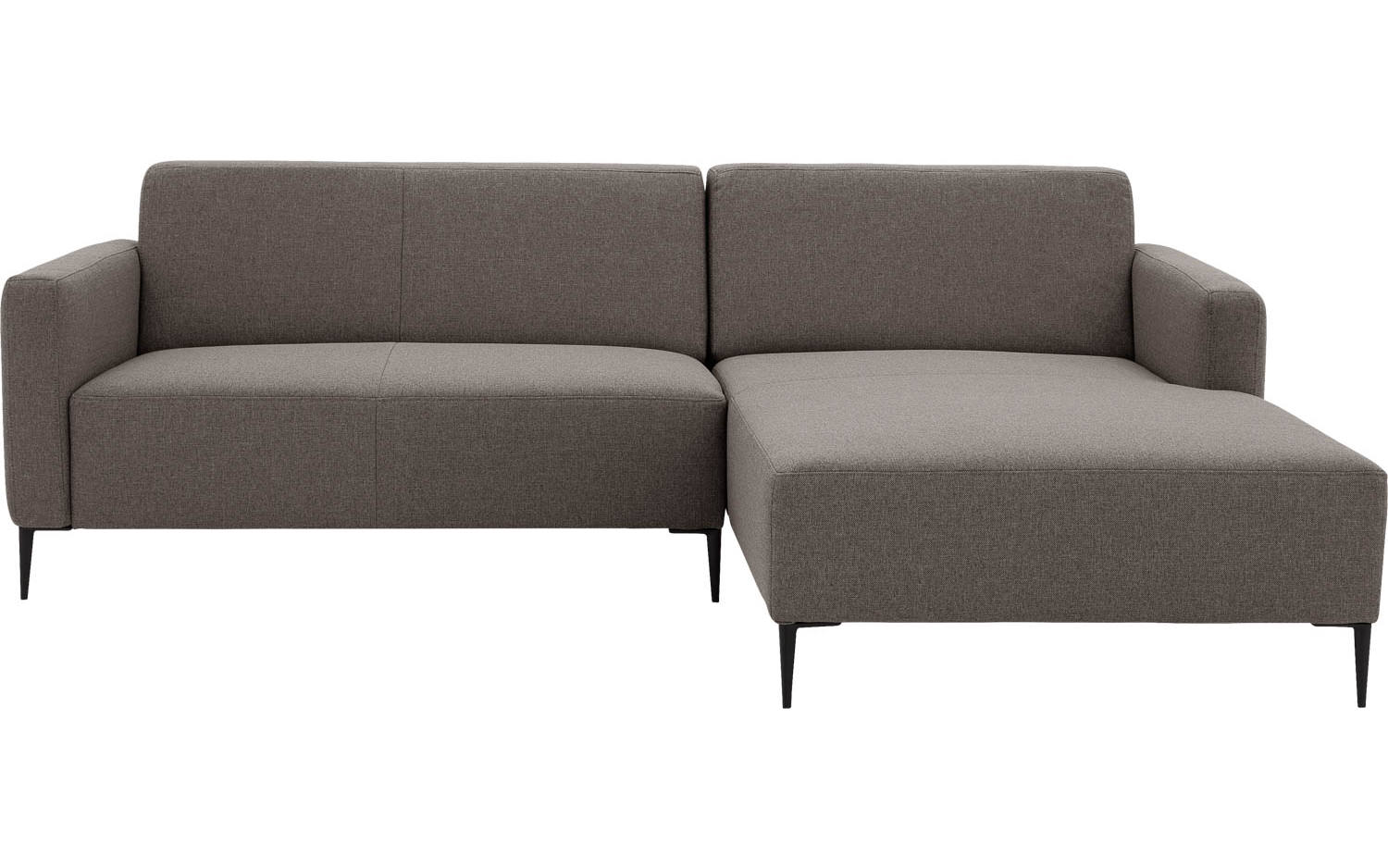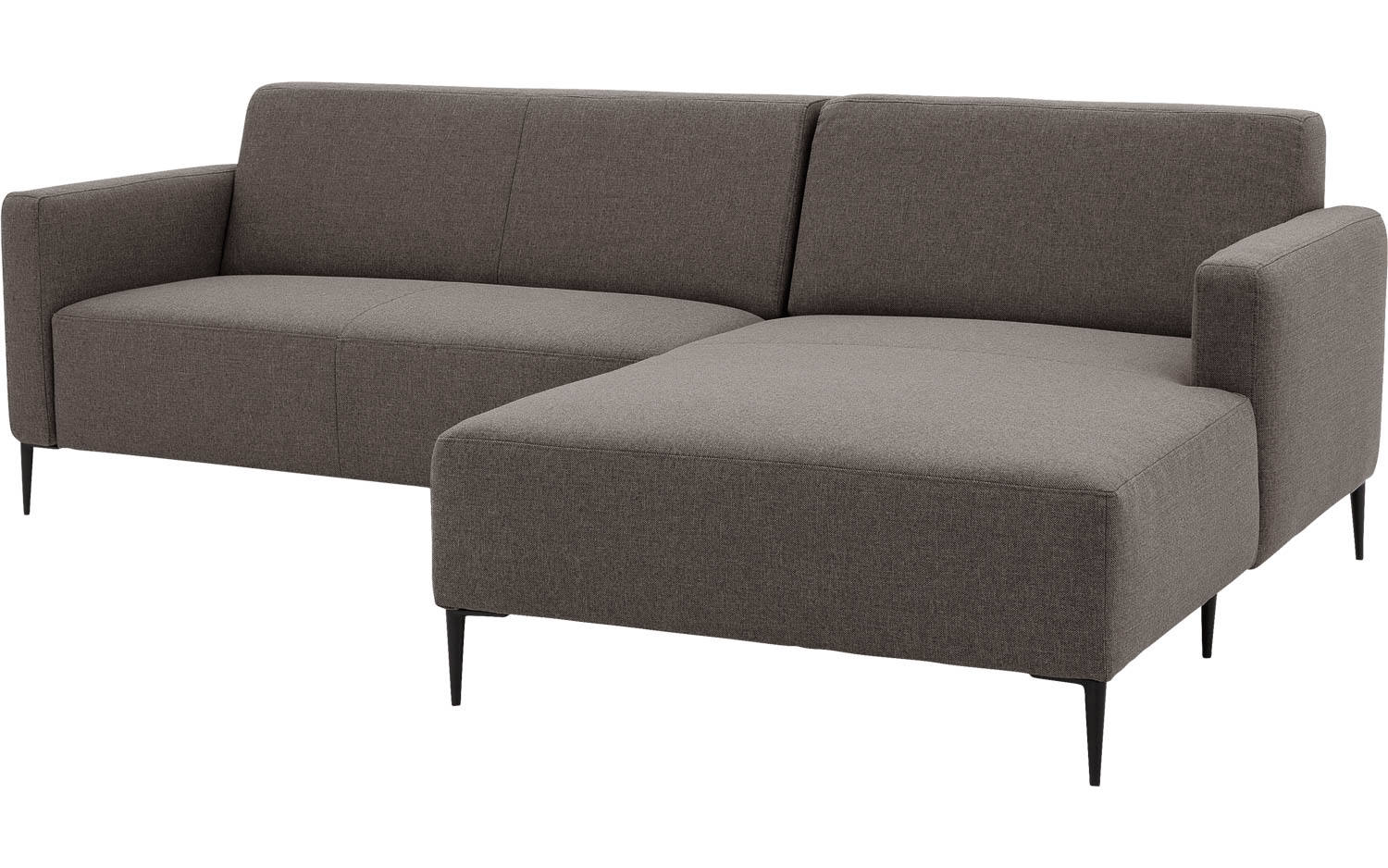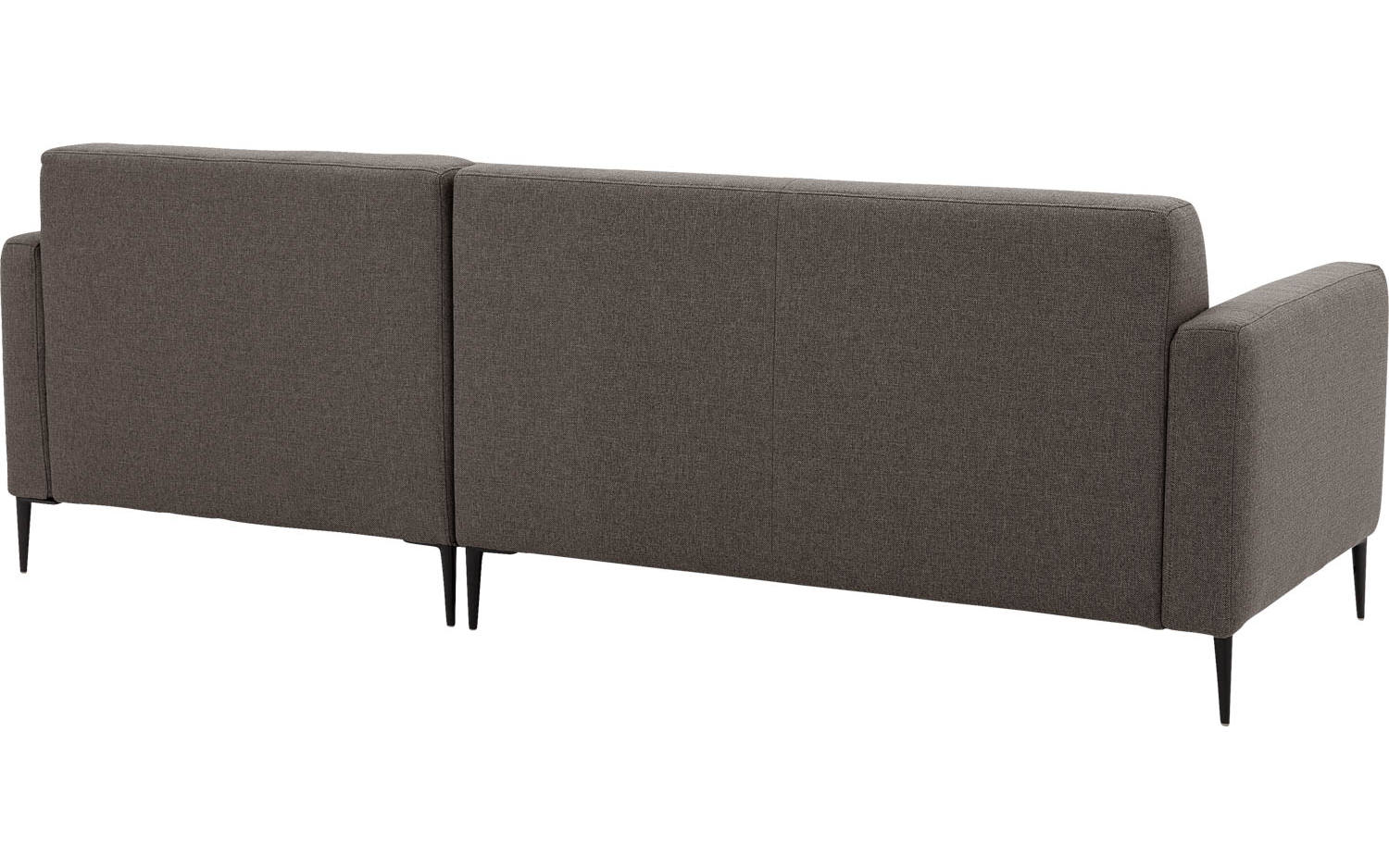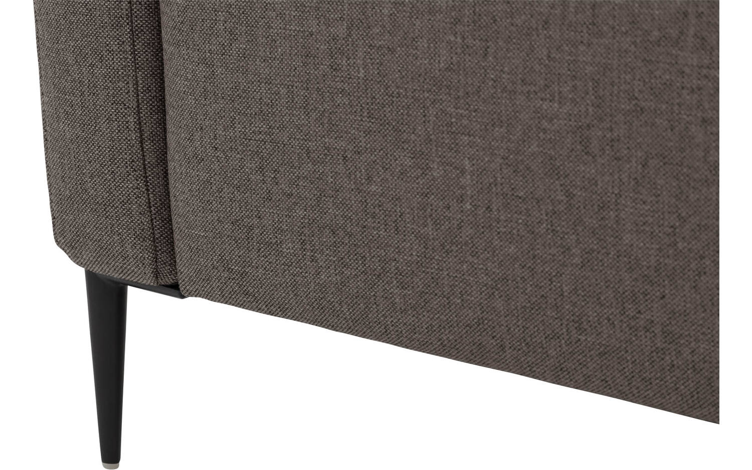 De fijn geweven bruine stof geeft deze hoekbank een warme, natuurlijke uitstraling. De metalen poten met zwarte poedercoating zorgen voor een stoere touch en maken het geheel helemaal af. Door de hoge poten ontstaat een luchtig effect in je woonkamer.