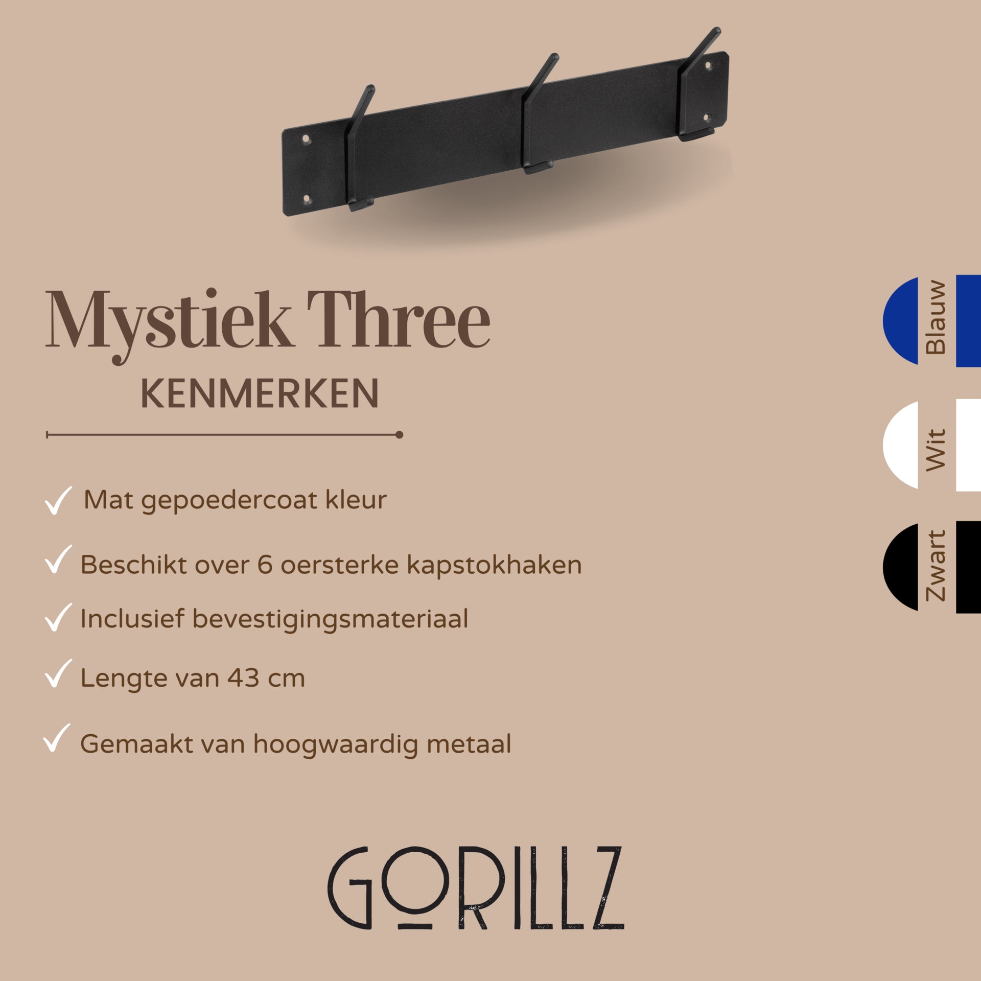 De Gorillz kapstok is uitgerust met dubbele kapstokhaken, waardoor u al uw favoriete jassen, rugzakken en sjaal aan dezelfde kapstok kunt ophangen. Daarnaast kenmerkt de kapstok zich door zijn stijlvolle en strakke design. Hierdoor past de Mystiek Small Three in ieder interieur en kan het altijd en overal toegevoegd worden. De kapstok is verkrijgbaar in twee verschillende kleuren, zijnde zwart en wit.