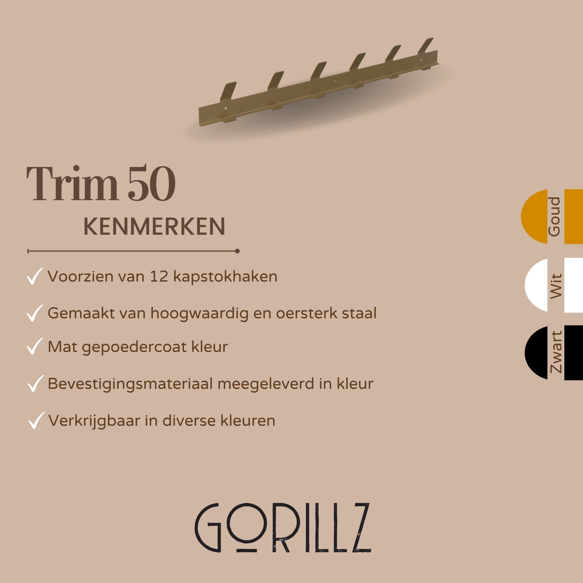 Deze wandkapstok is verkrijgbaar in 3 verschillende formaten in zowel de kleur zwart als wit. Alle modellen van de Trim wandkapstok zijn te combineren met elkaar. Door de modellen naast elkaar te hangen zijn de opbergmogelijkheden oneindig. Zo is de kapstok ook inzetbaar voor ruimtes waar grote groepen mensen samenkomen.