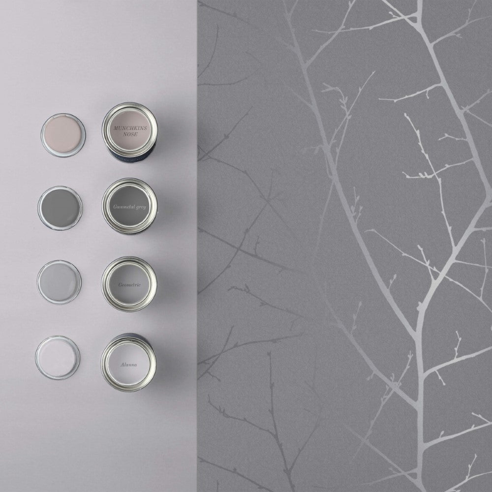 Behang Boreas Deep Grey combineert een rustig kleurenpalet met een klassiek ontwerp. De iconische takken zijn uitgevoerd in metallic zilver en zorgen zo voor een opvallend accent. Dit perfect uitgebalanceerde ontwerp op gevezeld papier zorgt voor rust in je interieur.