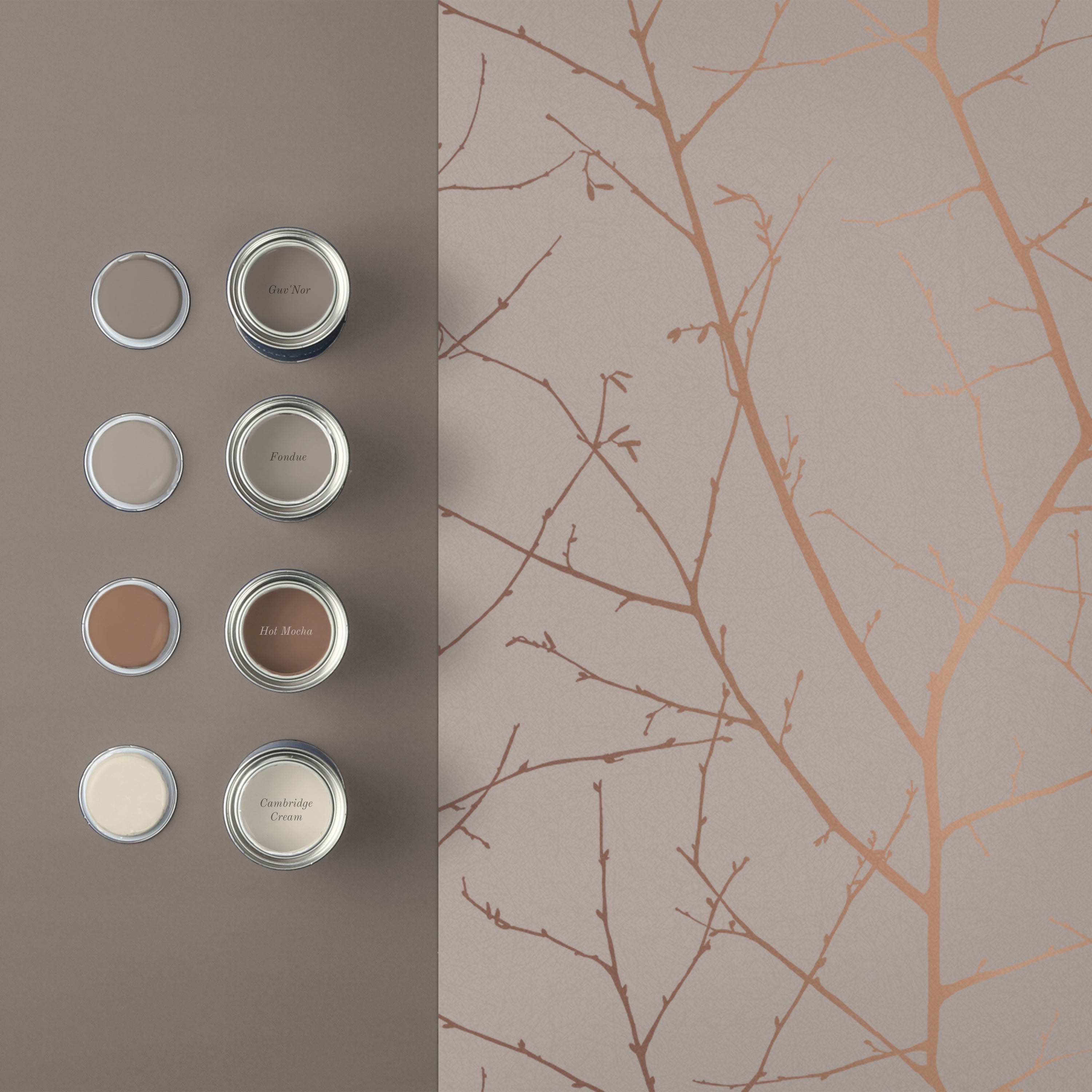 - Probeer ook onze bijpassende verfkleuren, voor de perfecte combinatie tussen verf en behang (zie afbeelding).
