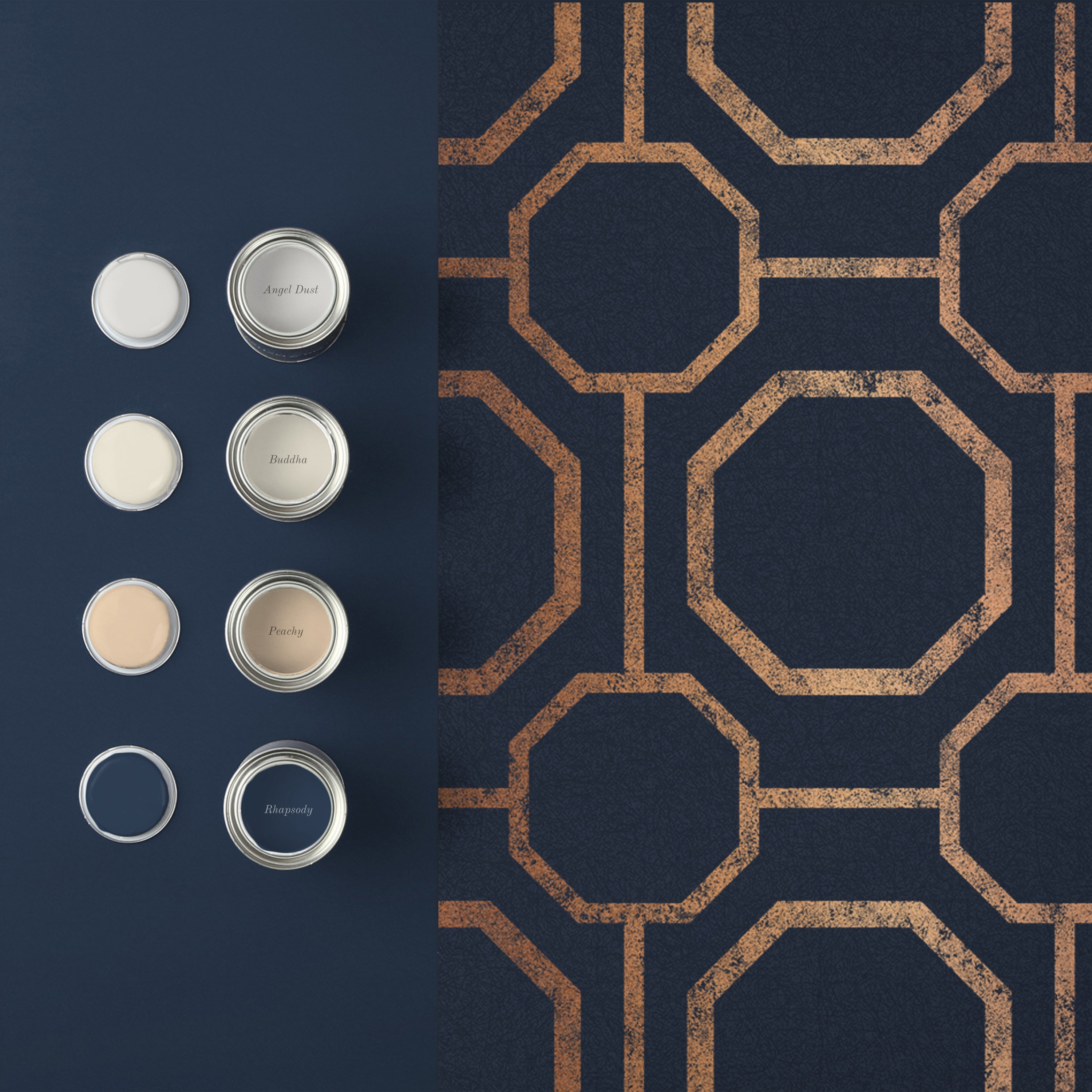 Sashiko Navy behang combineert een diep donkerblauw, getextureerd behang met kopermetallic lijnen. Dit geometrische ontwerp is geinspireerd op Japans borduurwerk. Het kalmerende ontwerp met luxueuze metallic accenten die mooi afsteken tegen de donkere achtergrond, is een tijdloze klassieker.