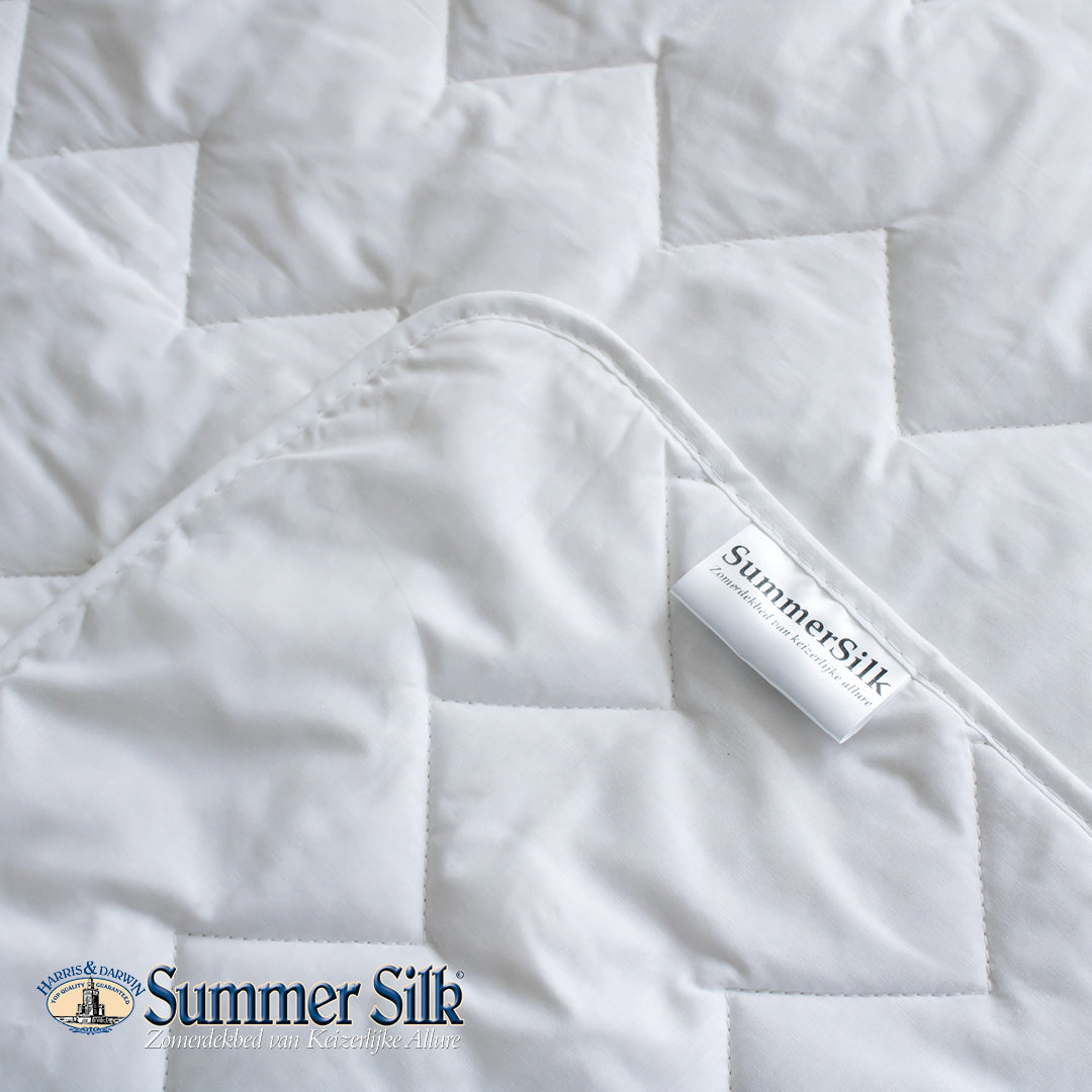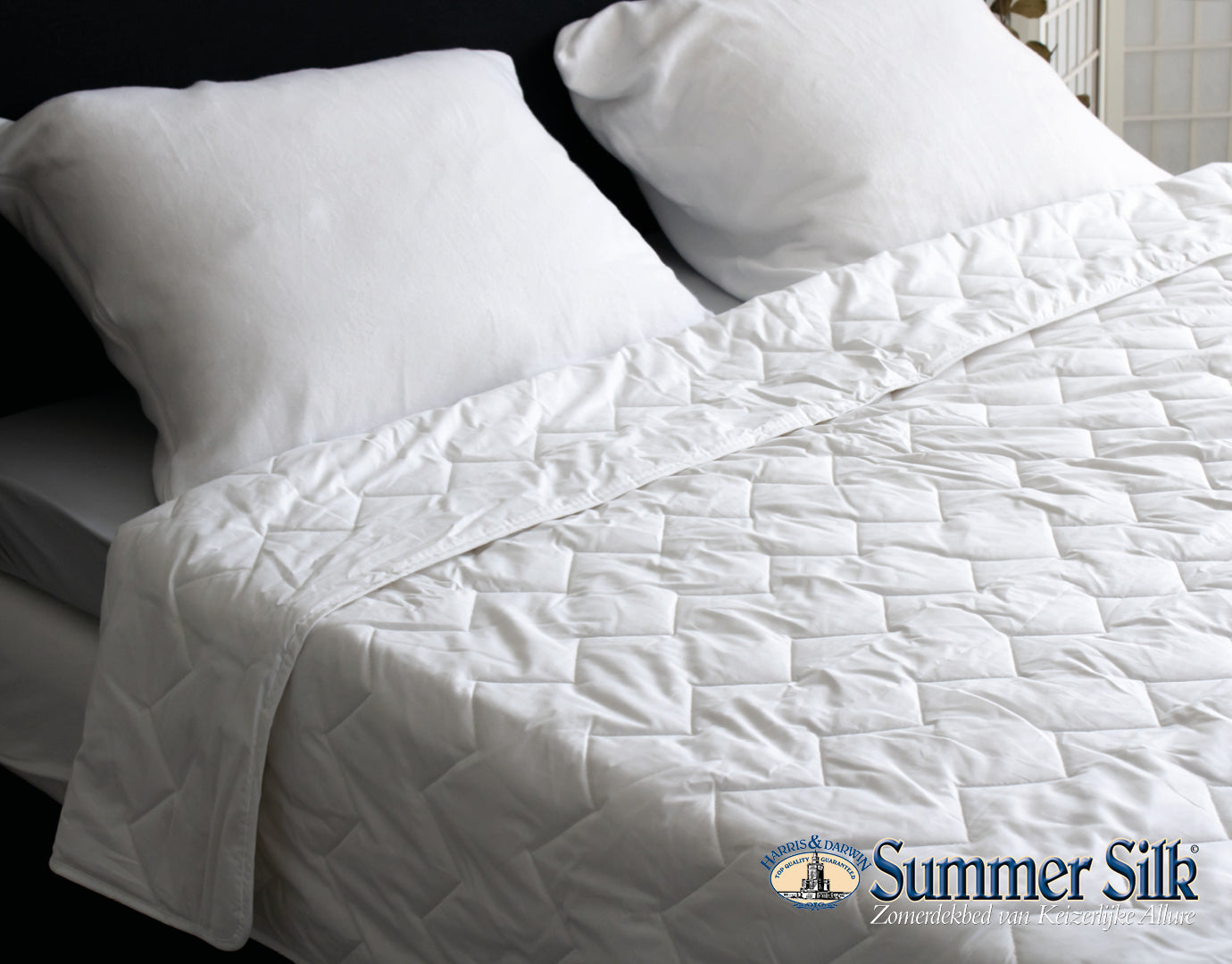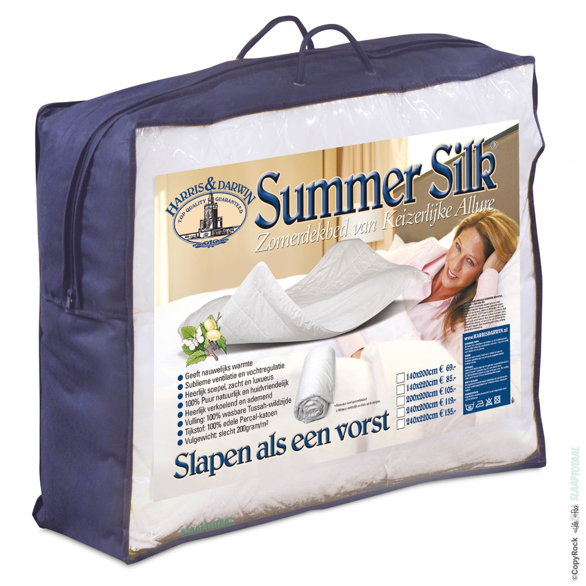 Het heerlijk koele zomerdekbed Harris&Darwin SummerSilk© is ideaal voor warme zomernachten. SummerSilk© is gevuld met originele Tussah-Wildzijde, in flinterdunne en ultralichte uitvoering. Echte Tussah-wildzijde geeft nauwelijks warmte, is extreem vochtverwerkend, en voelt uiterst luxueus. ’n Weelderig gevoel, waar de Chinesche Keizers al verguld van waren. Voel dit gevoel, en u snapt waarom… SummerSilk© is bekleed met een extra koele, natuurlijke tijkstof van 100% Percal-katoen.