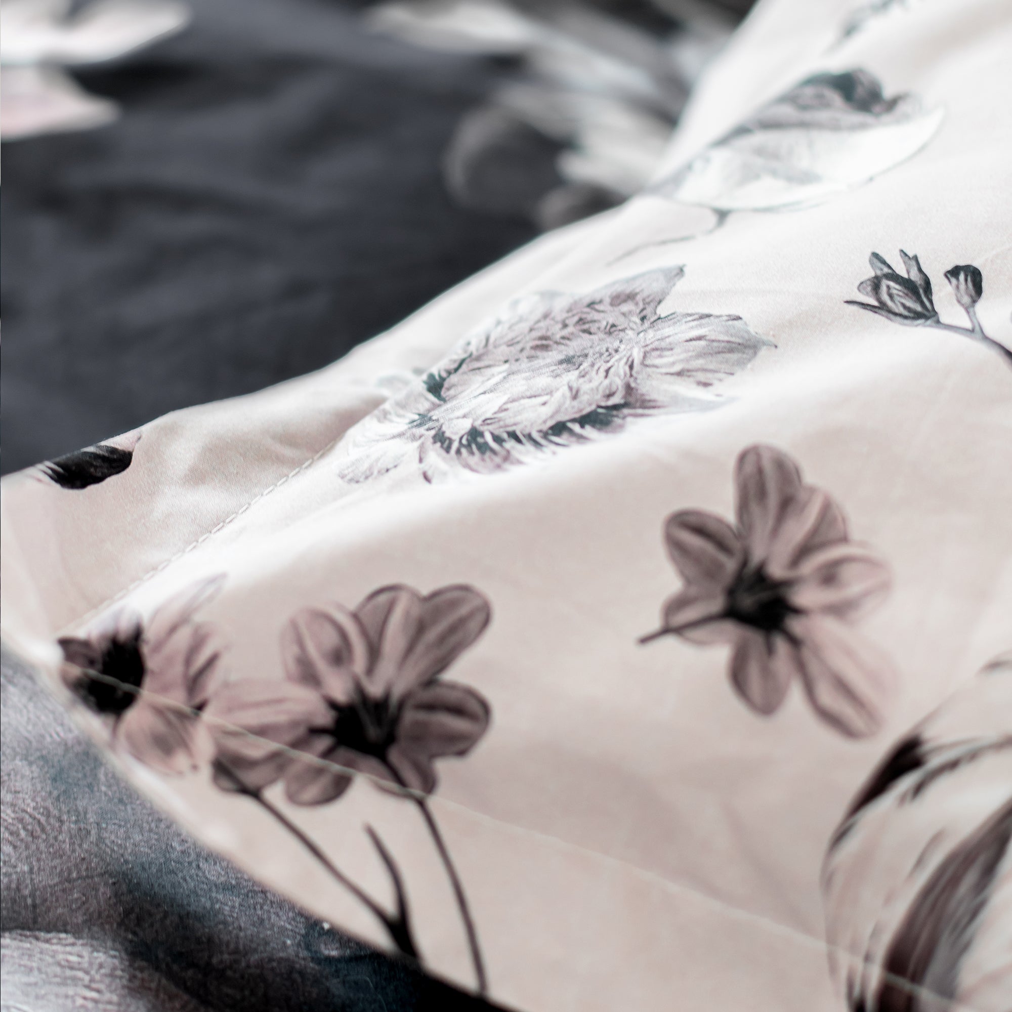 De gedesaturiseerde bloemen en bloemblaadjes op de Onyx kussenhoes uit de Happyfriday collectie doen denken aan een prachtig boeket bloemen dat boven een elegante roze lucht vliegt. Deze zachte kussenhoes van 100% katoen, met een klepsluiting, heeft een volant van 2,5 cm en is aan beide zijden digitaal bedrukt in high definition. De vullingen zijn niet inbegrepen.