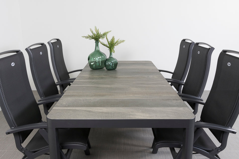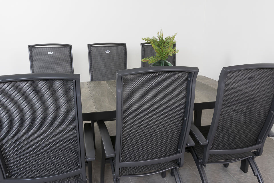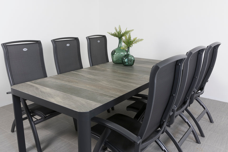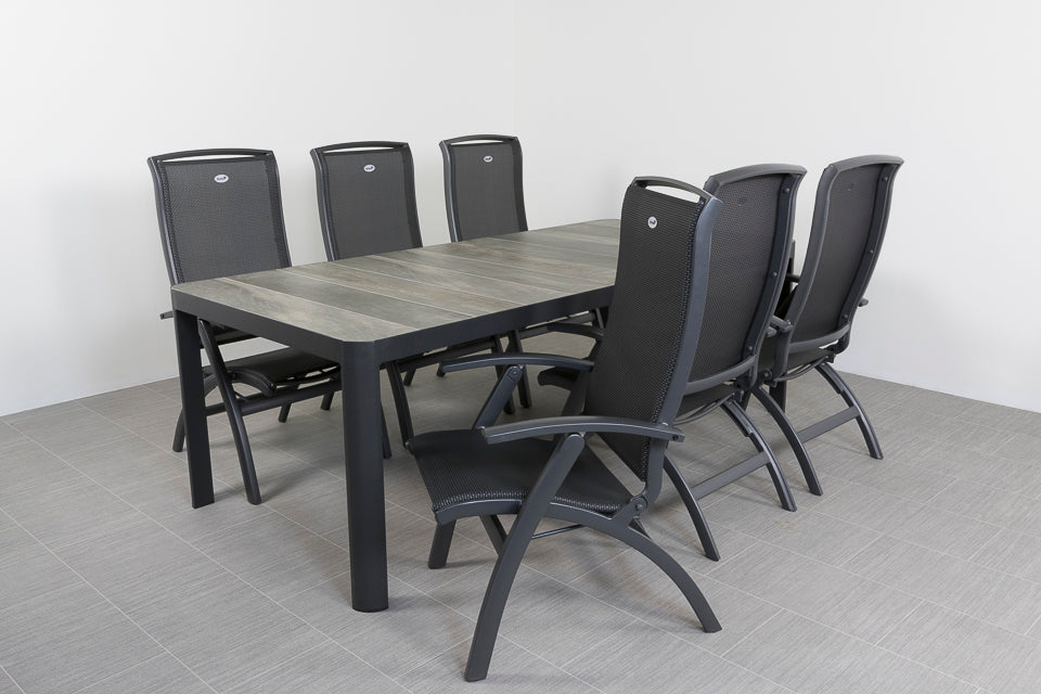 De Queens tuintafel heeft een stevig aluminium frame. Aluminium wordt veel gebruikt in de tuinmeubelindustrie en heeft dan ook vele voordelen. Zo is dit materiaal licht in gewicht, super stevig en onderhoudsvriendelijk. Het frame is afgewerkt met een antracietkleurige coating welke tevens bescherming biedt tegen krassen. Het tafelblad is gemaakt van keramiek, dit is een harde steensoort en dus perfect geschikt als tafelblad. Daarnaast heeft keramiek weinig onderhoud nodig, schoonmaken met een doekje volstaat. Voor een extra stoere uitstraling is het keramiek voorzien van een houtlook print. De Hartman Da Vinci verstelbare tuinstoel is een absolute topper met een stijlvolle uitstraling. Het frame van de verstelbare tuinstoel is gemaakt van aluminium en het rug- en zitgedeelte van textileen. De Hartman Da Vinci standenstoel heeft een extra hoge rugleuning en een royale zitting. Hierdoor is de tuinstoel perfect geschikt voor langere mensen. Het textileen biedt optimaal comfort, hierdoor is het geen must om een kussen in de stoel te gebruiken. De tuinset is onderhoudsarm en bestand tegen diverse weersinvloeden.
