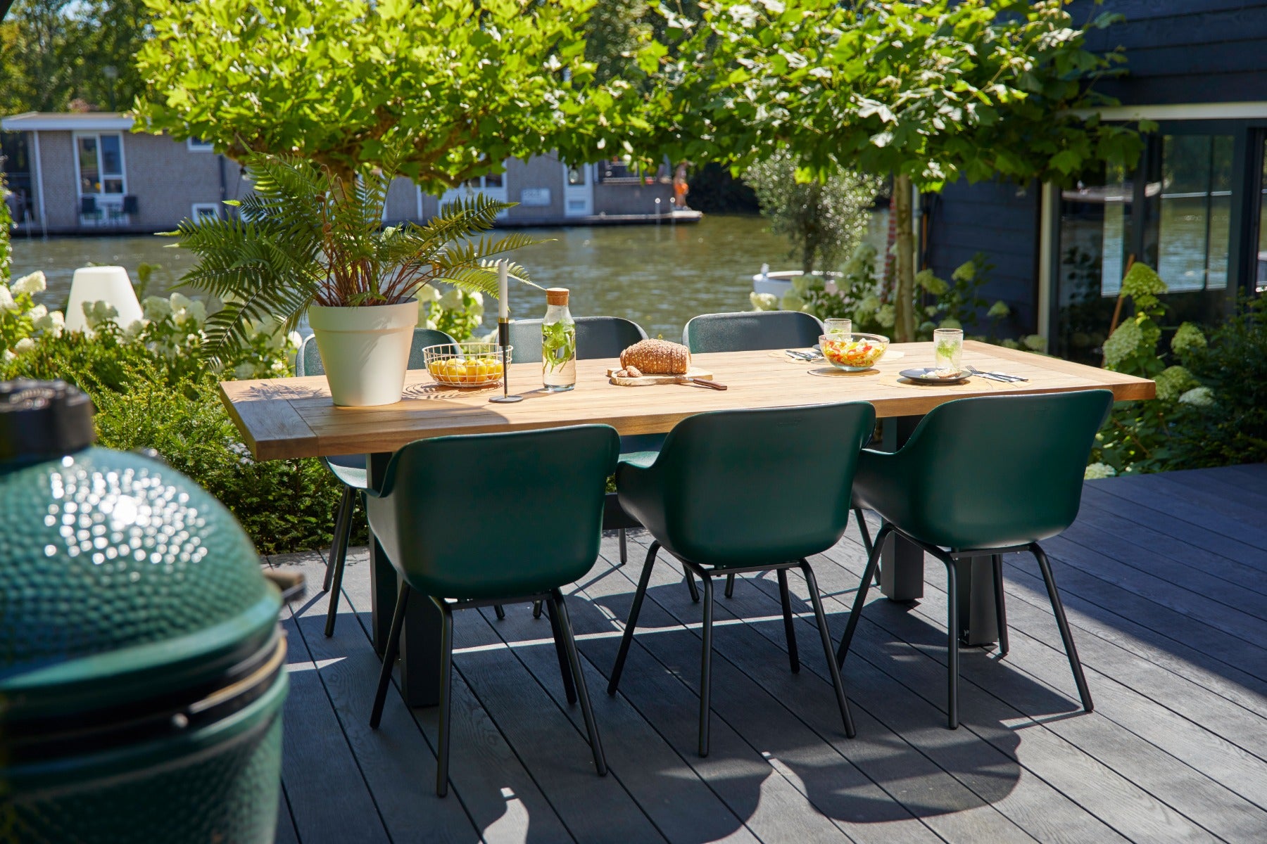 Het tafelblad is gemaakt van teak hout, een sterk en weerbestendig materiaal dat perfect is voor buitengebruik. Na verloop van tijd krijgt het hout een mooie, zilvergrijze tint. Wil je liever de warme, natuurlijke houtkleur behouden? Gebruik dan een speciale teakprotector om het te behandelen. Het aluminium frame in zwart is licht van gewicht, roestvrij en stevig. Dankzij de moderne uitstraling en onderhoudsvriendelijke materialen is deze tafel een praktische en stijlvolle keuze waar je jarenlang plezier van hebt.