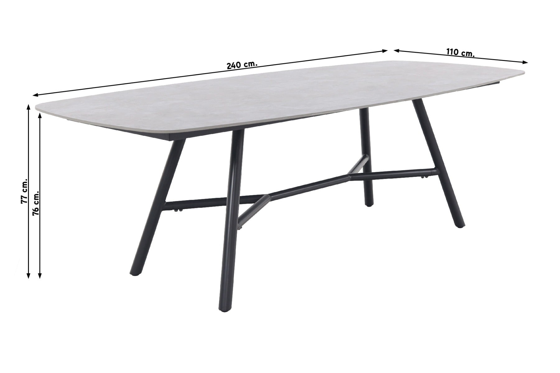 De Hartman Benevento tuintafel heeft een prachtig Deens ovale vorm met een antracietkleurig, 1 cm dik keramisch tafelblad en een stevig aluminium tafelonderstel. Het keramische blad is niet alleen zeer duurzaam en krasbestendig, maar ook onderhoudsvriendelijk en gemakkelijk schoon te maken. Aluminium is ook gemakkelijk te onderhouden en roest niet. Om de levensduur van je tafel te verlengen, raden we aan om de tafel regelmatig schoon te maken met een mild schoonmaakmiddel en water, en deze af te drogen met een zachte doek. Door de afmeting van 240x110 cm. kan je met gemak met 6 personen aanschuiven.
