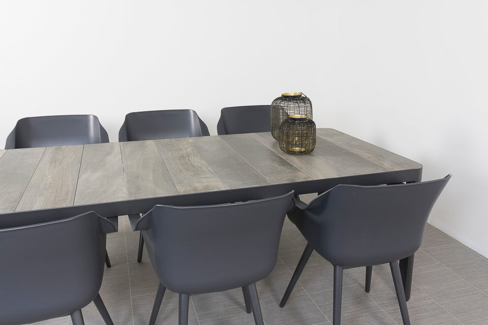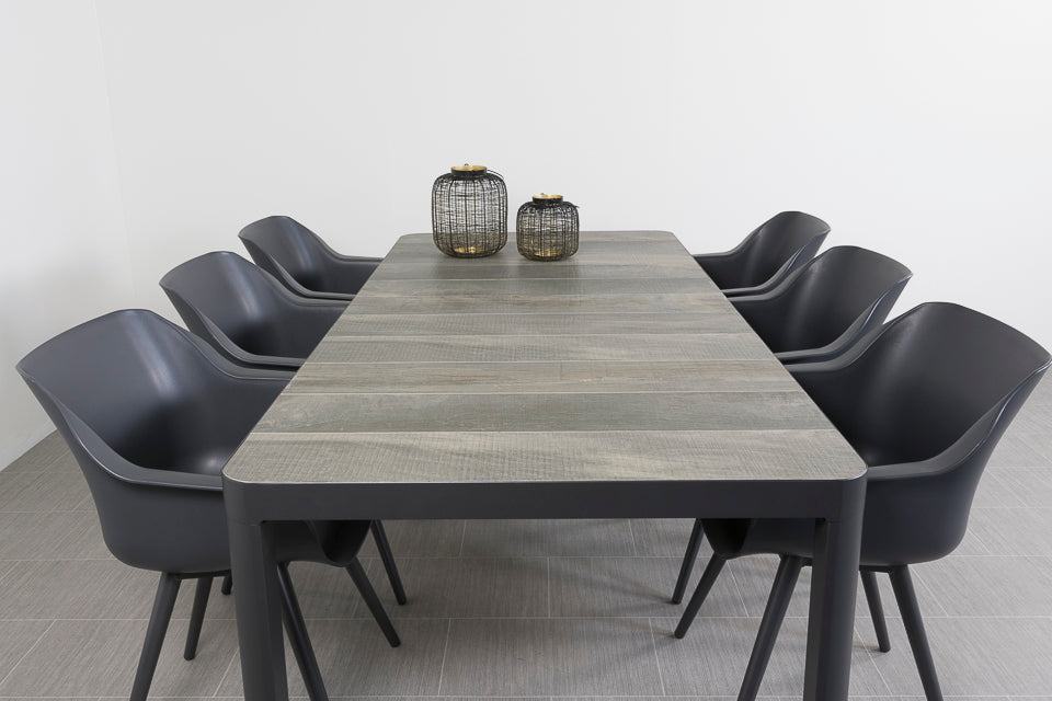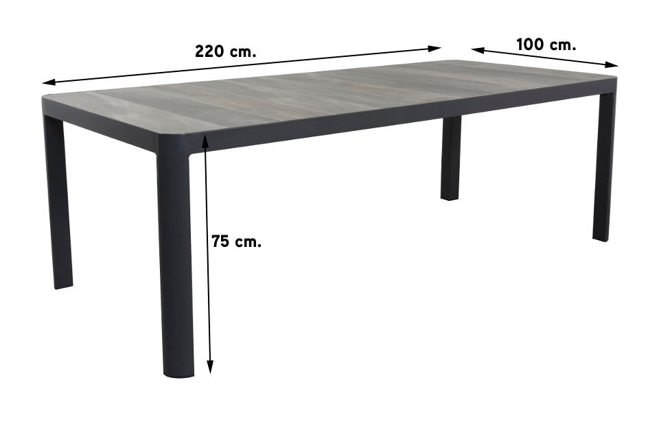 Deze prachtige tuintafel met de afmetingen van 220 x 100 cm. heeft een stevig frame van aluminium. Het aluminium is afgewerkt met een antracietkleurige coating, deze coating zorgt ervoor dat het frame kras- en stootvast is. Het tafelblad is gemaakt van keramiek met een houtlook en geeft de tuintafel een stoer uiterlijk. Keramiek is een harde steensoort en dus perfect geschikt als tafelblad. Daarnaast is het makkelijk te onderhouden en heeft het een lange levensduur.