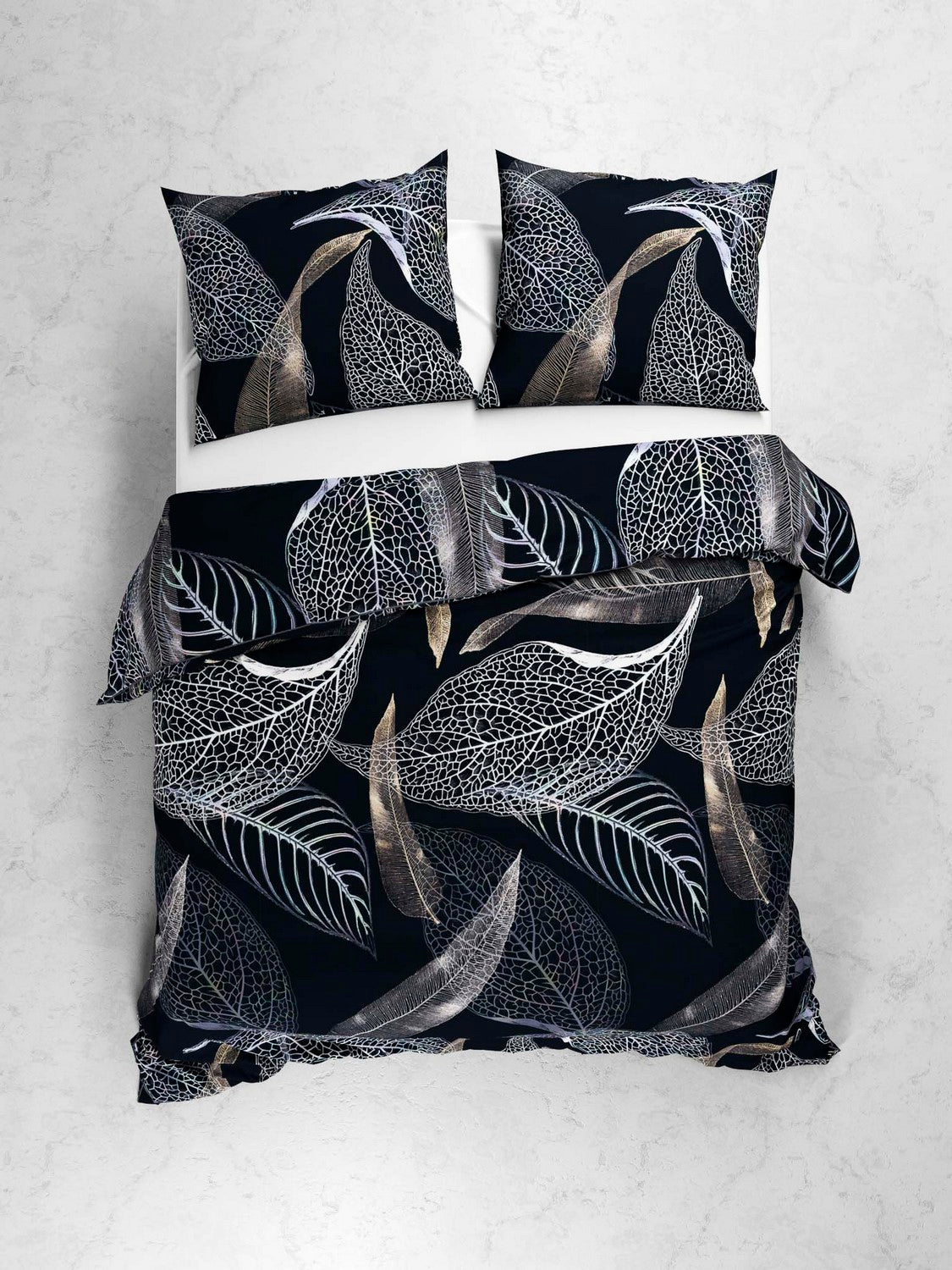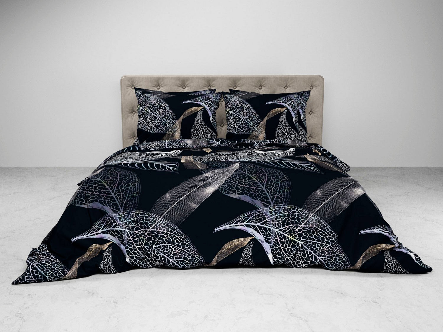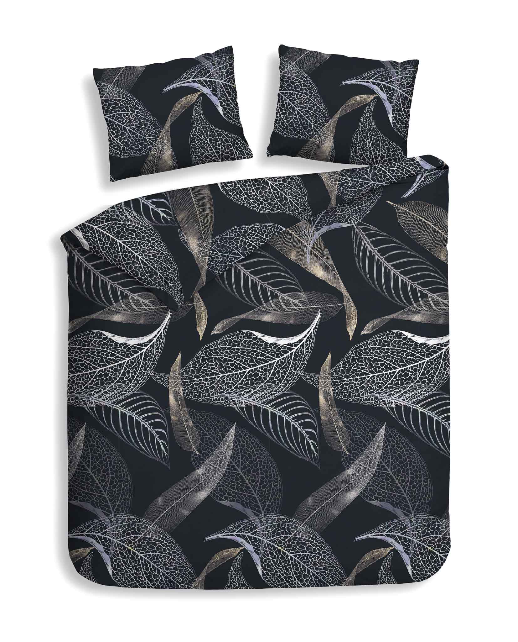 Dekbedovertrek Liba is zwart en heeft een print met verschillende bladeren in donkere kleuren. Op het overtrek is alleen het skelet van bladeren zichtbaar in witte omlijning. Dit geeft een chique uitstraling. Vervaardigd uit 100% hoogwaardig katoen-flanel. Flanel is een fijne stof, omdat het zich snel aan jouw lichaamstemperatuur aanpast. Het materiaal is sterk en vochtabsorberend. Voorzien van een dubbel doorlopende instopstrook. Hierdoor ook geschikt voor extra hoge matrassen.