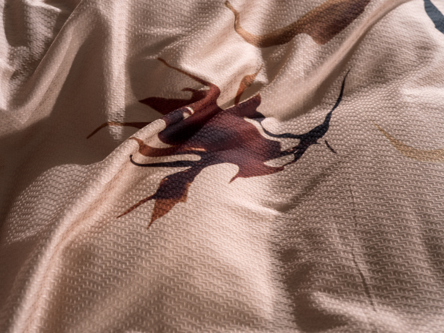 - Design: Multicolour bladerenprint in warme herfstkleuren (bruin, paars, oranje) op een elegante beige achtergrond