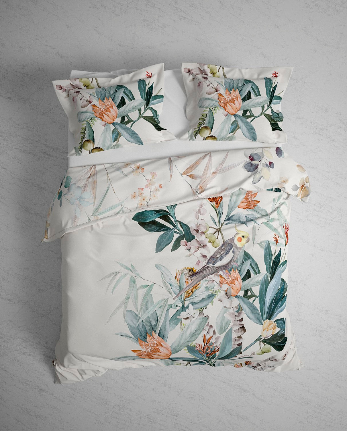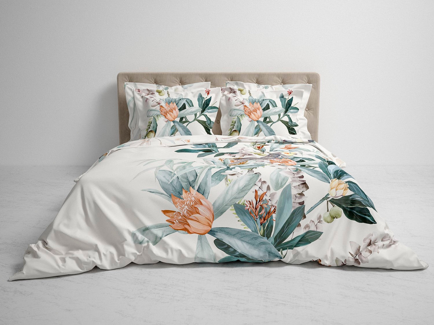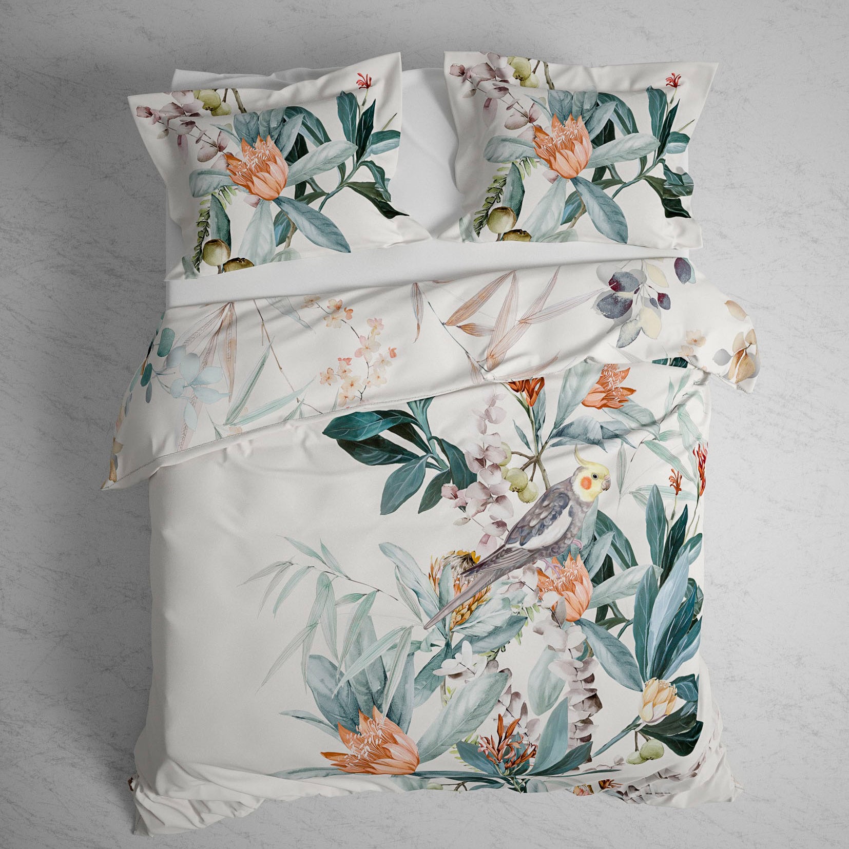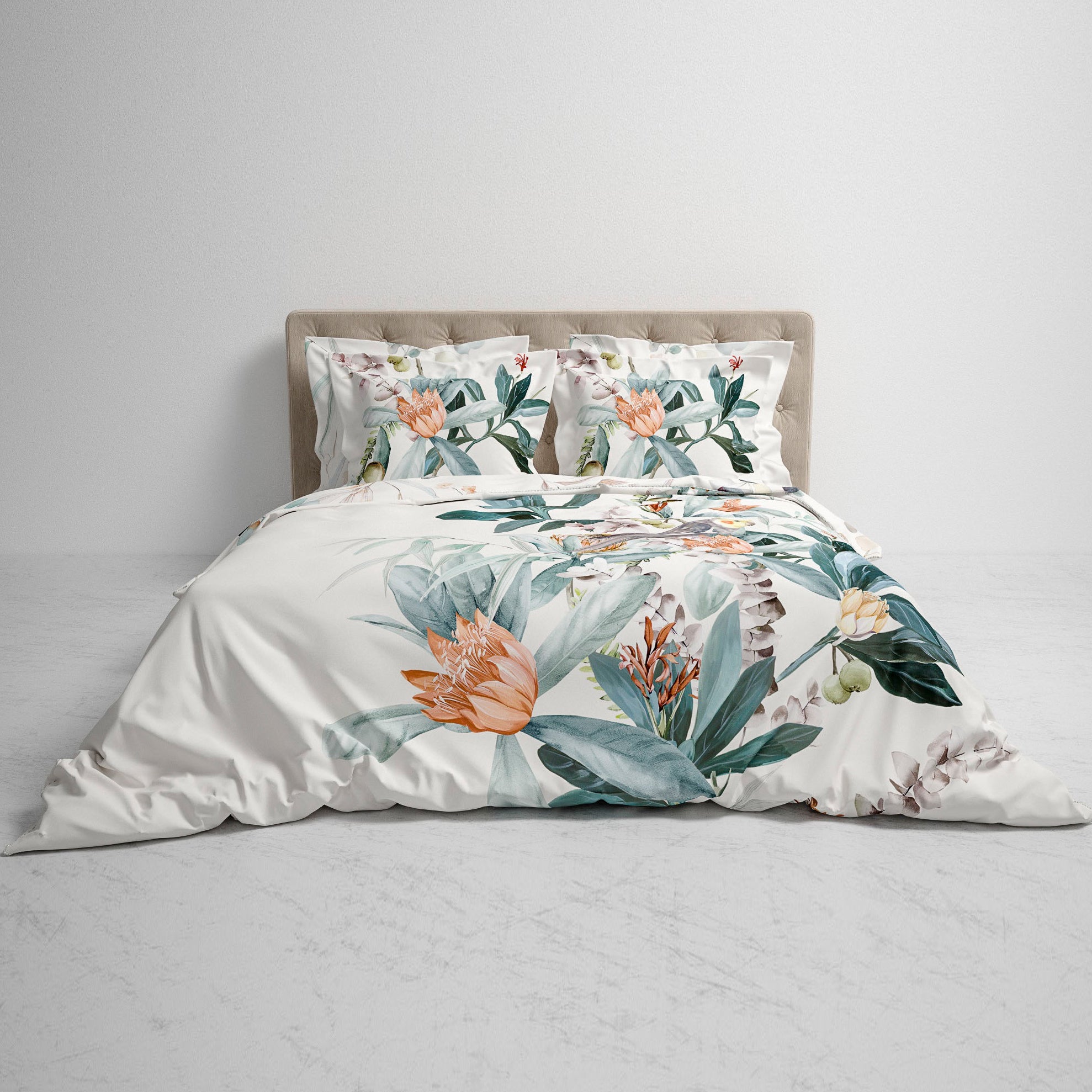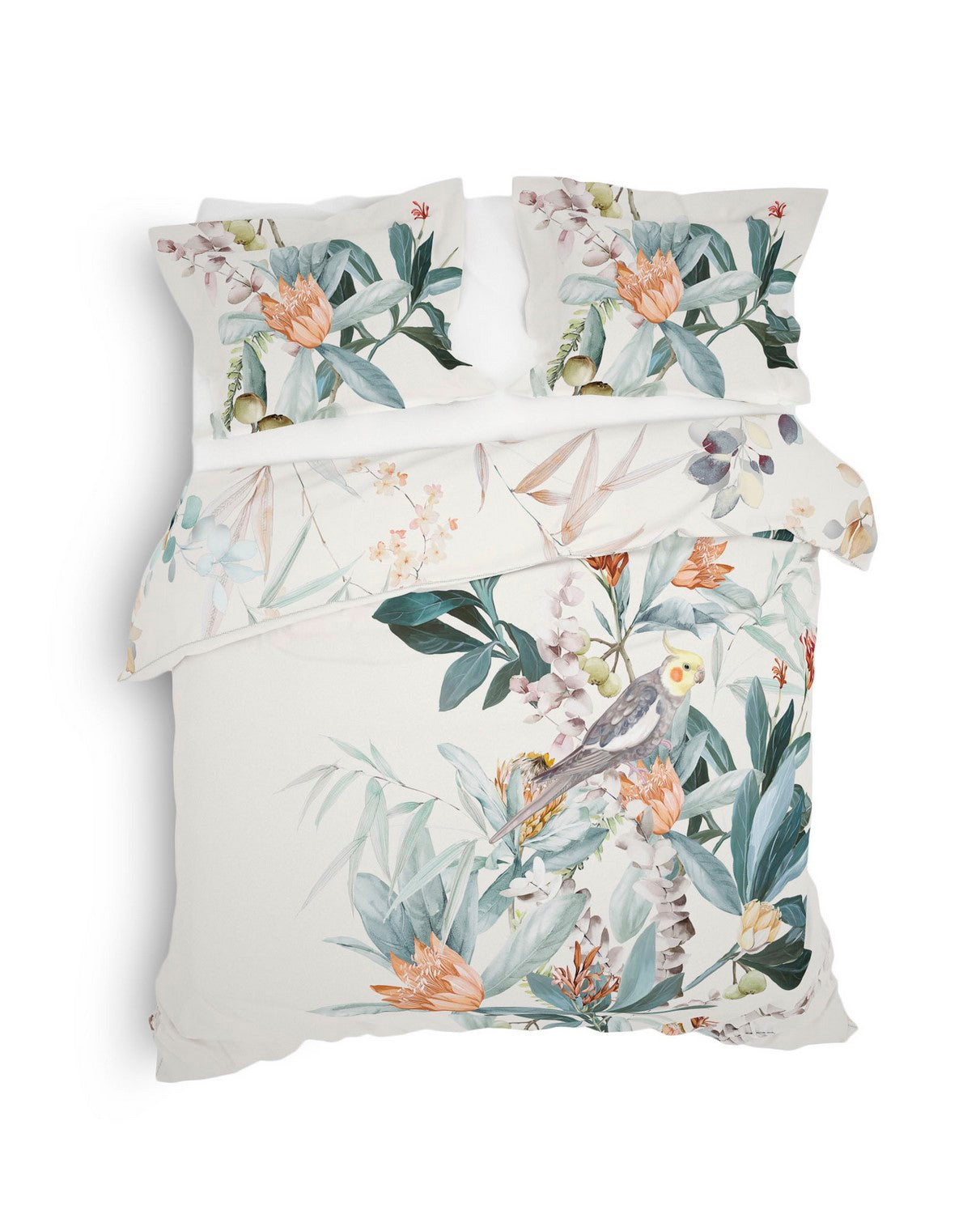 Haal de natuur in huis met dit Antoni dekbedovertrek van het merk Heckett & Lane. Op de voorzijde van dit dubbelzijdige overtrek zijn exotische planten en bloemen met een parkiet in het midden te zien. Op de achterzijde zijn dezelfde bladeren te zien, maar dan in een subtielere print. Dit fraaie natuur dekbedovertrek is gemaakt van 100% katoen-satijn, wat het koel maakt in de zomer en warm in de winter. Katoen-satijn voelt heerlijk zacht aan en is ademend en vocht absorberend. Door de satijnbinding krijgt het overtrek zijn subtiele glans en komt de print nog mooier uit. Het overtrek heeft het GOTS (Global Organic Textile Standard) keurmerk. Het overtrek komt met bijpassende kussenslopen, die voorzien zijn van een stijlvolle Oxford-rand. Daarnaast is heeft het overtrek een dubbele instopstrook, waardoor het ook geschikt is voor langere dekbedden.