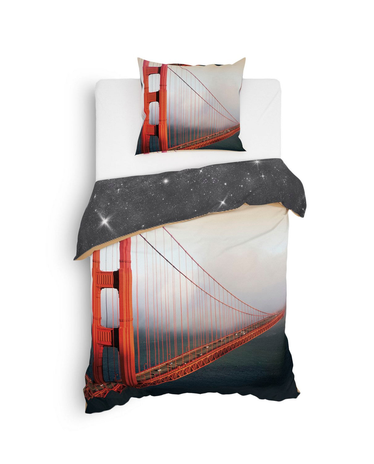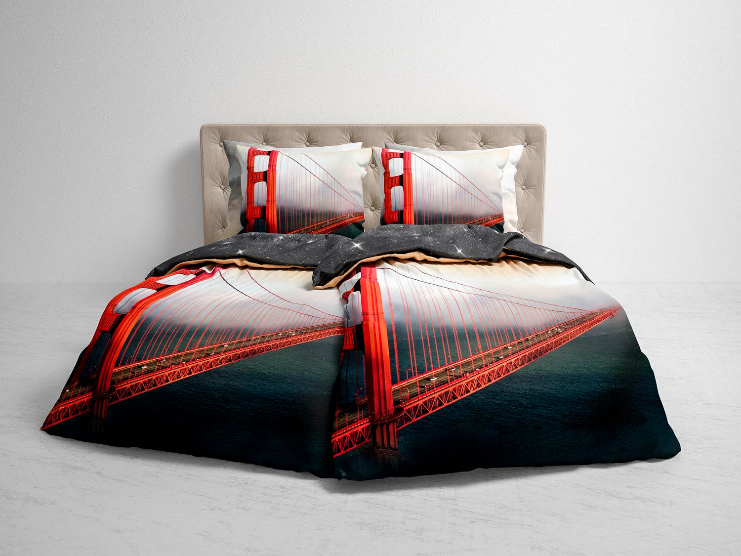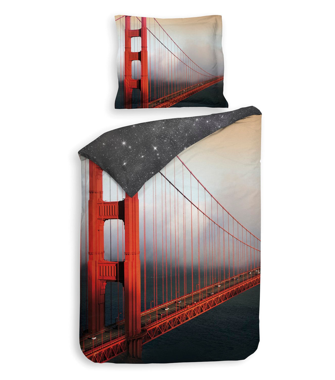 Dekbedovertrek Monty van het luxe merk Heckett & Lane heeft twee prachtige prints. Op het overtrek wordt de grote rode Golden Gate Bridge in San Francisco afgebeeld. Het einde van de brug is niet zichtbaar door de mist. Dit geeft het overtrek een heel tof effect. De andere kant van het dekbedovertrek heeft een print met zonsondergang, wolken en sterren. Het staat speels om het overtrek aan de bovenkant om te slaan. Je ziet dan een stuk van de hemel van het dessin aan de andere kant. Gemaakt van 100% hoogwaardig katoen-satijn. Door de satijnbinding krijgt het overtrek een subtiele glans. Dit geeft het dekbedovertrek een luxe uitstraling. Inclusief kussensloop(en) met beide prints. Voorzien van een dubbele doorlopende instopstrook over de gehele breedte. Hierdoor ook geschikt voor extra lange dekbedden.