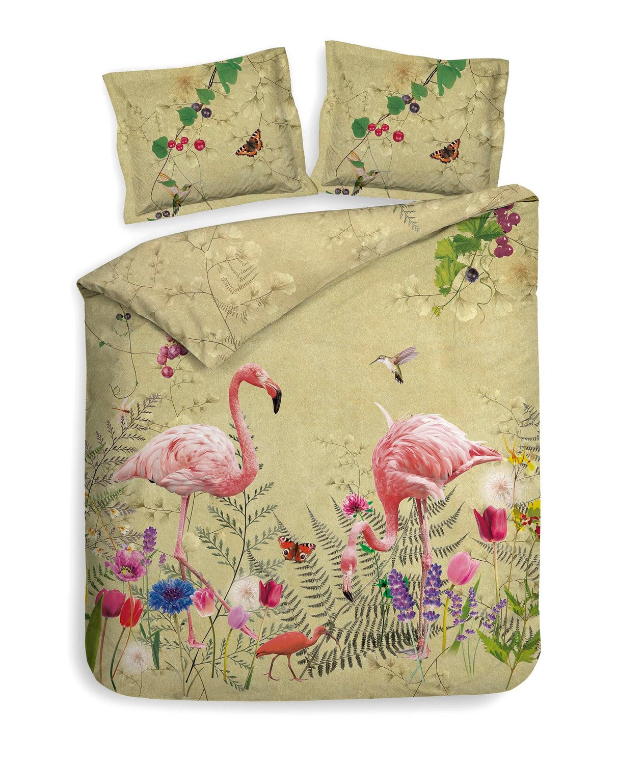 Met dit Reno dekbedovertrek van Heckett & Lane haal je de zomer in huis. De vrolijke afbeelding is voorzien van opvallende flamingo’s, bloeiende bloemen, fladderende vogels en fleurige vlinders. Dit alles is te zien op een mooie gele ondergrond. Dit overtrek is dubbelzijdig. Op de achterzijde is een subtieler design te zien met varens. Dit overtrek is gemaakt van 100% katoen satijn en voelt hierdoor heerlijk zacht en soepel aan. Daarnaast heeft het een luxe uitstraling door de glans. Het overtrek is voorzien van een GOTS (Global Organic Textile Standard) keurmerk, wat inhoudt dat het op milieuvriendelijke wijze geproduceerd is. Dit overtrek is voorzien van een dubbele doorlopende instopstrook en komt met bijpassende kussenslopen.