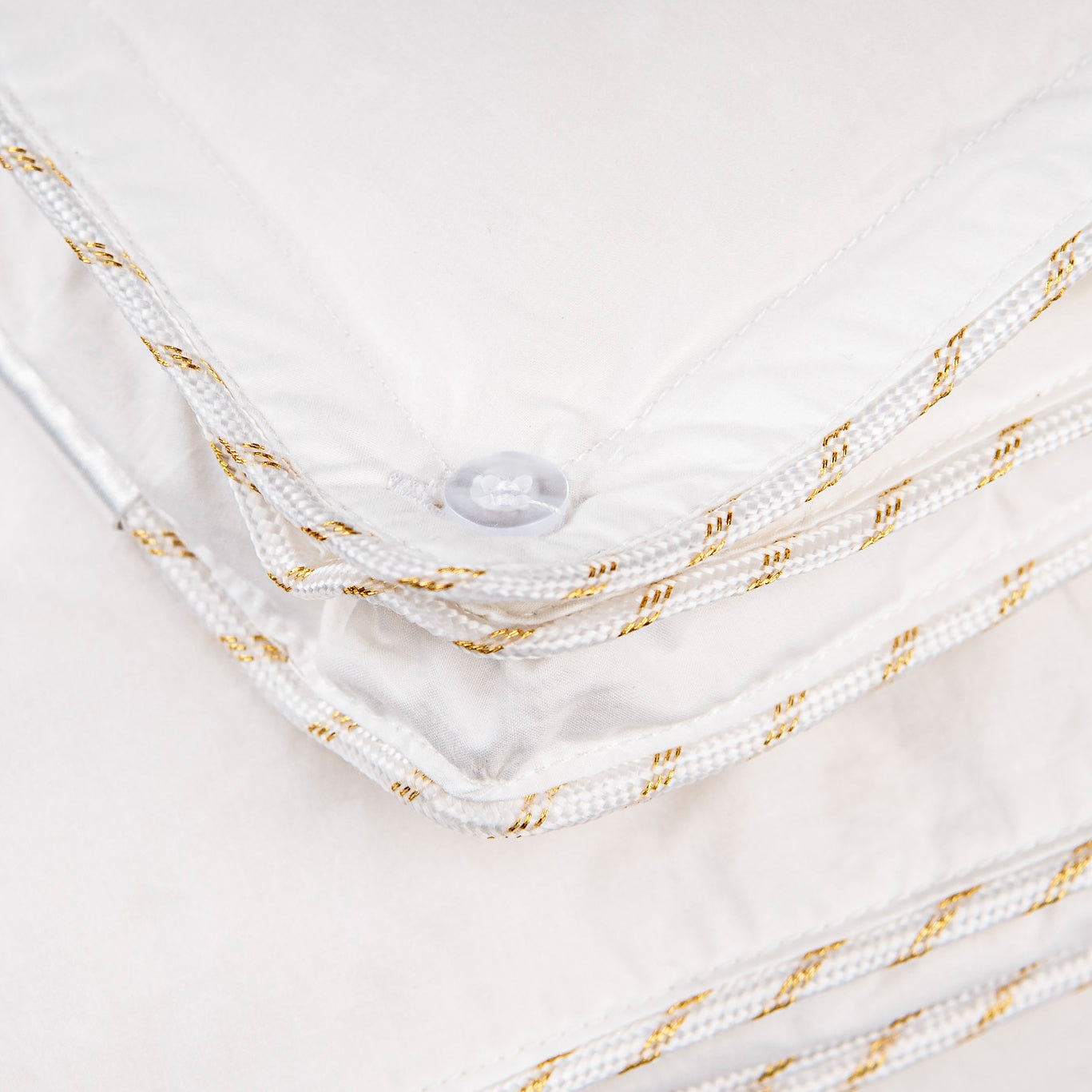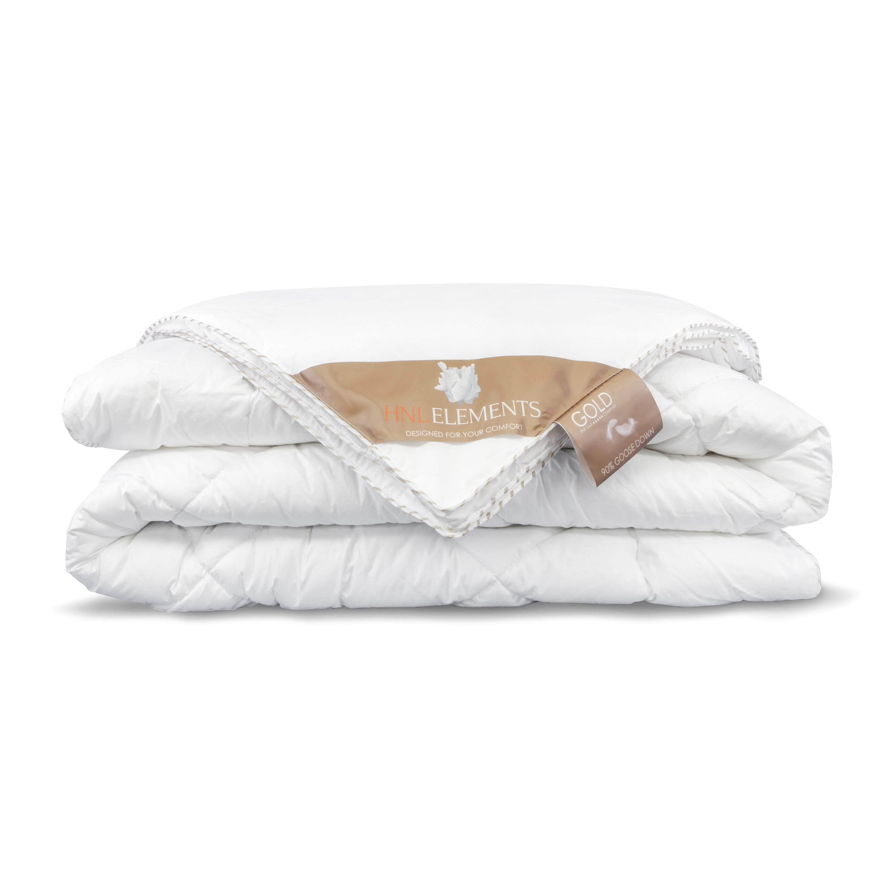 Waarom dan ganzendons? De donsvlokken die ganzen produceren zijn groter dan die van eenden. Daardoor is er minder vulling nodig voor dezelfde isolatie, wat zorgt voor een lichter dekbed en dát creëert weer extra slaapcomfort. Het Gold dekbed heeft een vulling van 90% ganzendons en 10% ganzenveertjes en zal lichter aanvoelen dan dekbedden met eenzelfde percentage eendendons.