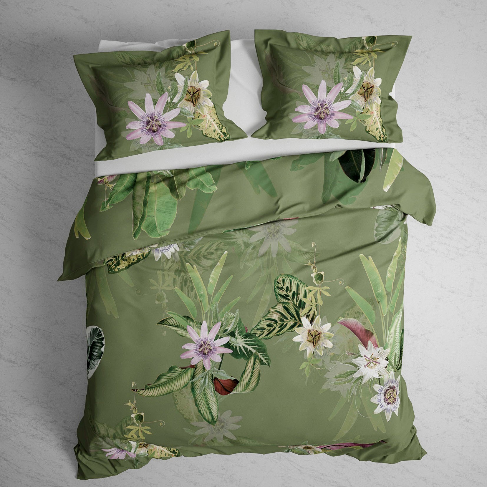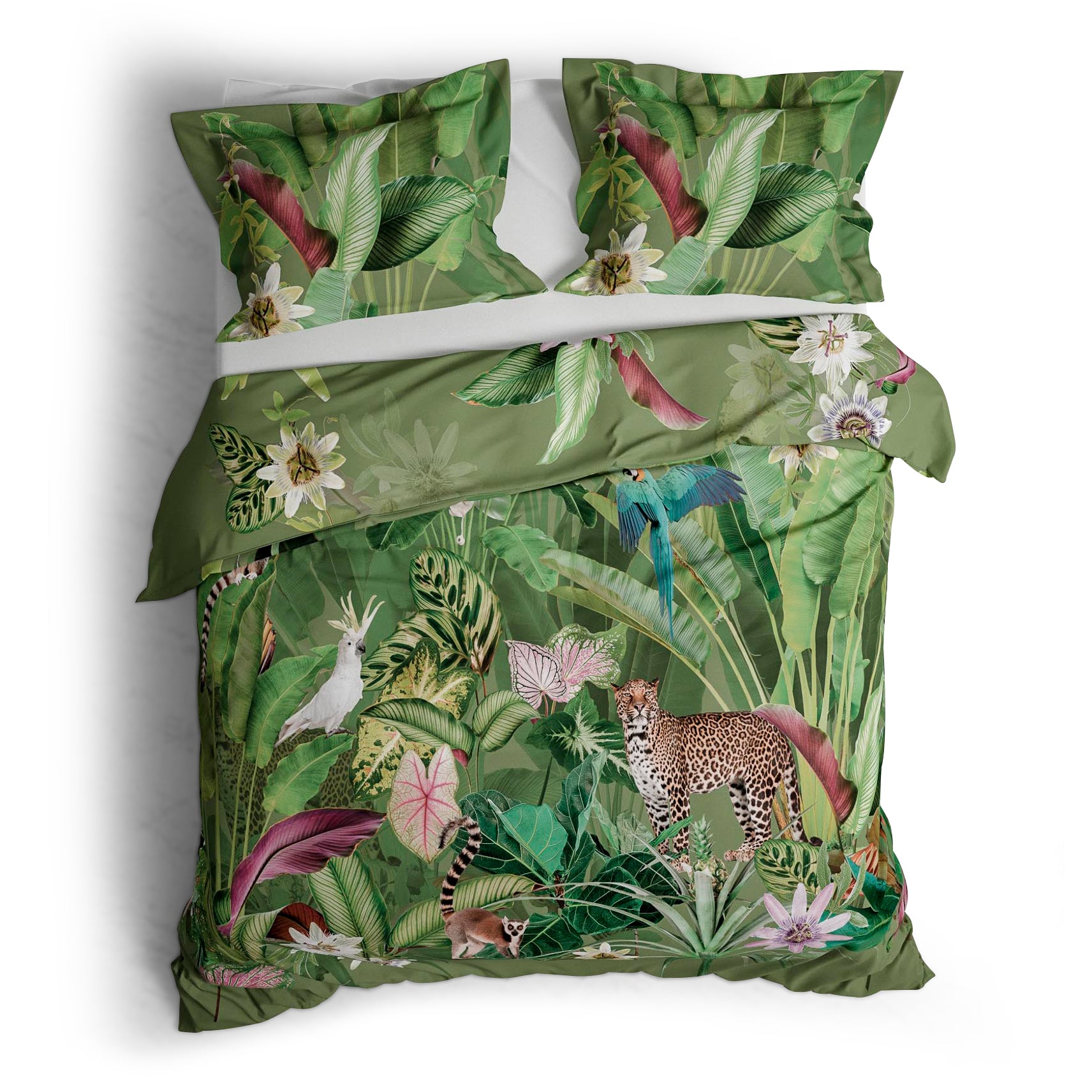Dit prachtige dubbelzijde dekbedovertrek luistert naar de naam Safan en is een prachtig tropisch plaatje voor in de slaapkamer. Met het groene dessin met bladeren, panter, maki's en papegaaien waan je je als in een echte jungle. Het trendy dekbed van Heckett & Lane is een toevoeging aan jouw interieur. De achterzijde heeft een ander dessin in dezelfde stijl. Beide kanten zijn zo mooi dat het bijna zonde is om maar een kant te laten zien. Het overtrek voelt heerlijk zacht aan en valt soepel om het lichaam, ga heerlijk wegdromen onder dit fantastische overtrek. Dit mooie dekbedovertrek is gemaakt van 100% katoen- satijn, daardoor is het koel in de zomer, warm in de winter en heeft het ook nog eens een luxe uitstraling. Het Safan dekbedovertrek heeft het GOTS (Global Organic Textile Standard) keurmerk en een dubbele doorlopende instopstrook.