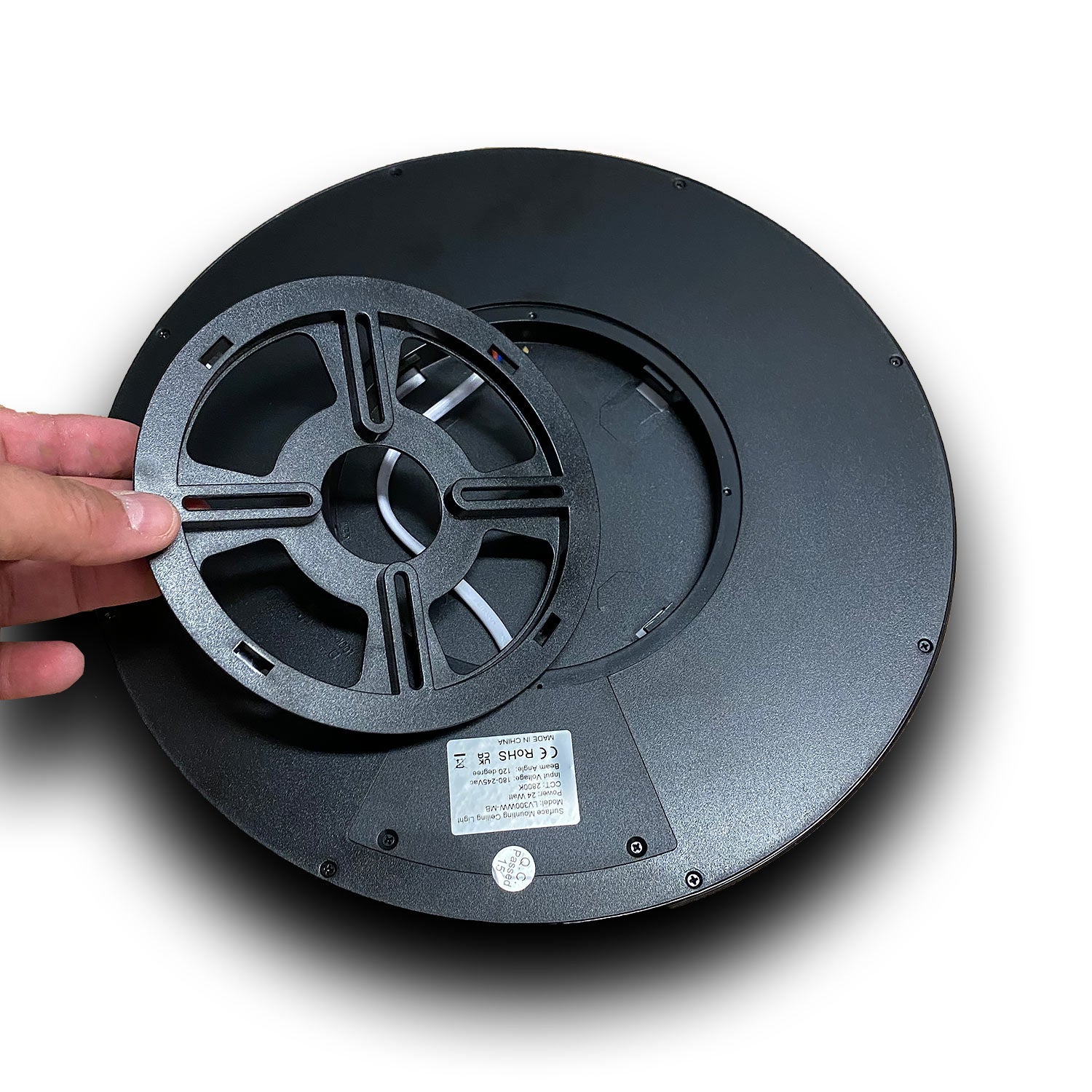De doorsnede is 30,5 cm en de hoogte is slechts 2,5 cm. Kleur: wit kunststof met een zwarte rand.