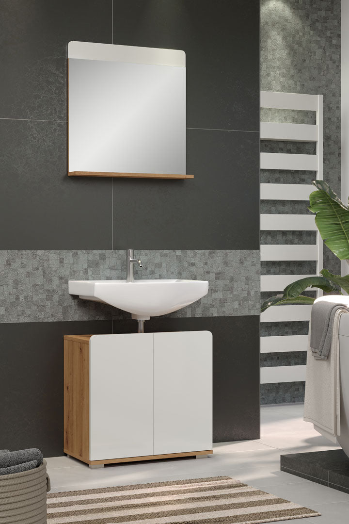 - 1 x Ciara badkamer met spiegel artisanaal eiken decor, wit hoogglans.