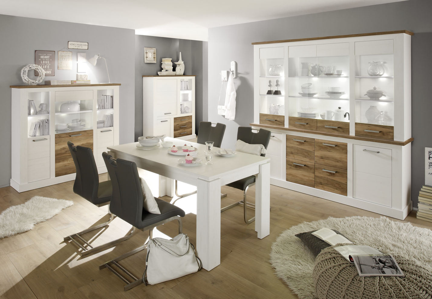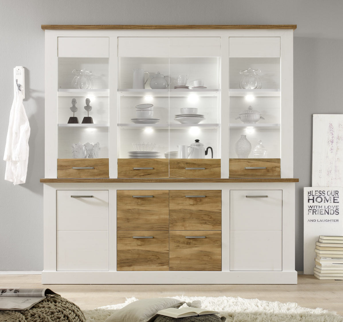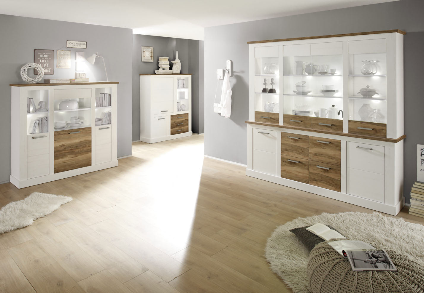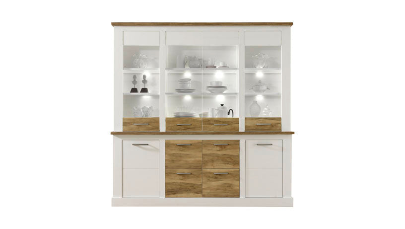 Hioshop Torono vitrinekast opstelling, wit structuur, walnoot decor.