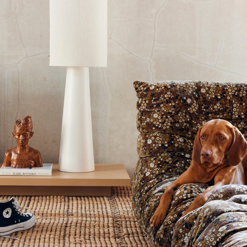 - Met een basis van keramiek en een kap van linnen
