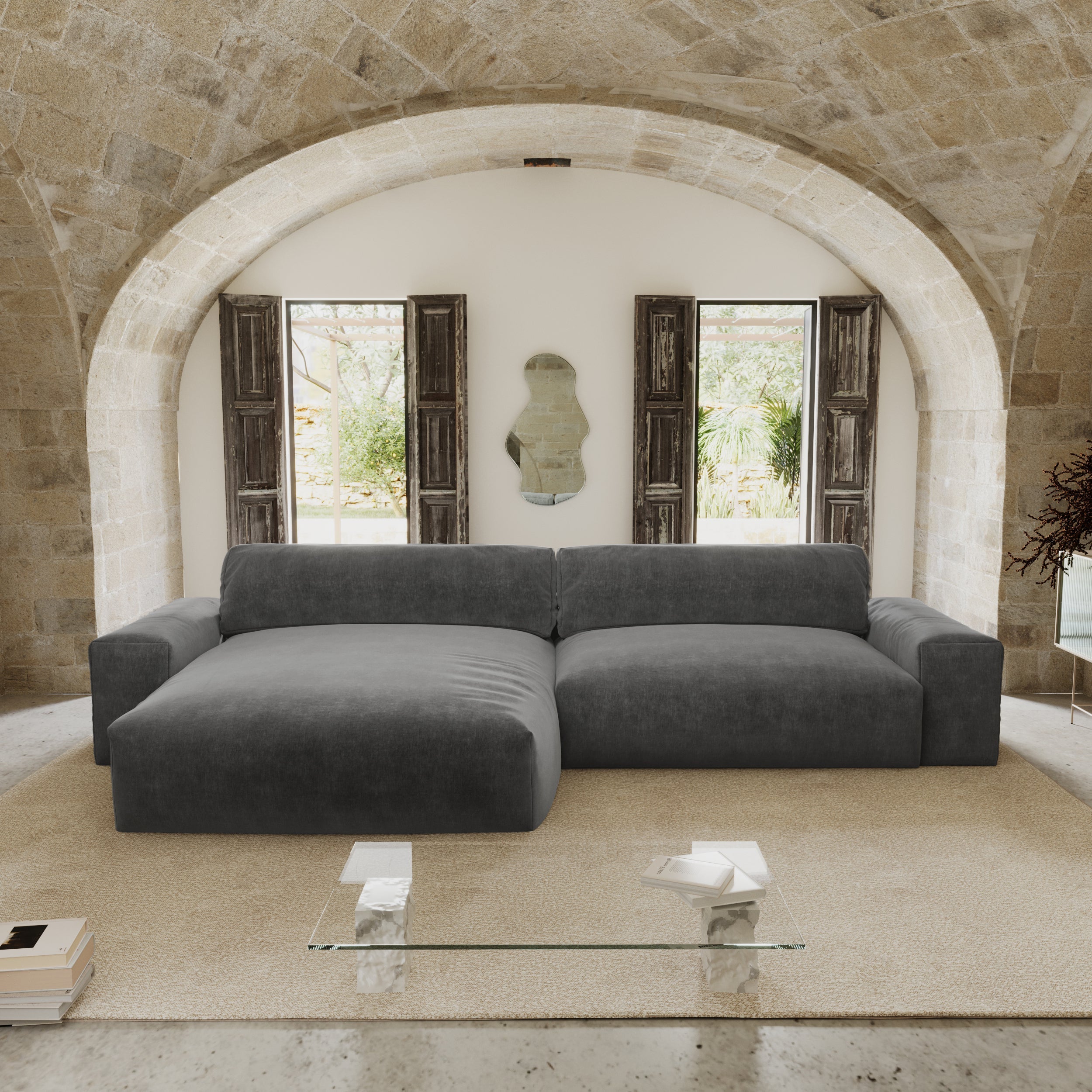 Hoekbank links, 4 zitplaatsen, grafietgrijs fluweel, 310 cm