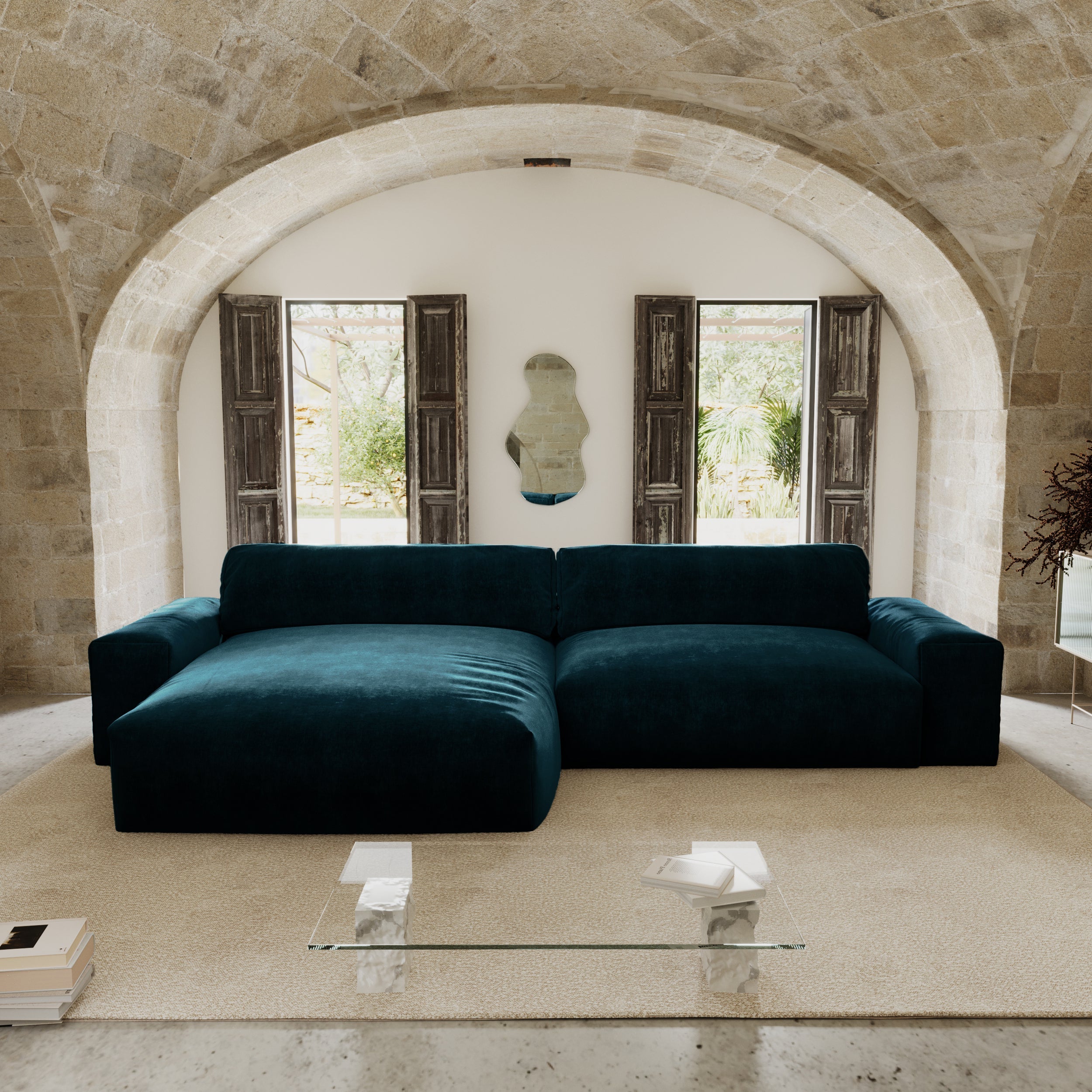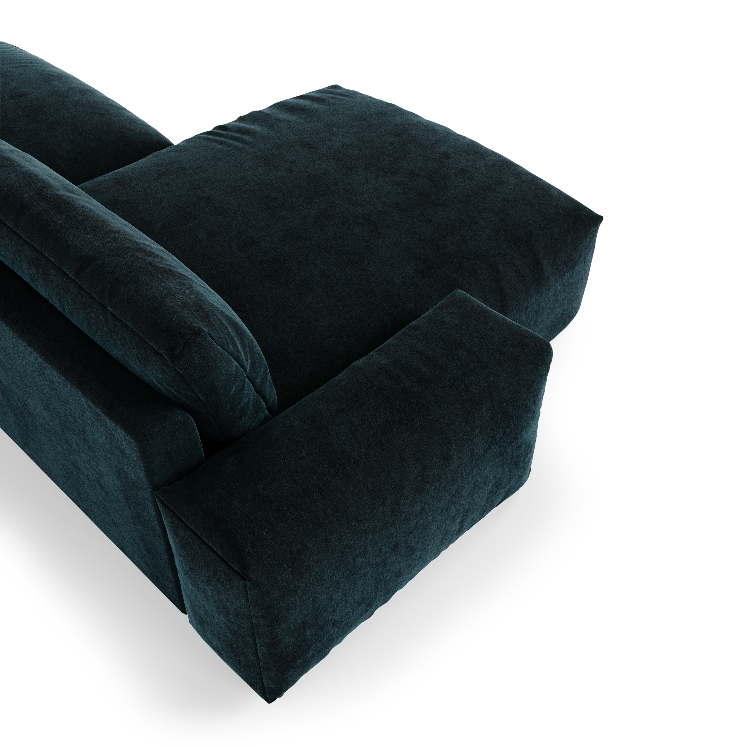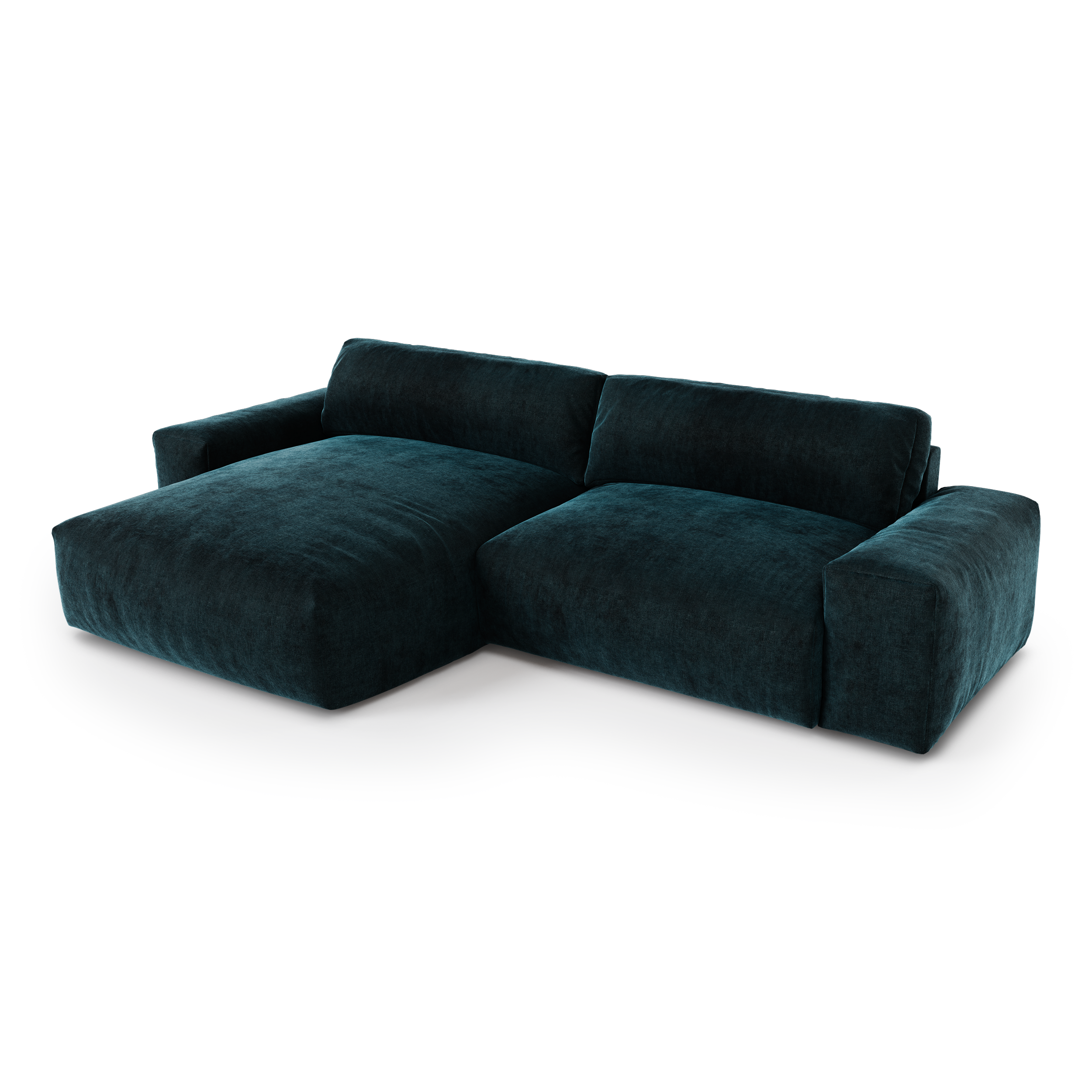 Hoekbank links in pauwblauw fluweel, 310 cm