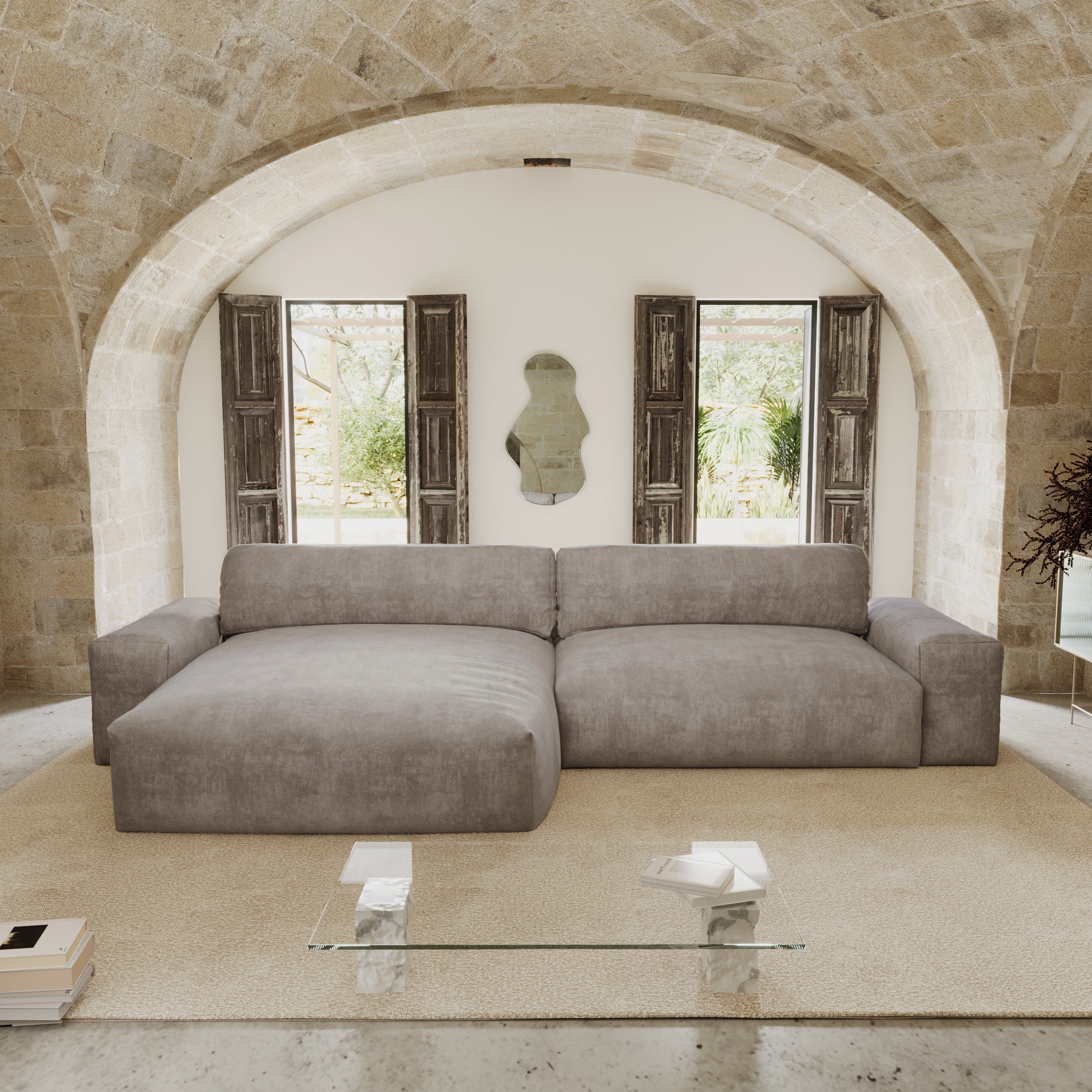 Hoekbank links in taupekleurig fluweel, 310 cm